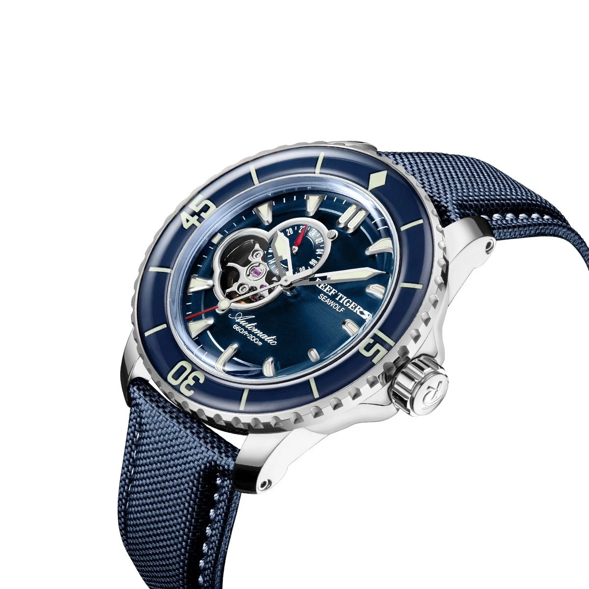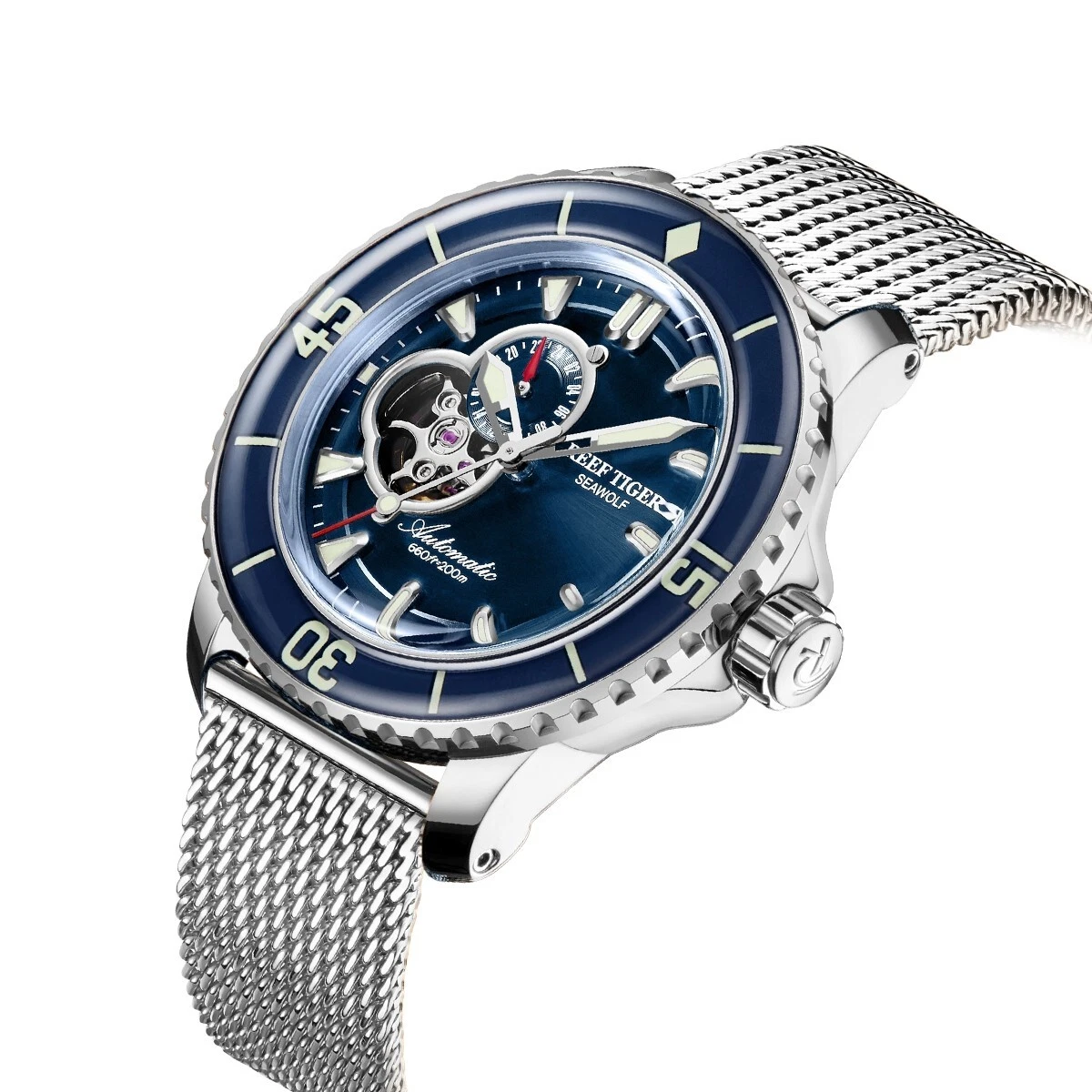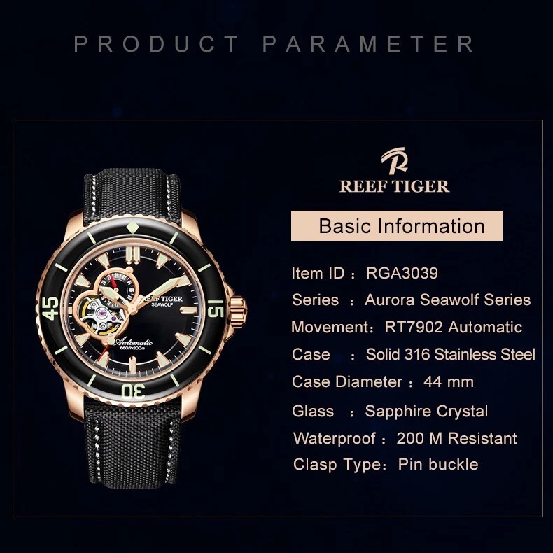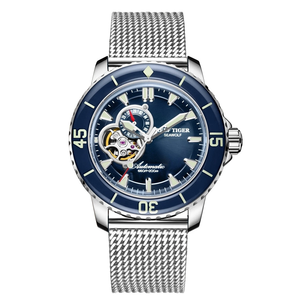 Reef Tiger Mens LuxuryWatches Skeleton Automatic Wristwatch 20Bar Sapphire Bezel