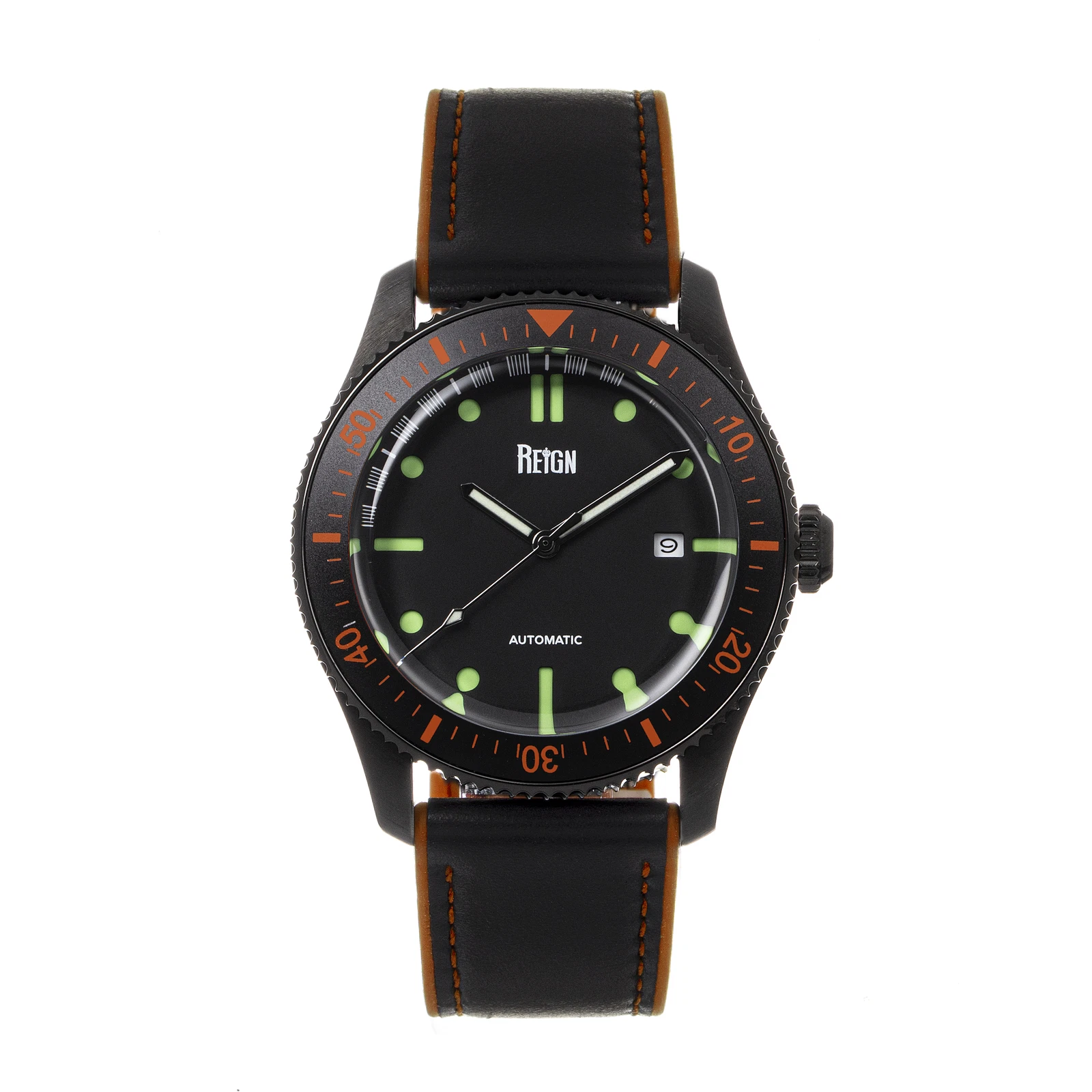 Reign Elijah Automatic Rubber Inlaid Leather-Band Watch W/Date - Black/Orange