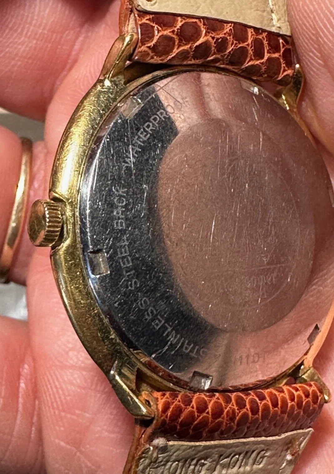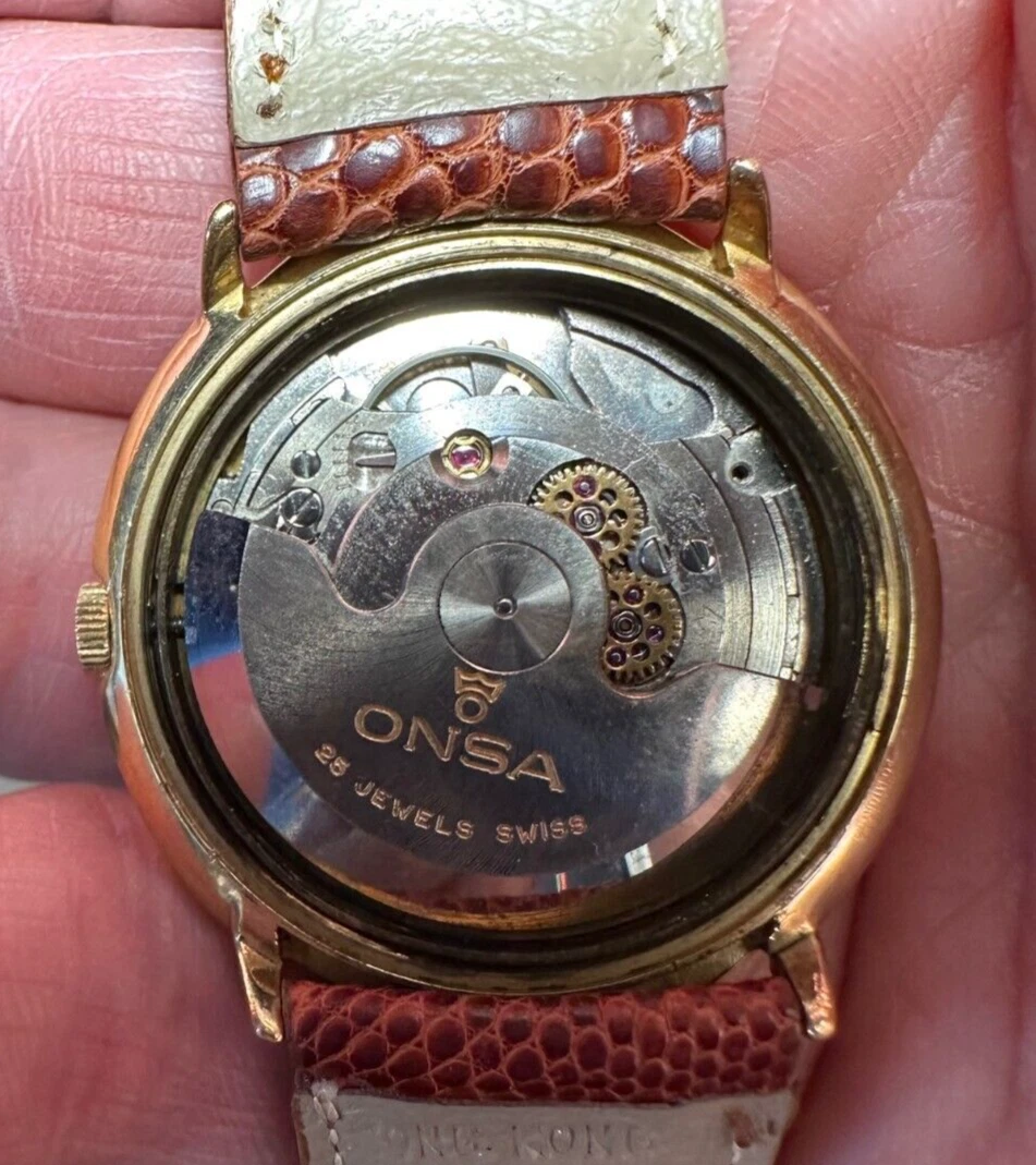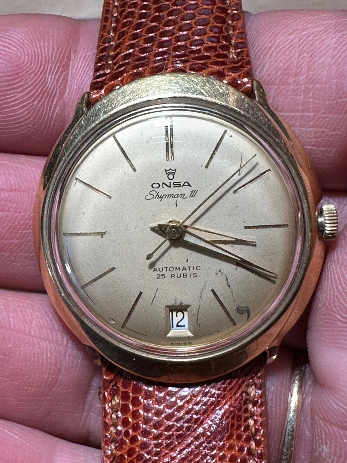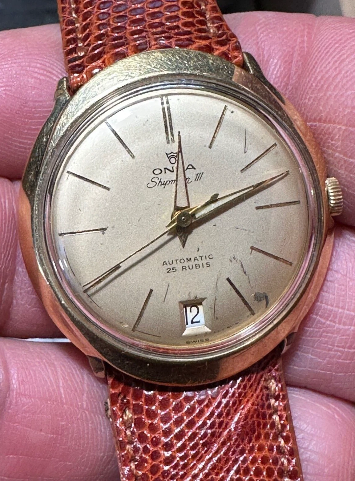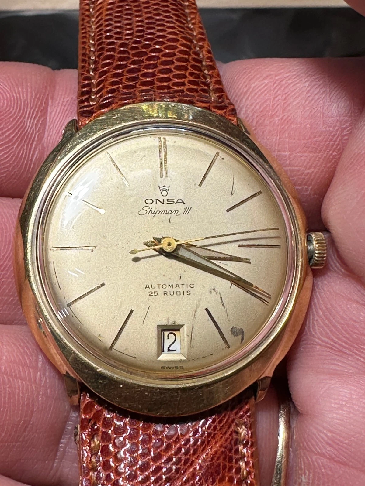 Onsa Shipman III Automatic Date 25 Jewels New Crystal & Leather Band Gold Plate