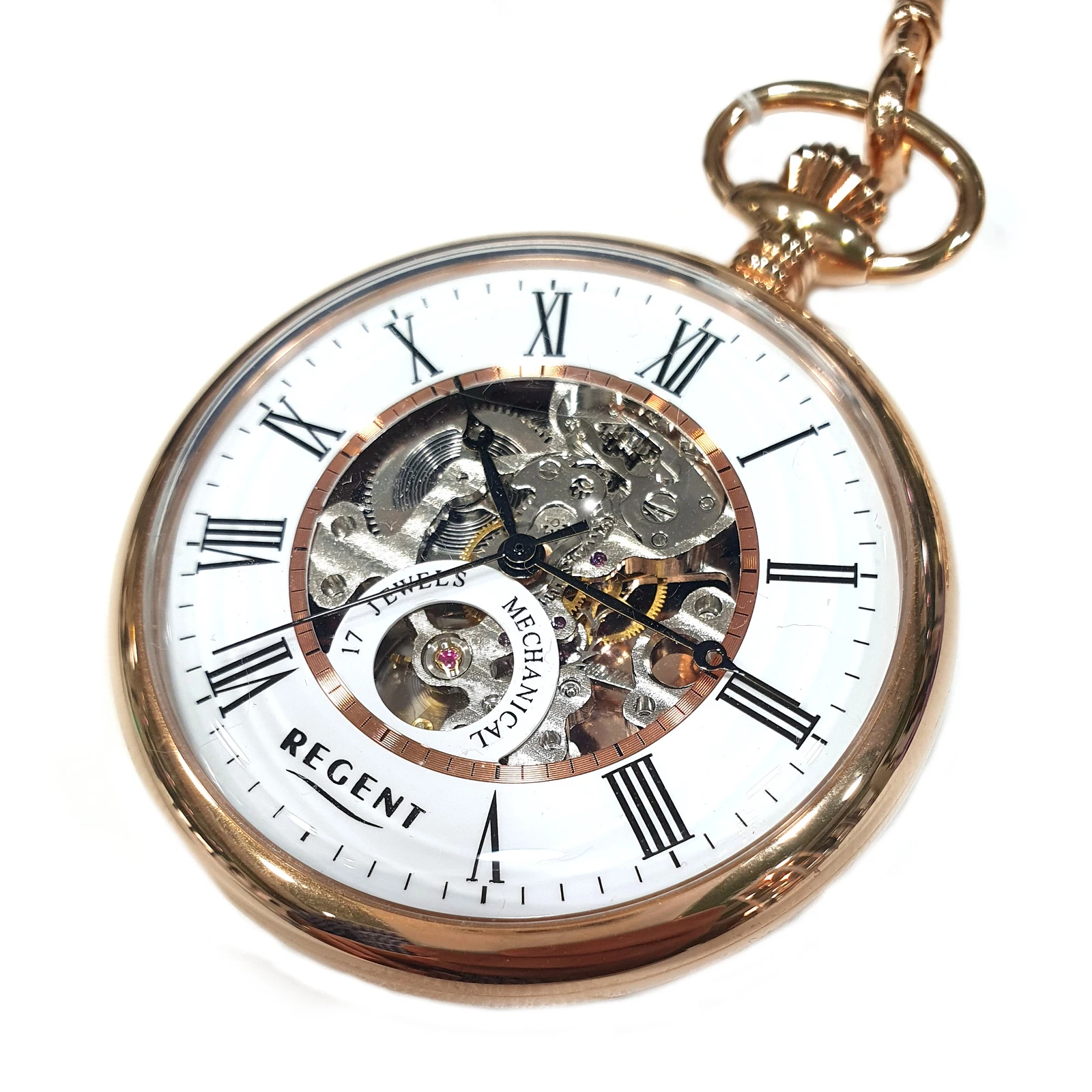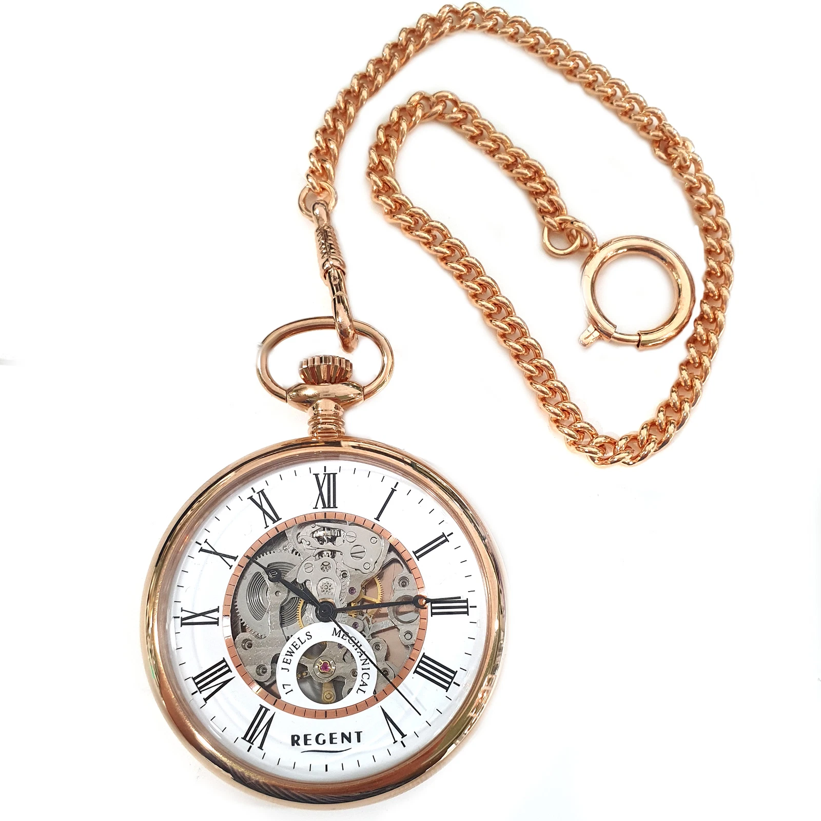 Regent 1041742 Pocket Watch Manual Wind Skeleton with Chain Rose Gold