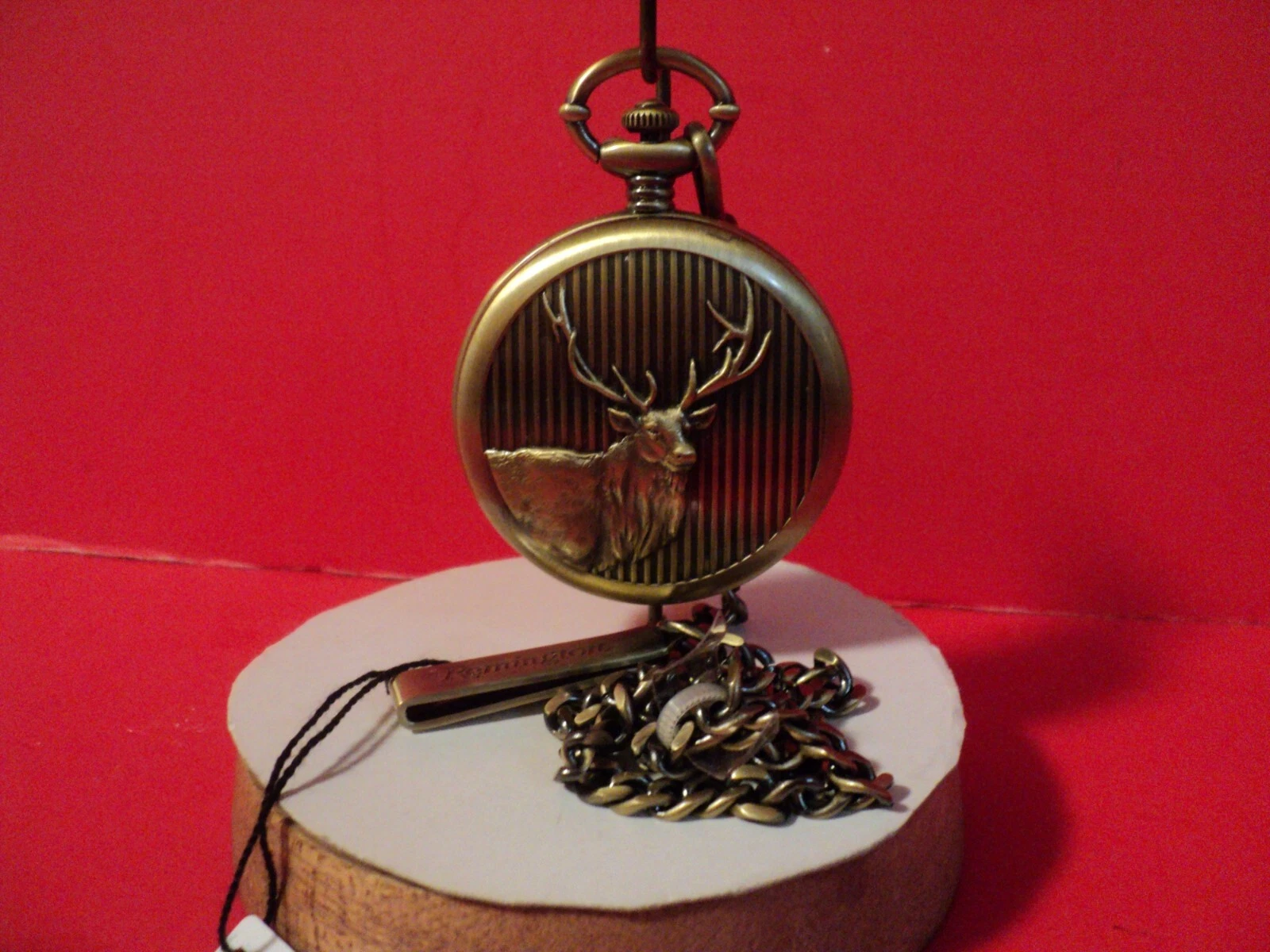 Remington pocket watch  bronze tone green face/ battery /w chain ELK ON lid