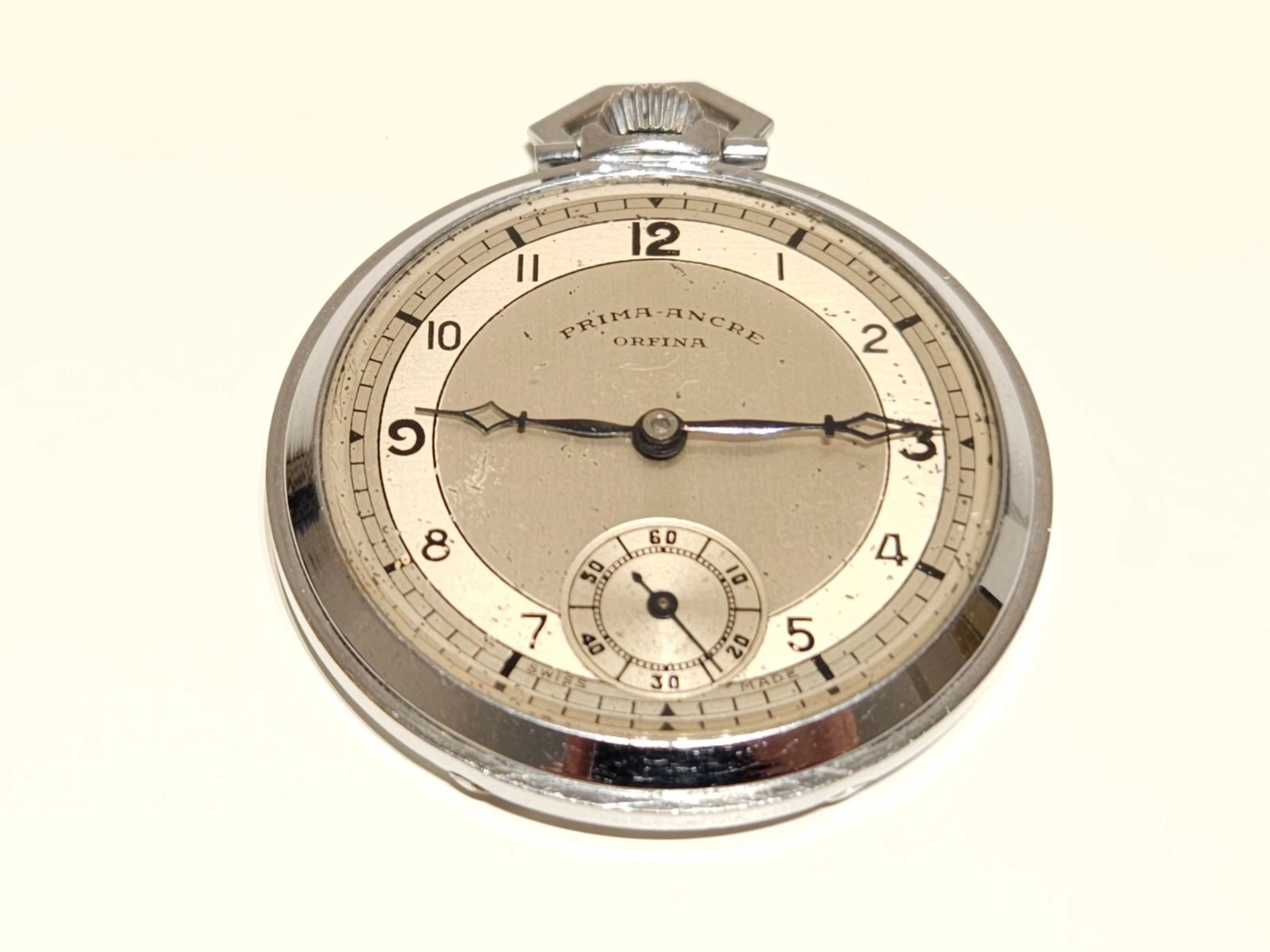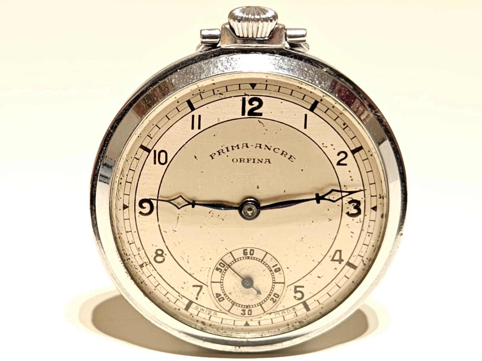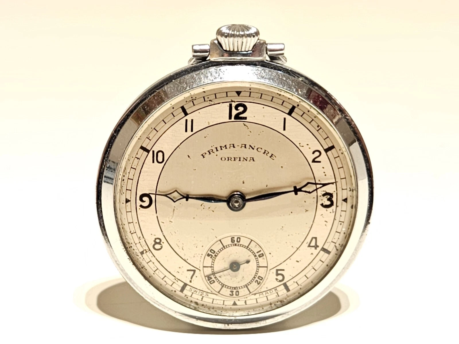 VINTAGE WW2 ERA PRIZE MEN'S SWISS OPEN FACE POCKET WATCH "ORFINA" PRIMA ANCRE