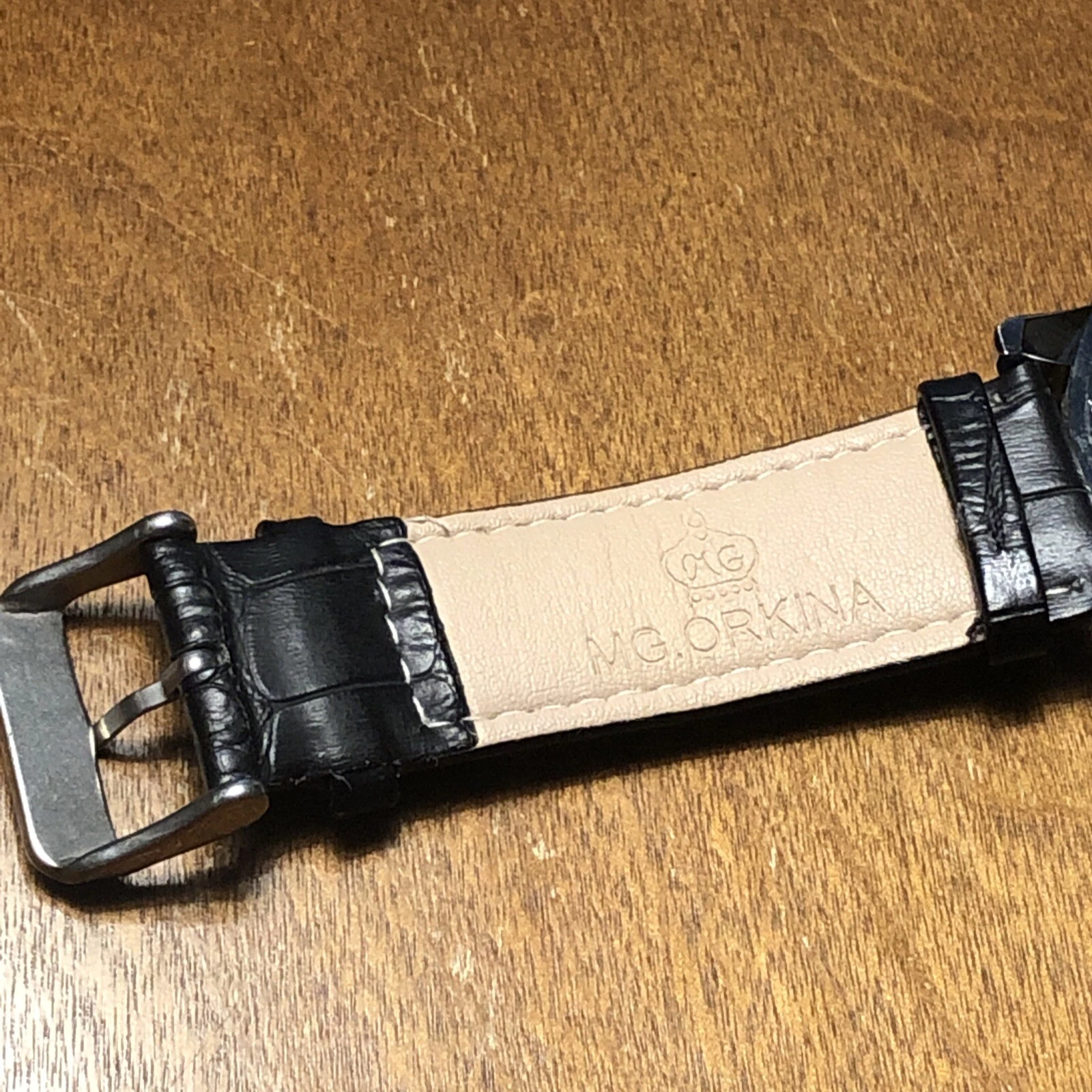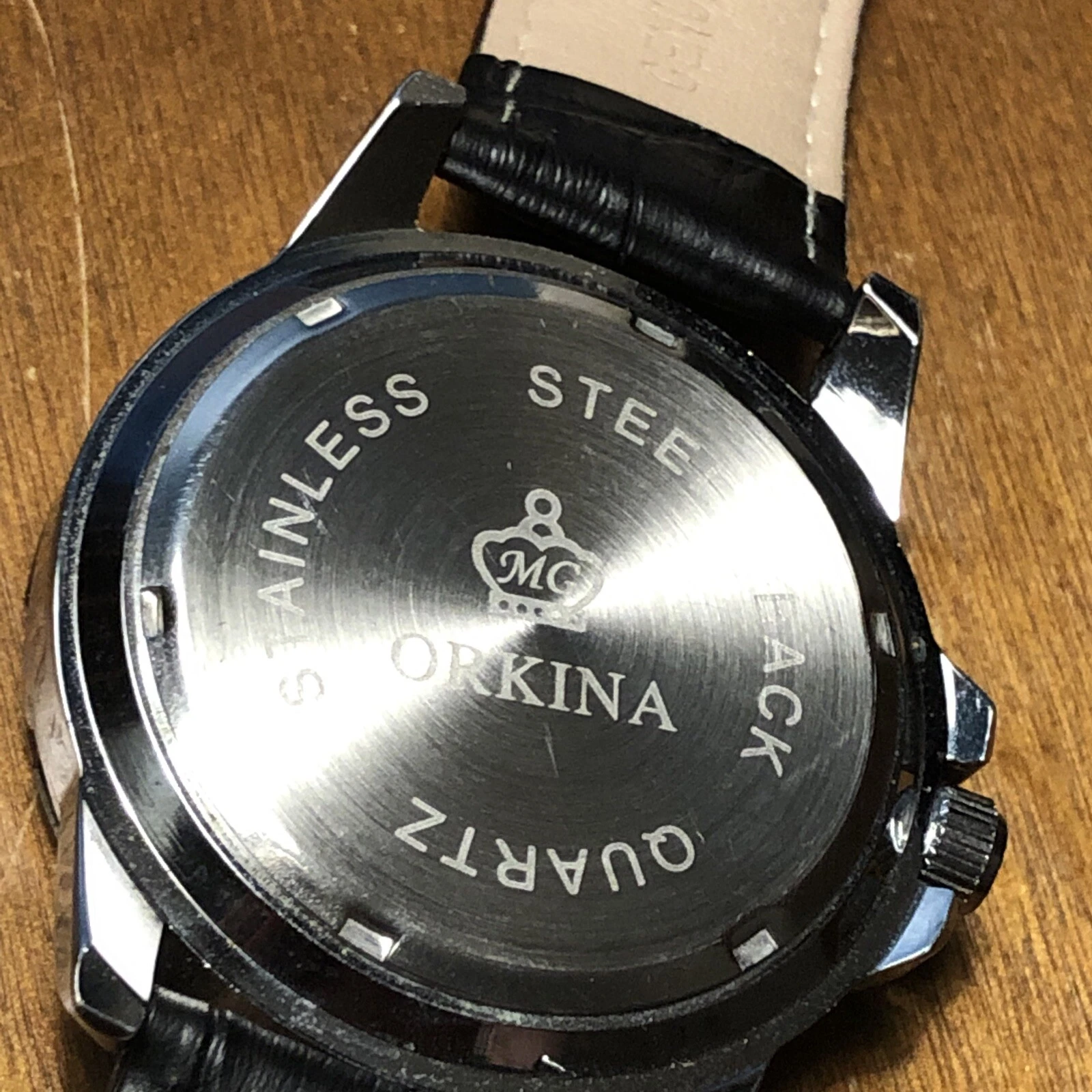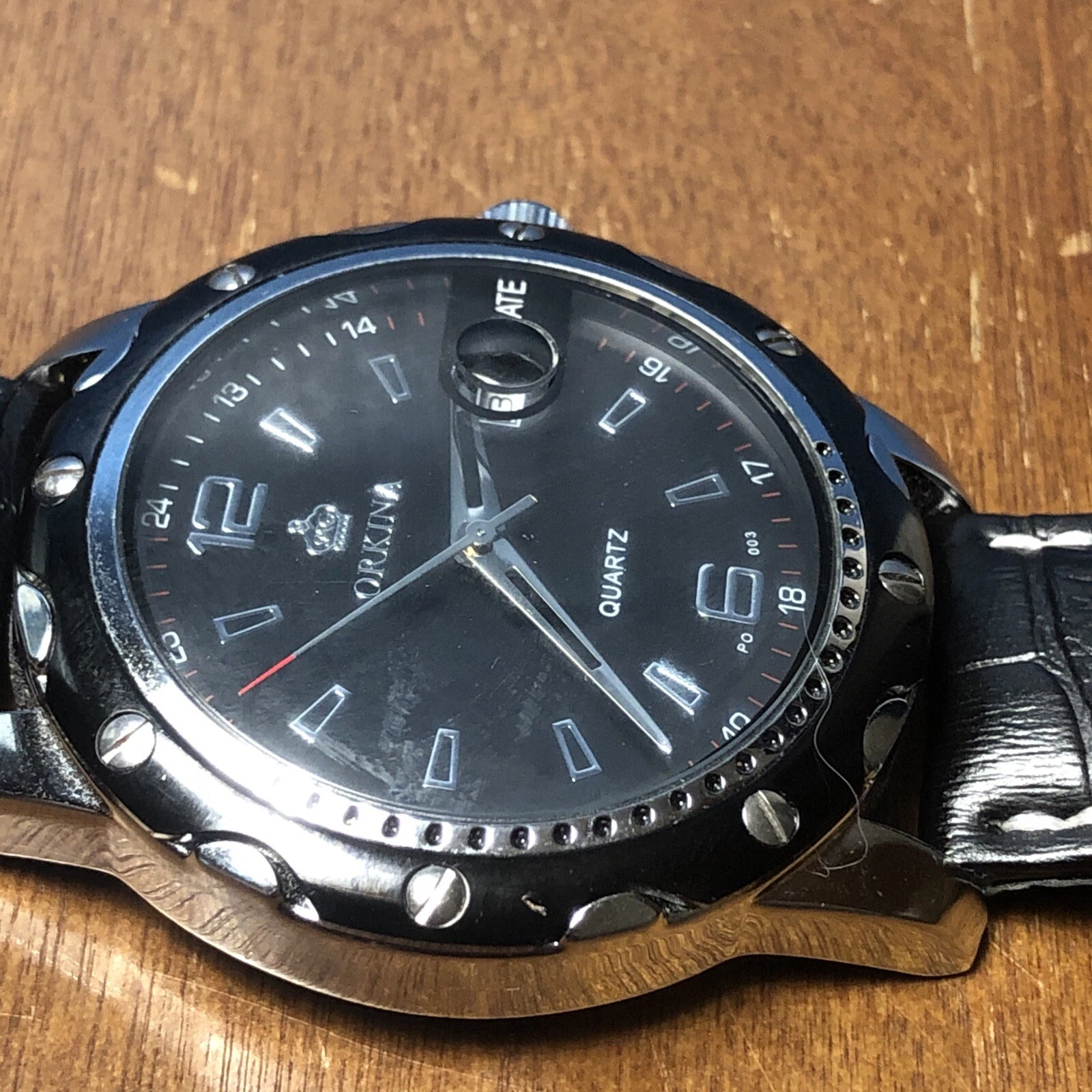 ORKINA Steel Mens Watch w/ Date - Black GENUINE LEATHER Band AS IS Needs Battery