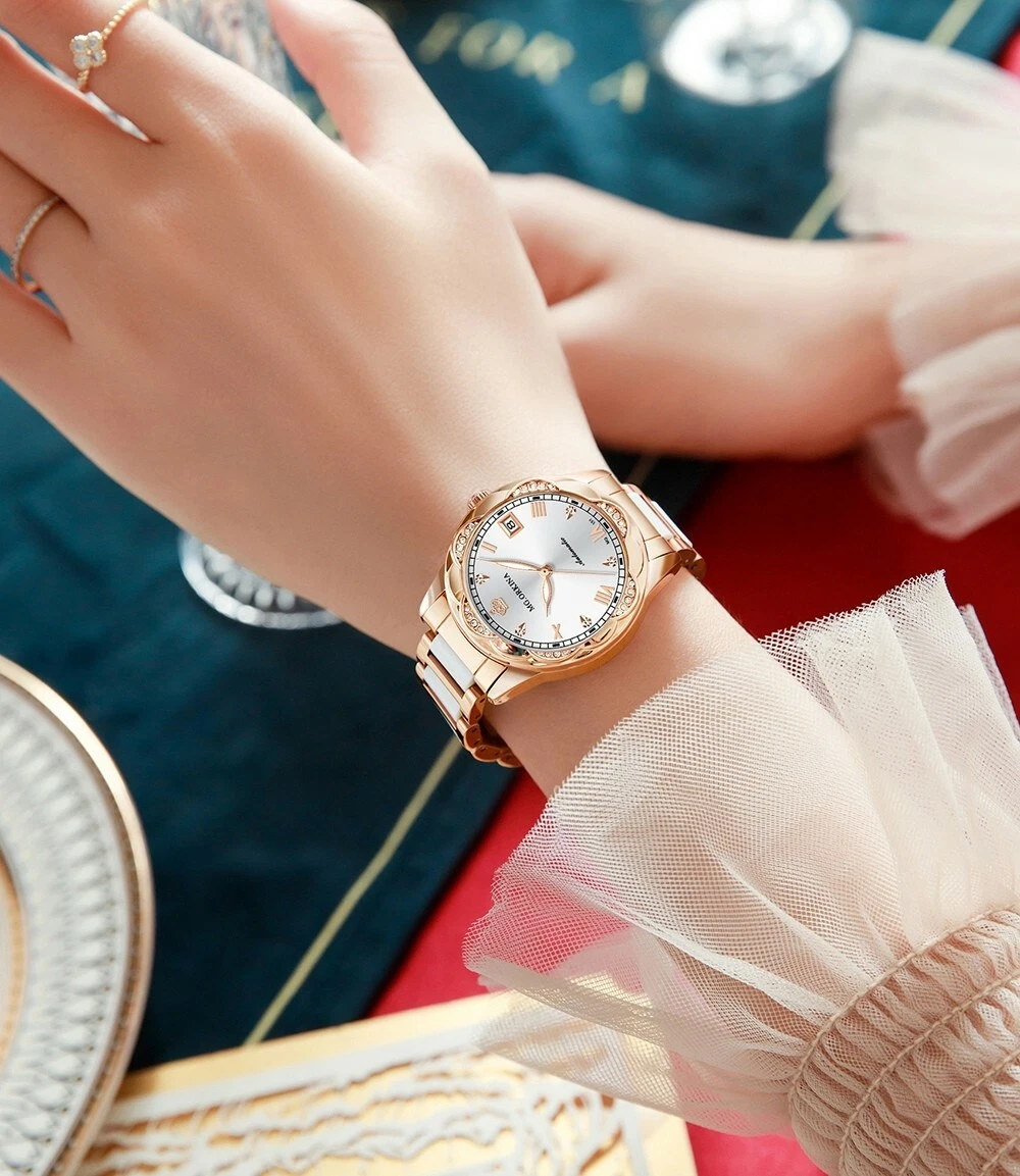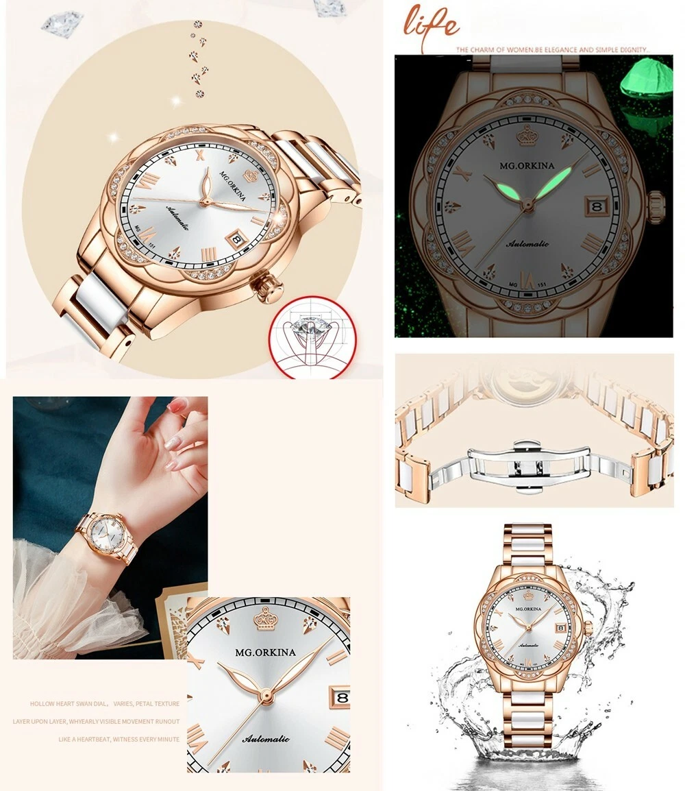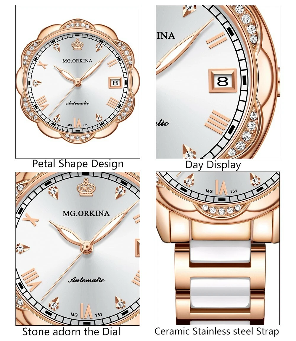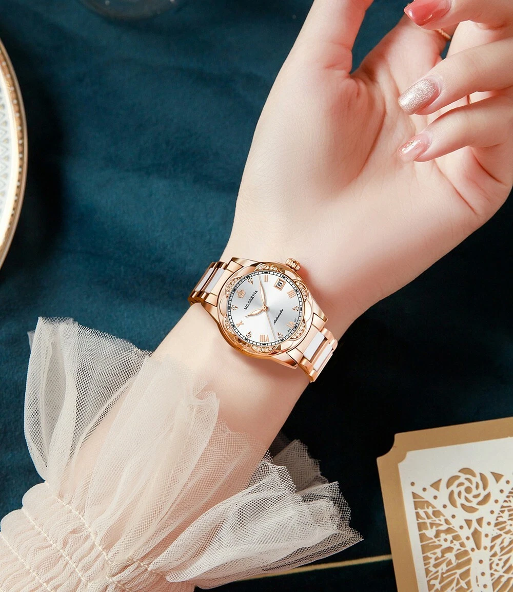New Women Mechanical AutomaticDay Crystal Petal Shape Ceramic Wristwatches