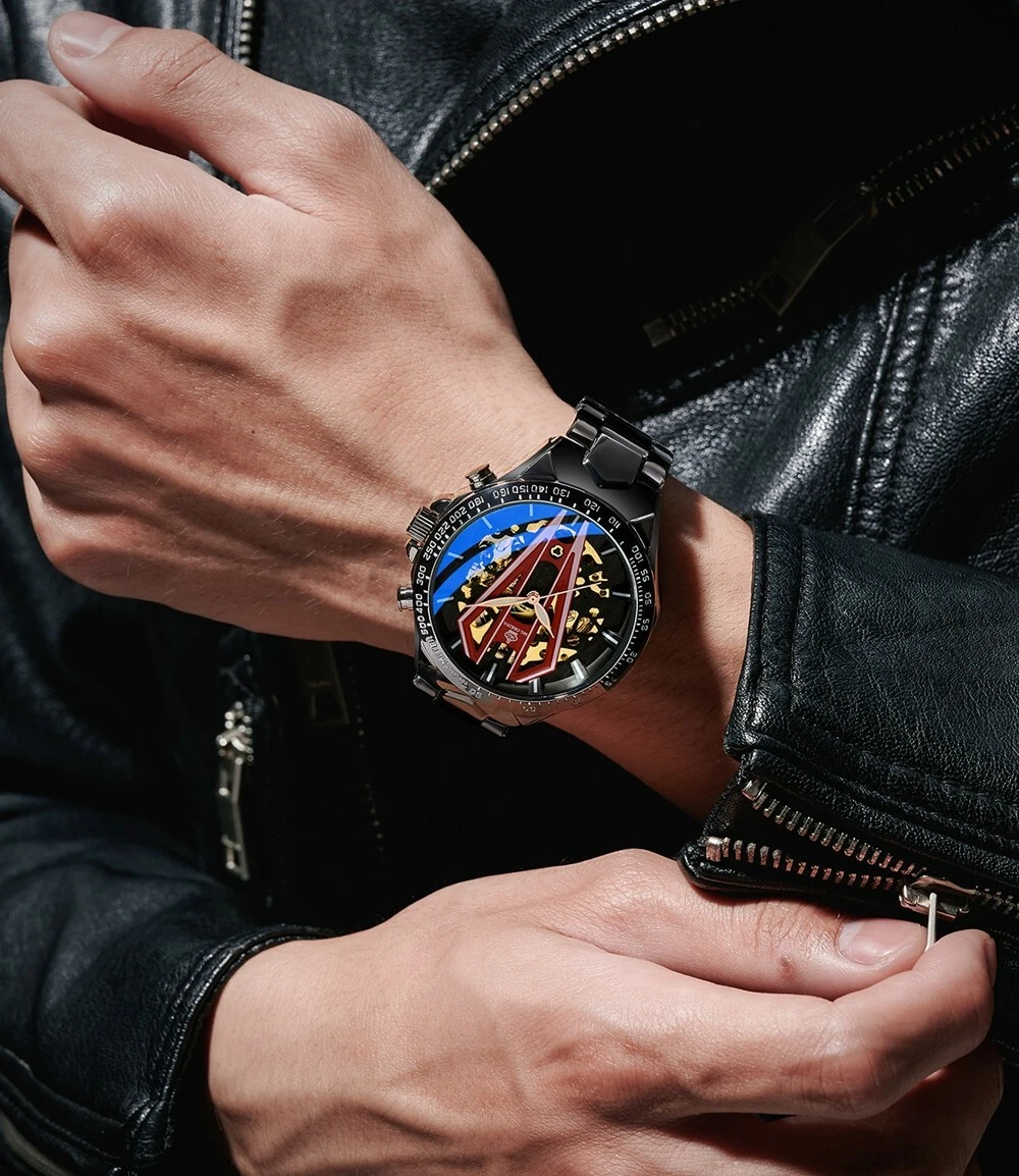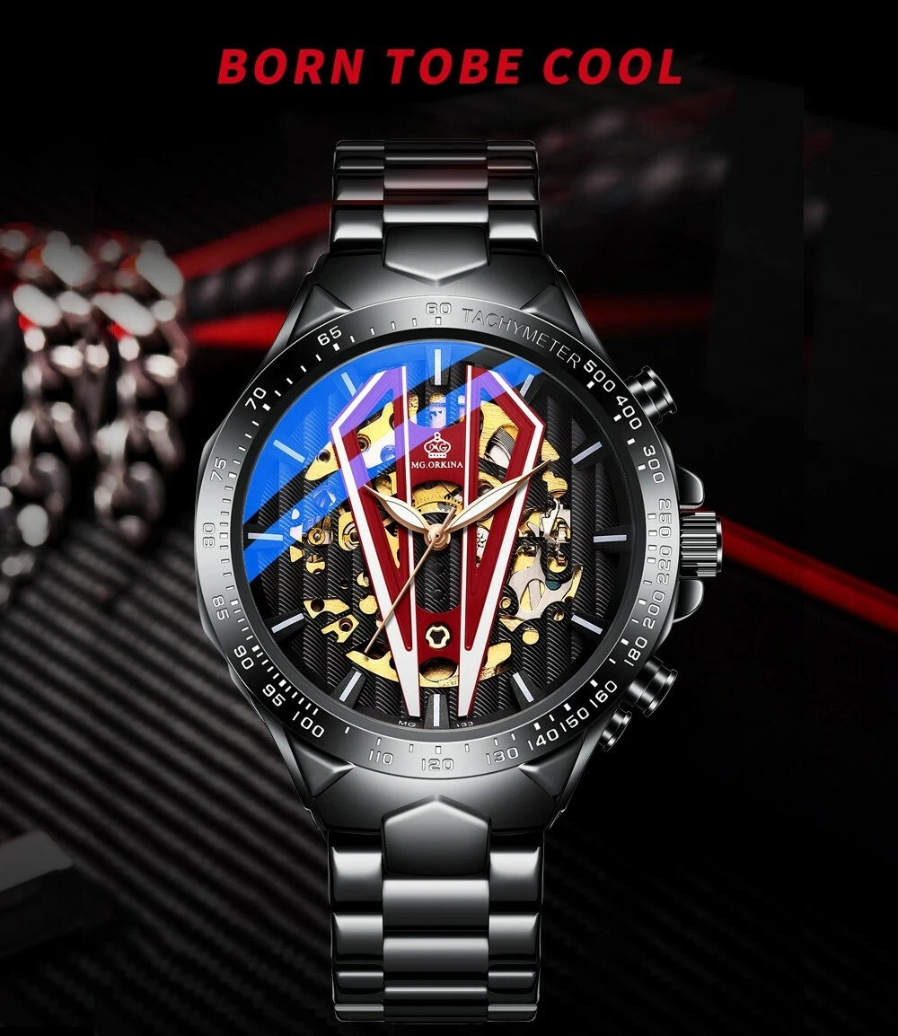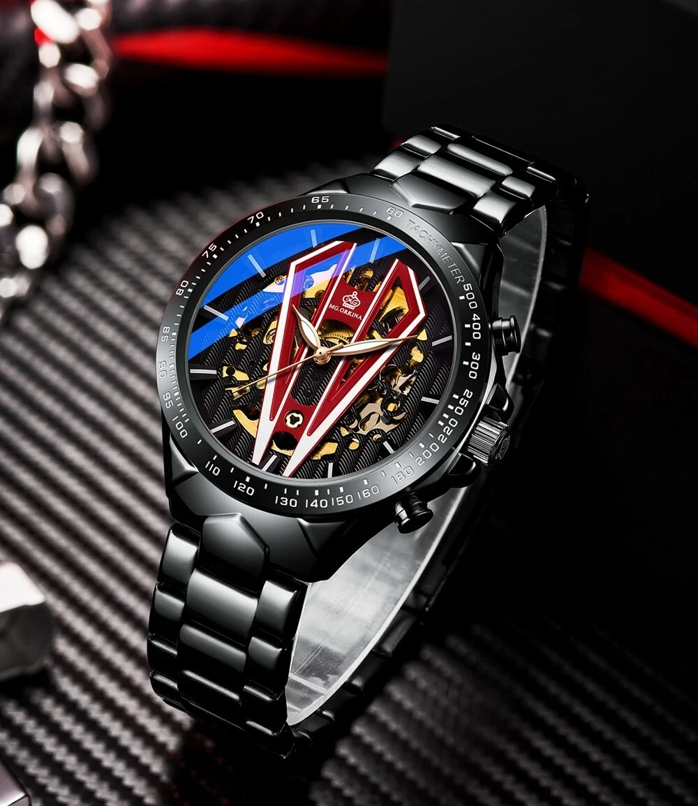 New Arrivals Men's Self-wind Automatic Skeleton Mechanical Watch Black Stainless