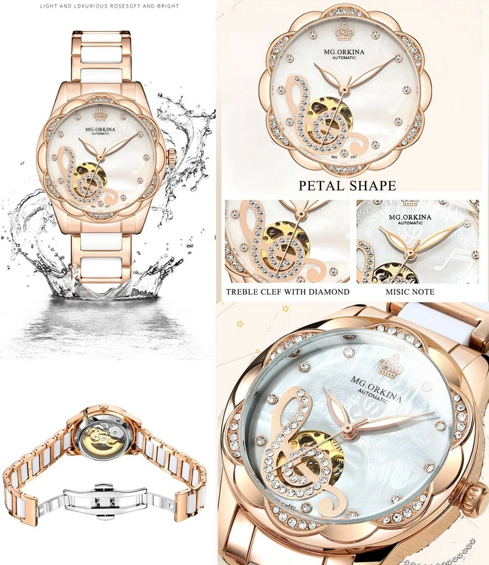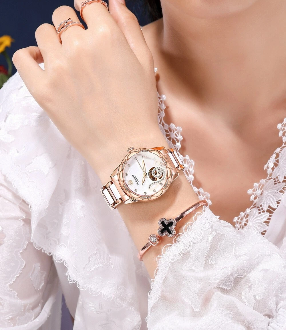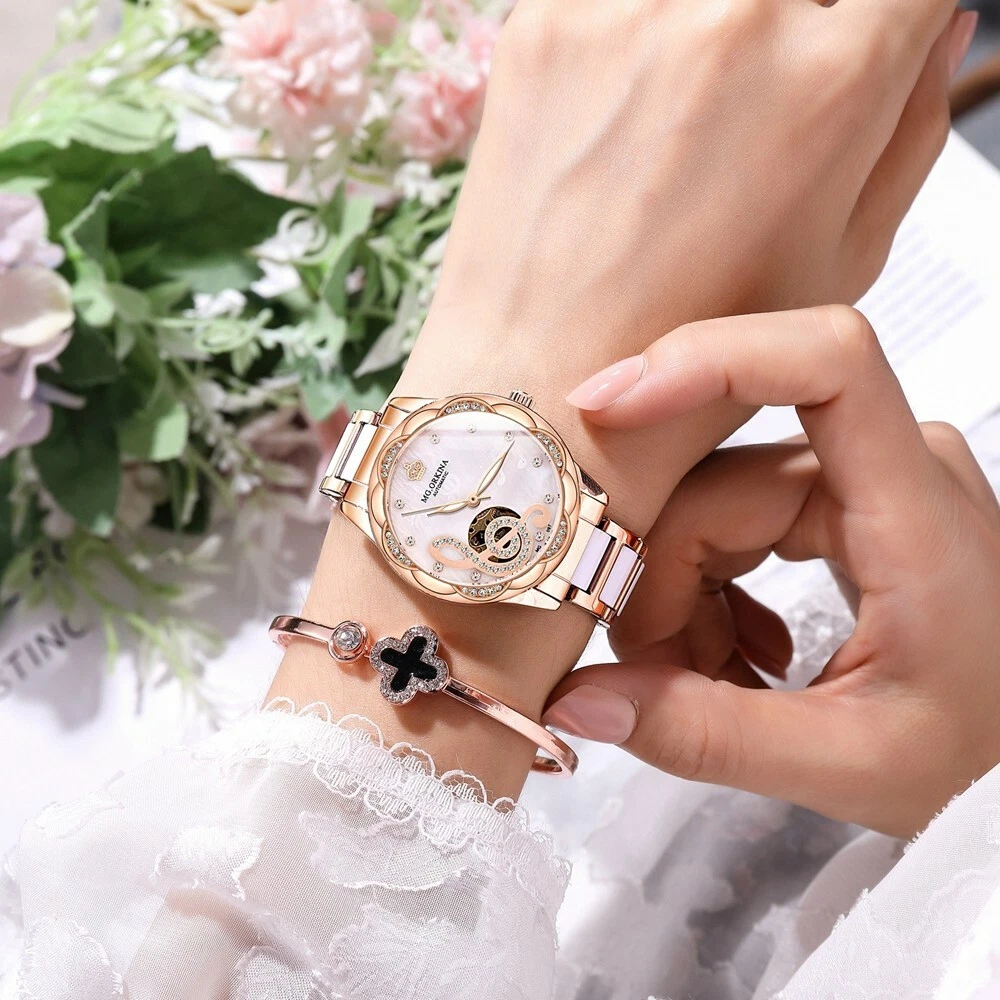 New Women Mechanical Wristwatches Hollow Crystal Petal Shape Automatic Watch