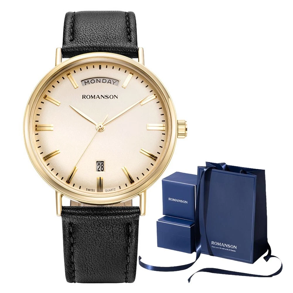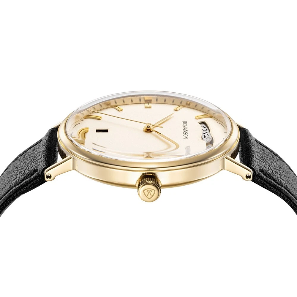 Romanson RWTLMM4BF006 Men's Classic Oval Watch, Gold Case, Leather Strap