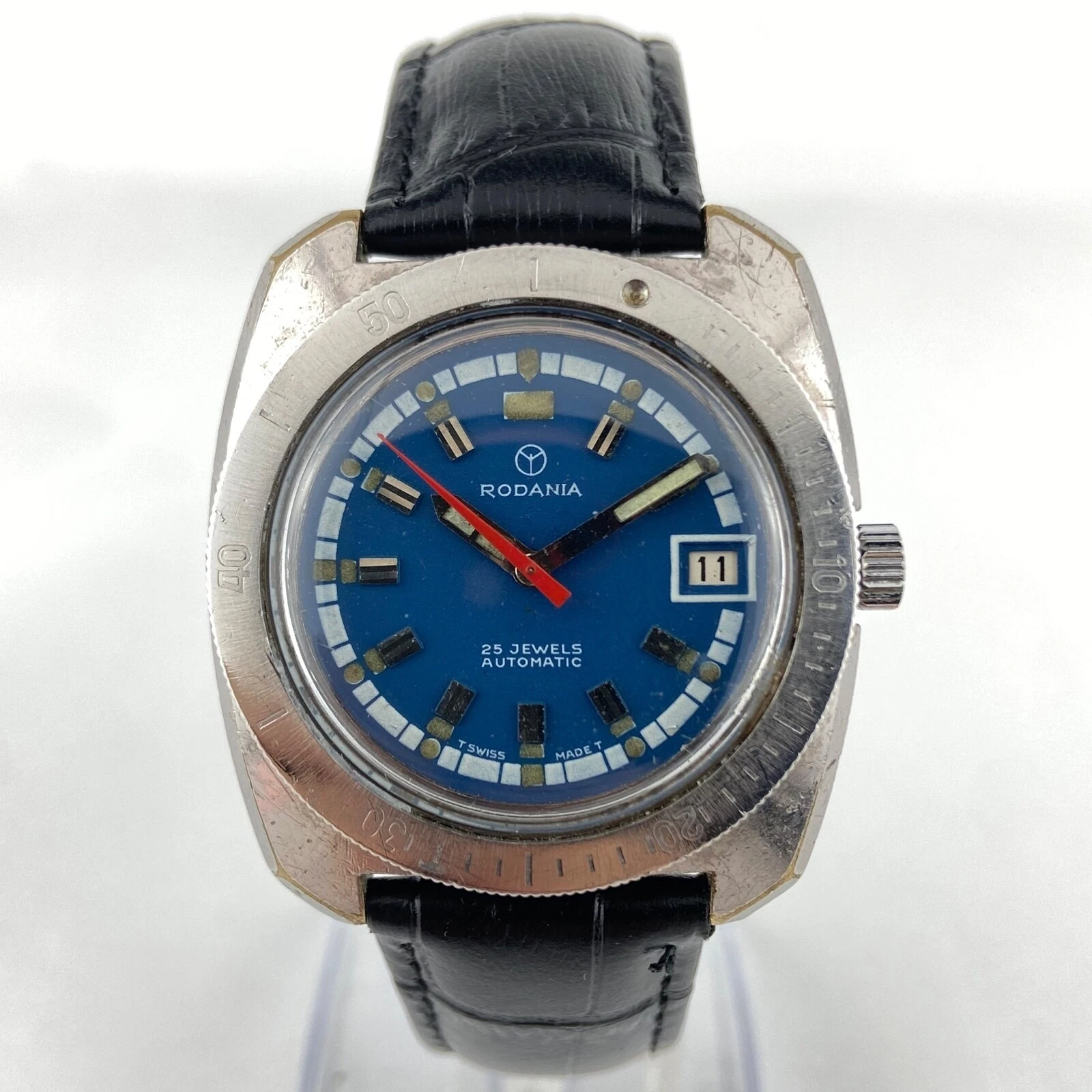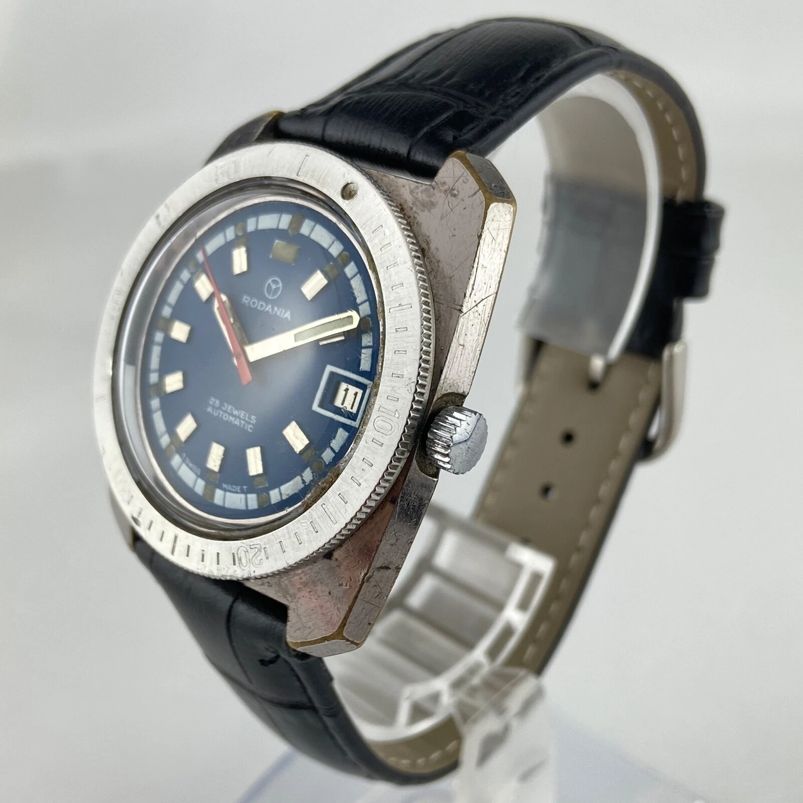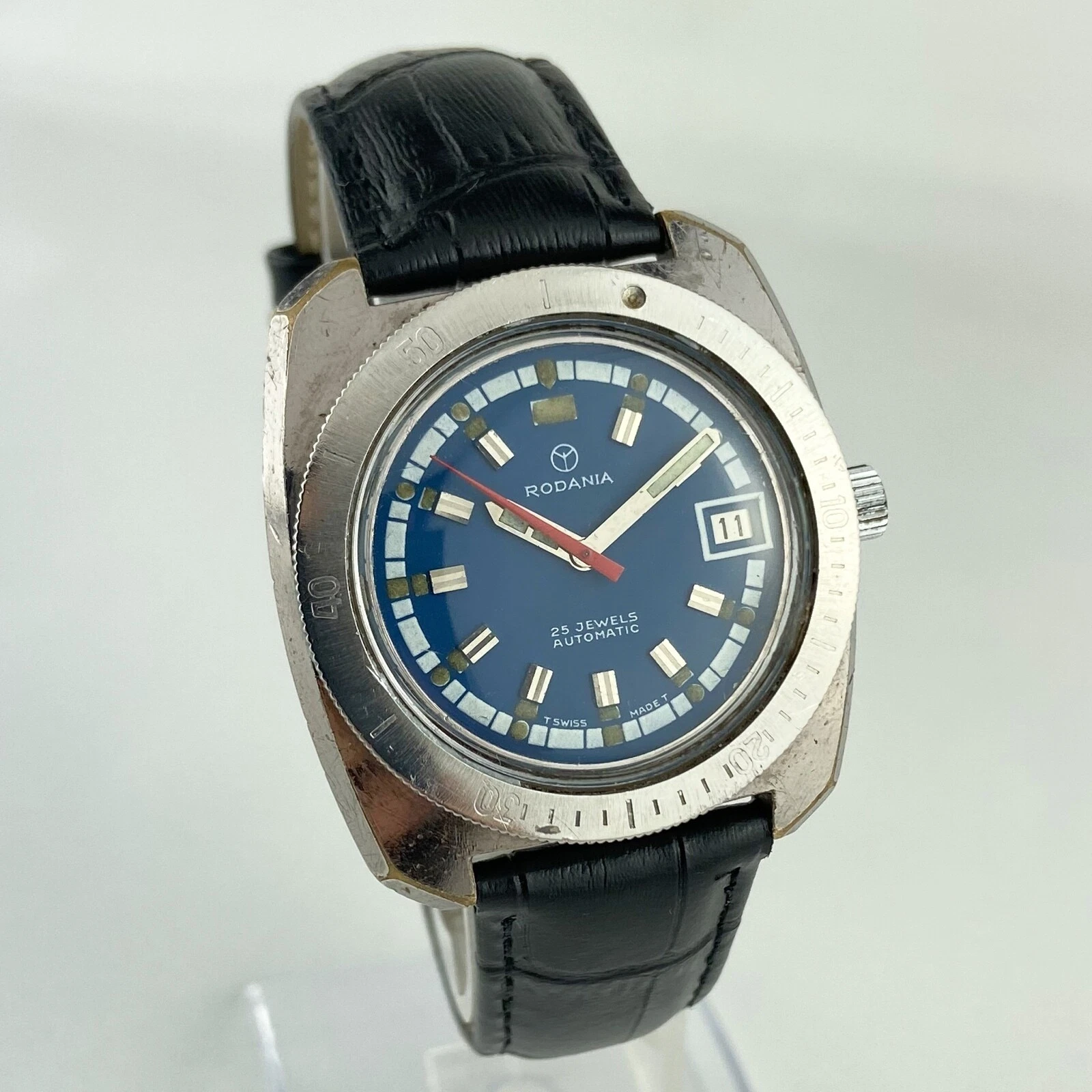 Vintage Rodania 25 Jewel Mens Automatic Wristwatch AS 1913 Steel Blue Dial Diver