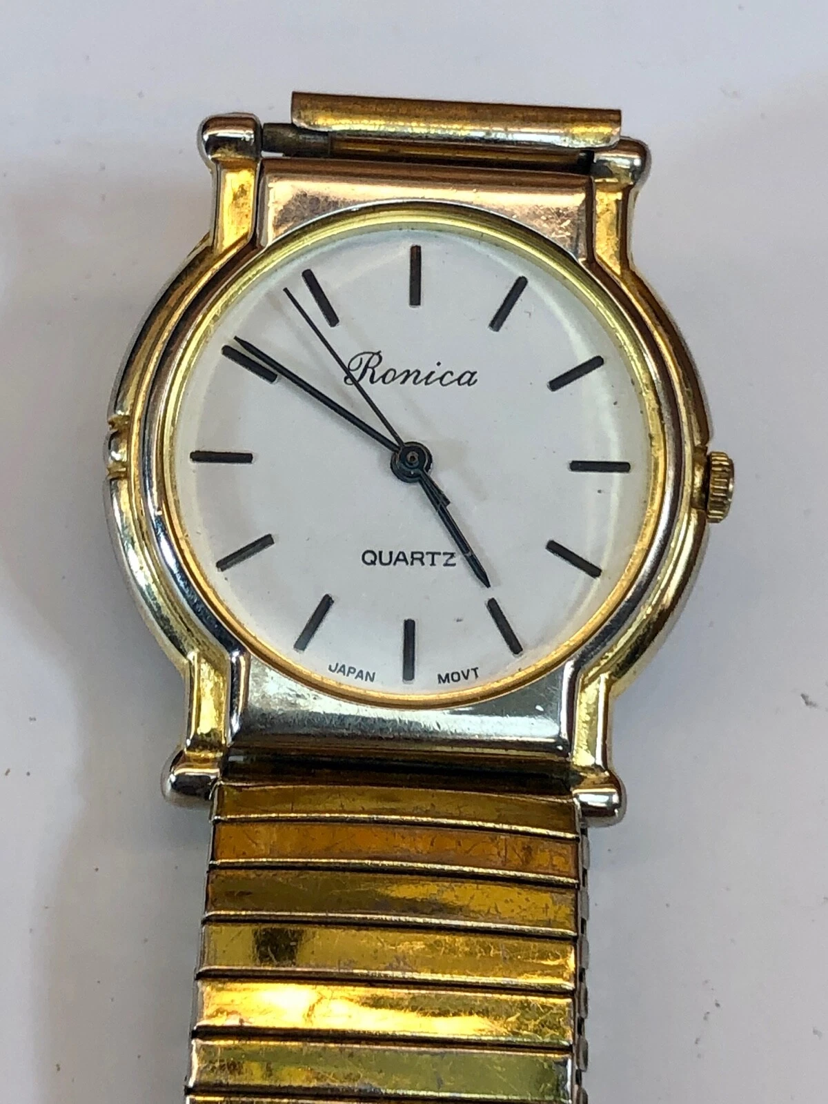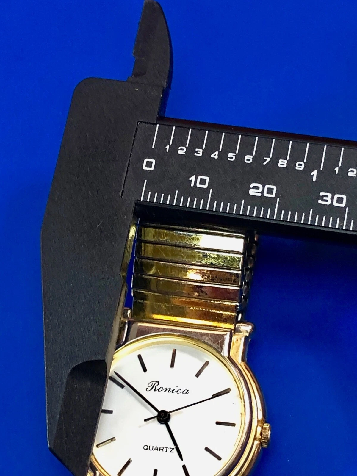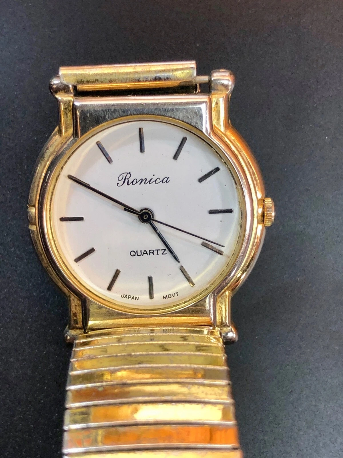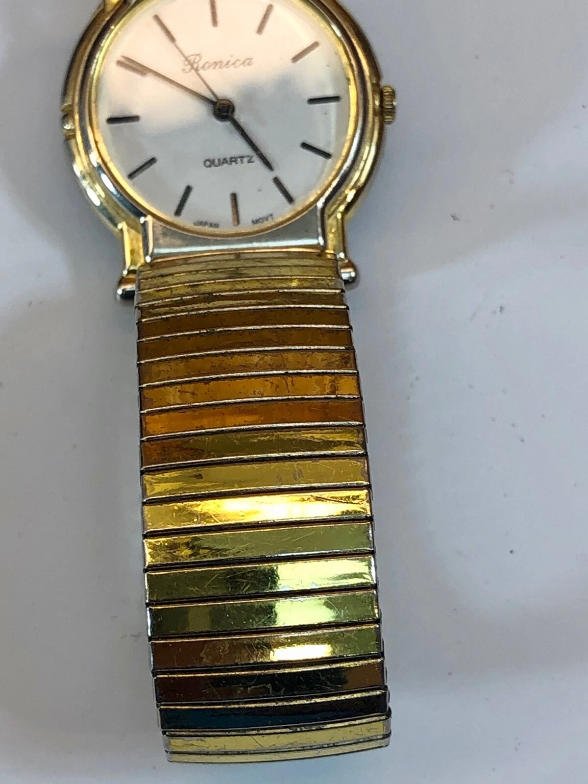 Ronica Quartz WIDE gold tone stretch band ladies dress watch - new battery