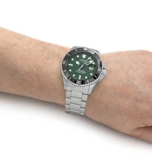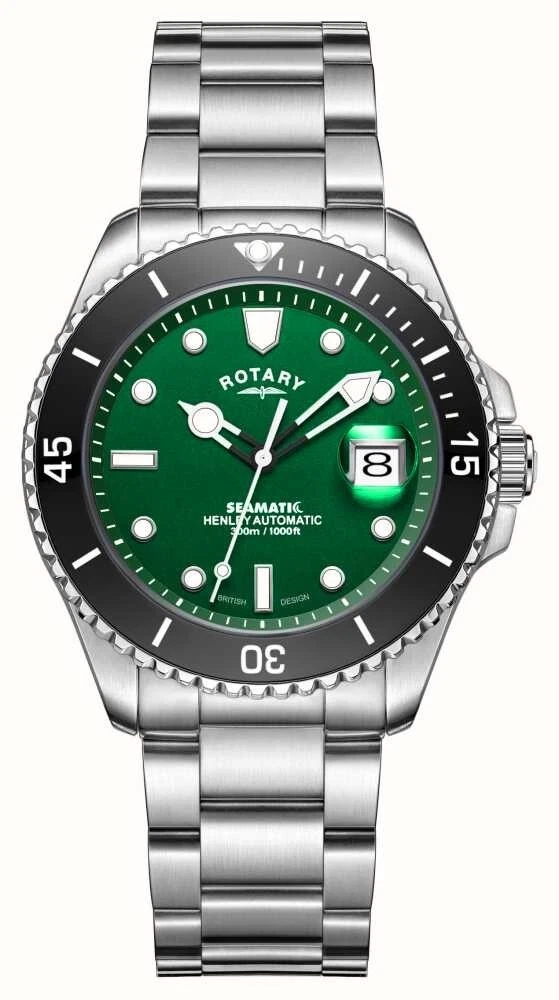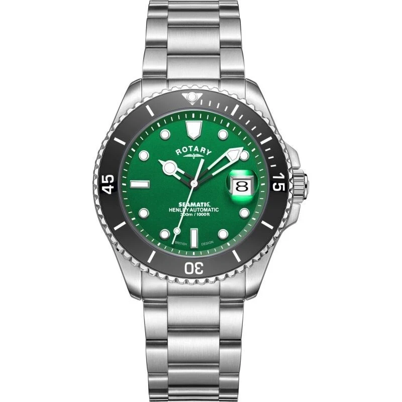 Rotary Henley Seamatic 42mm Silver Stainless Steel Case, Silver Stainless Steel Band, Green Dial, Men's Watch - GB05430/78