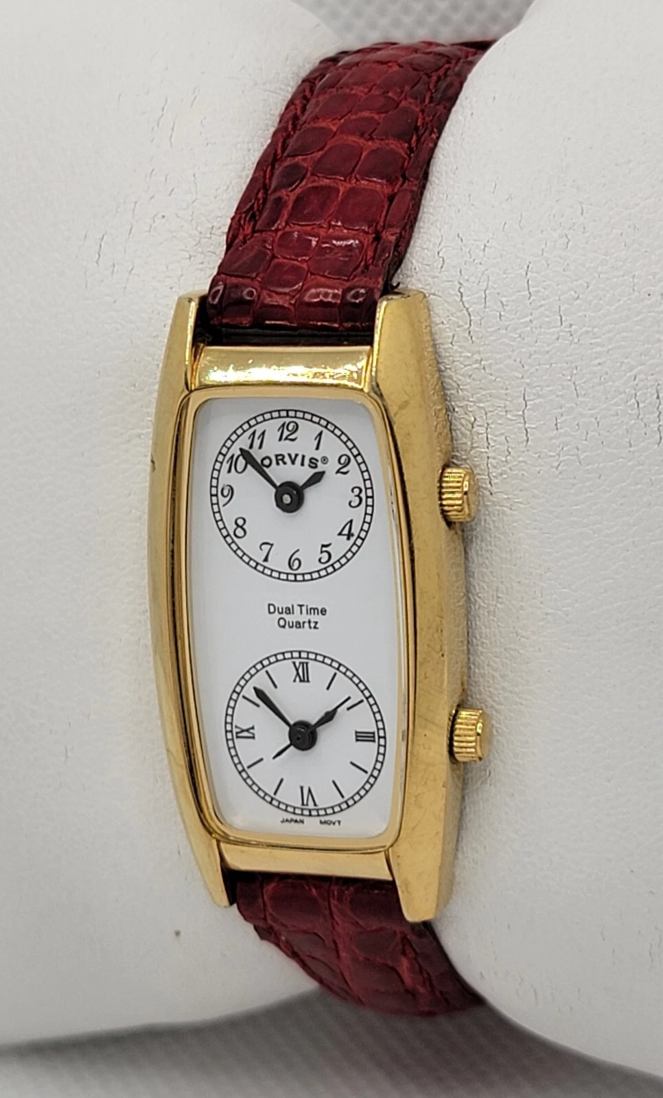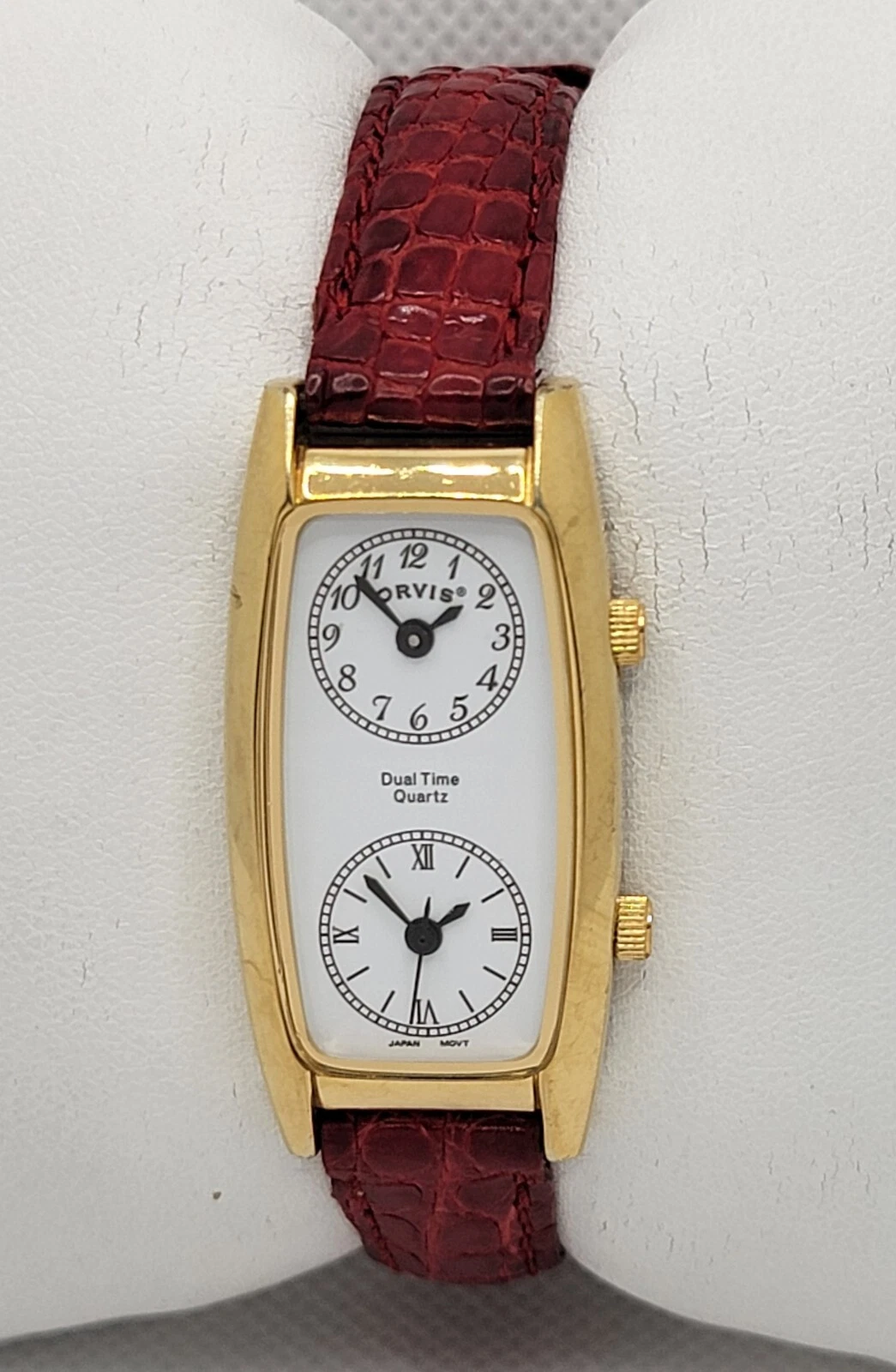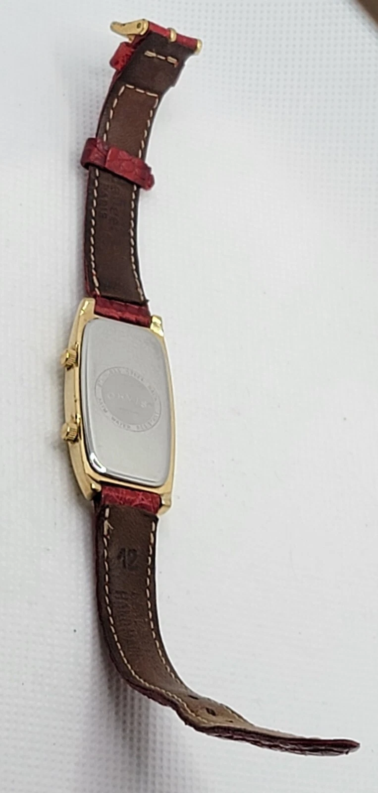 Ladies Orvis Dual Time Quartz Gold Tone Red Leather Band Watch H5