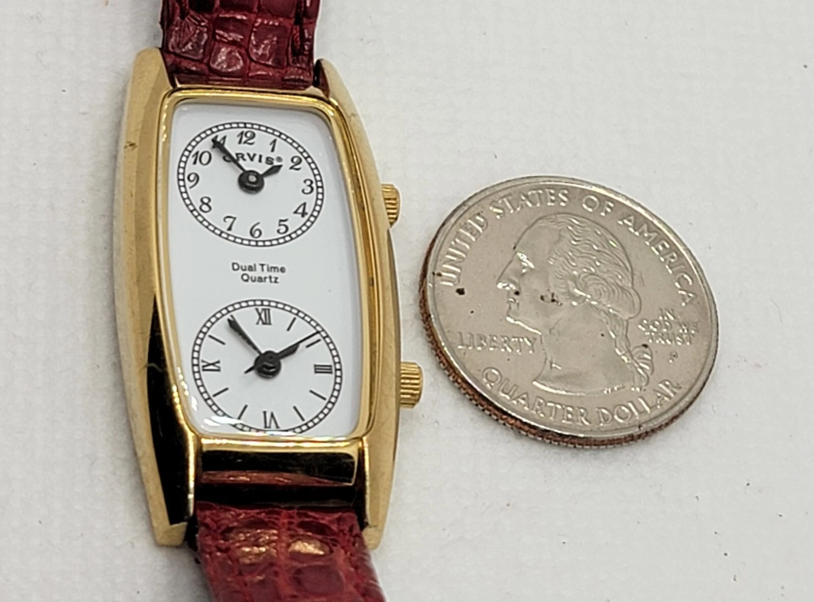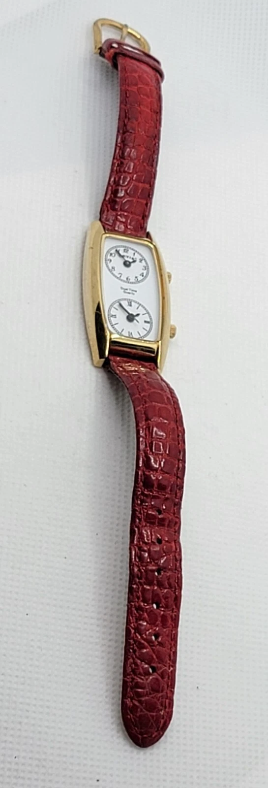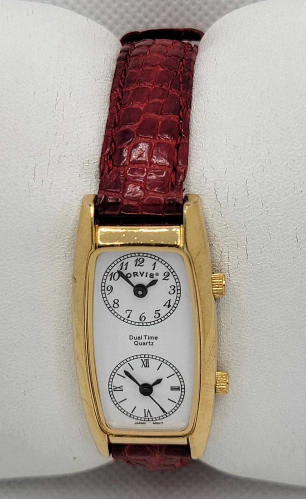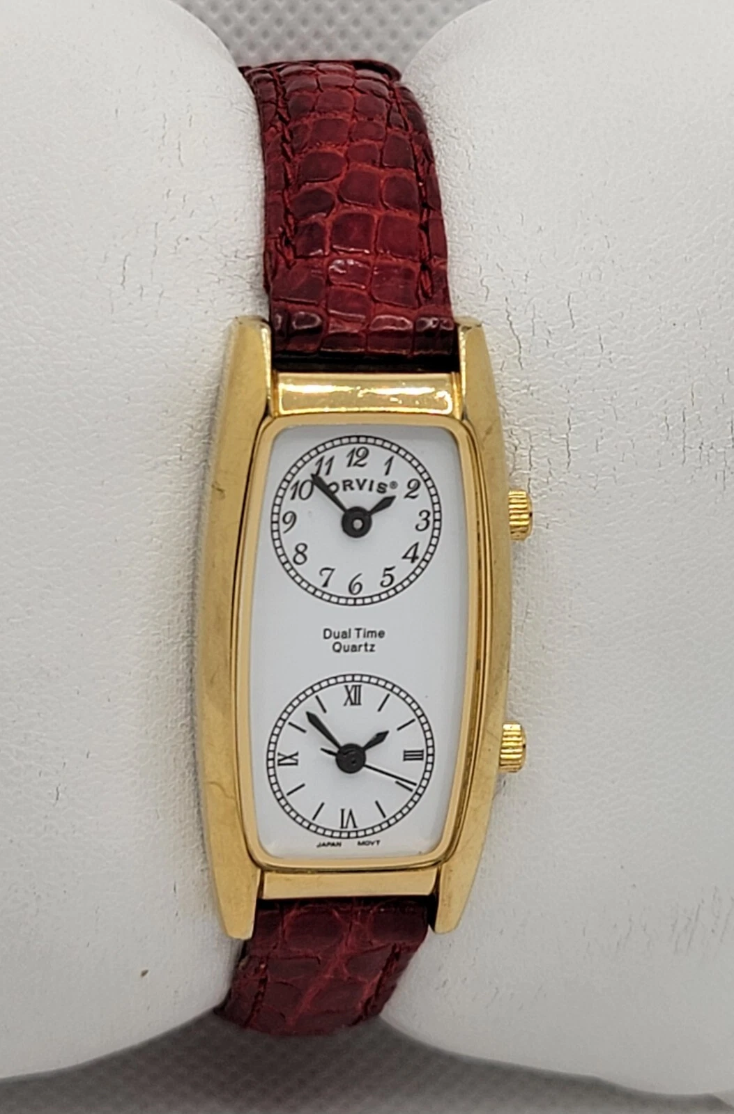Ladies Orvis Dual Time Quartz Gold Tone Red Leather Band Watch H5