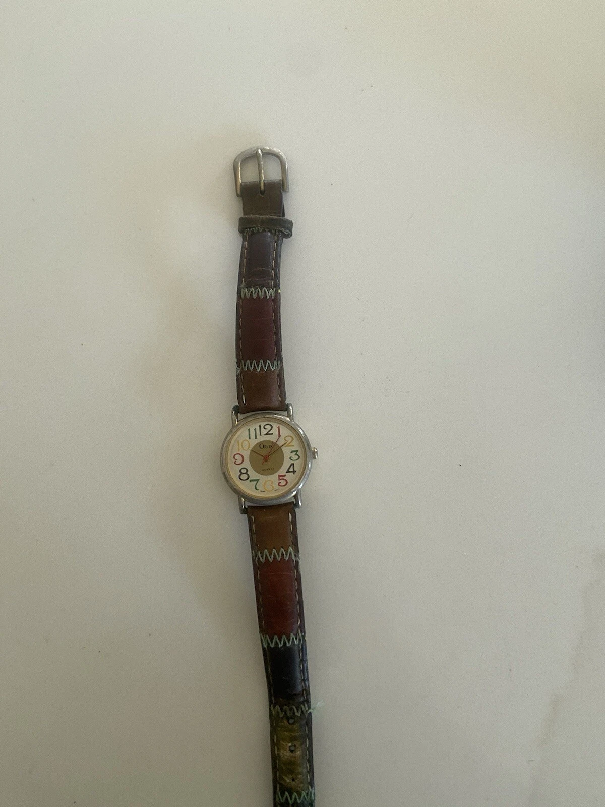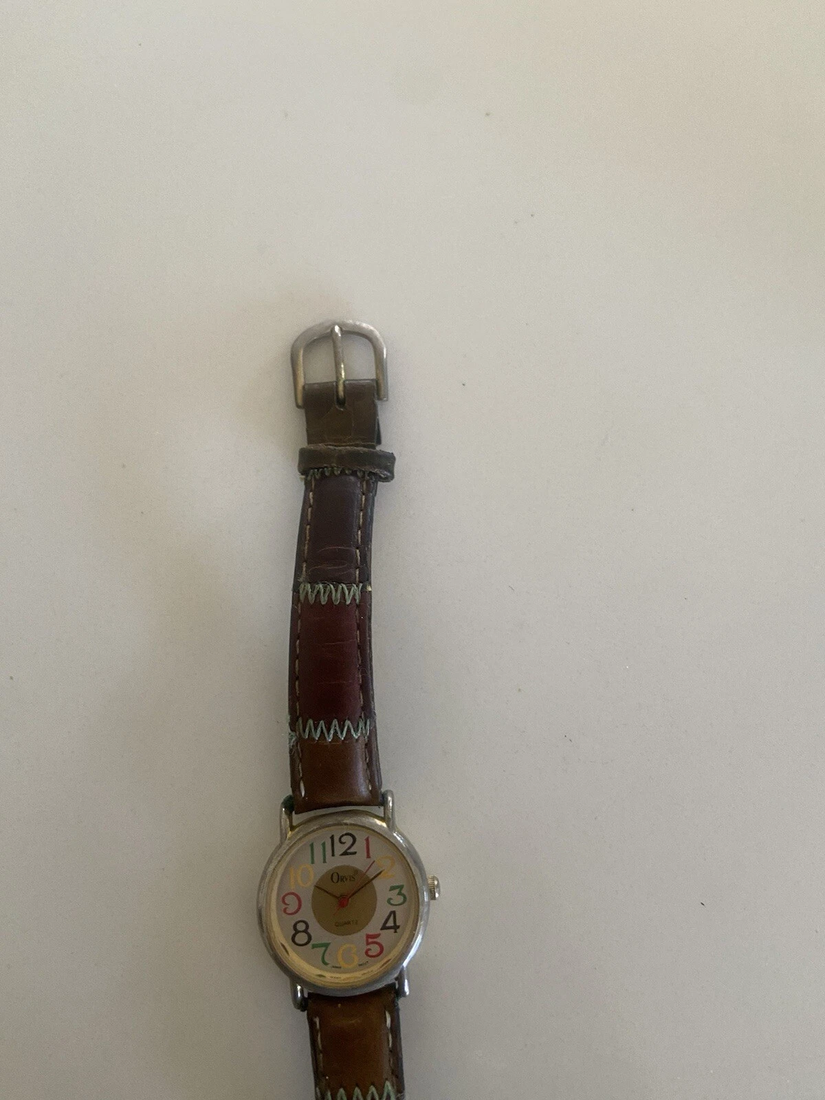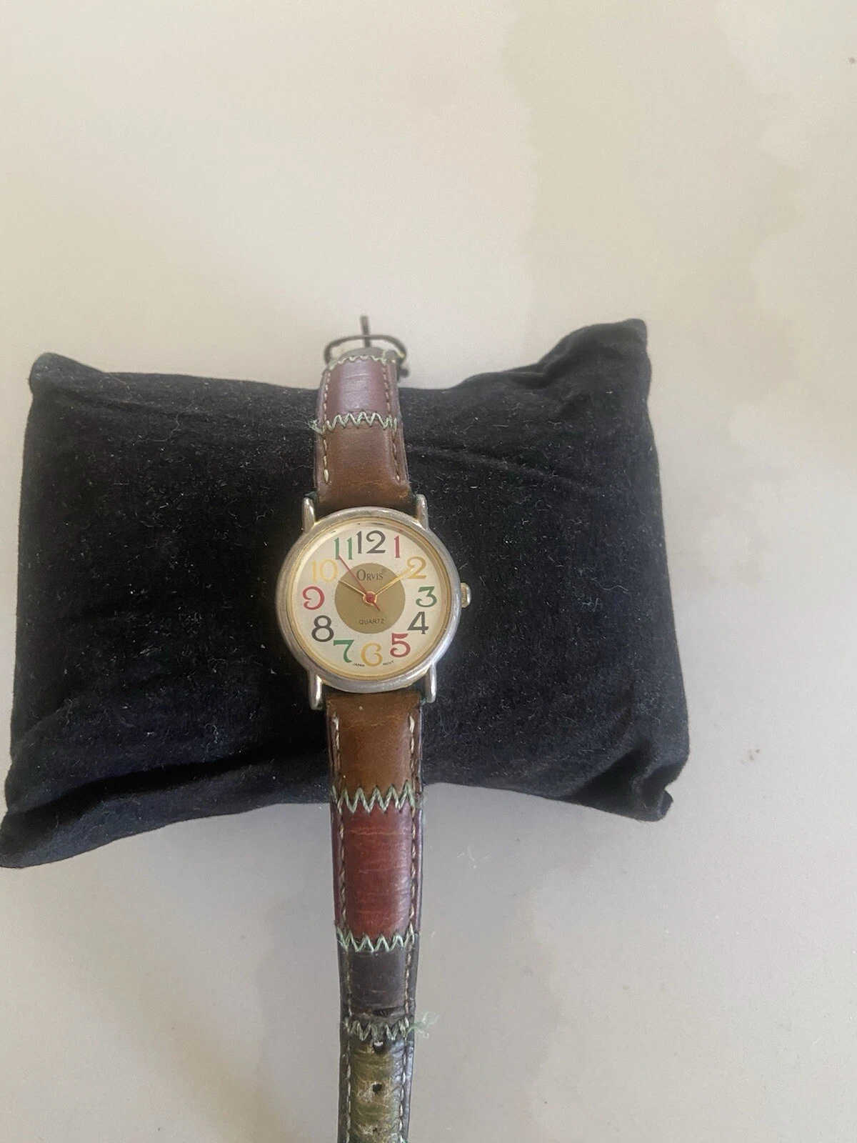 Vintage Orvis Women’s Wrist watch Multi colored Watch Face Leather band Works