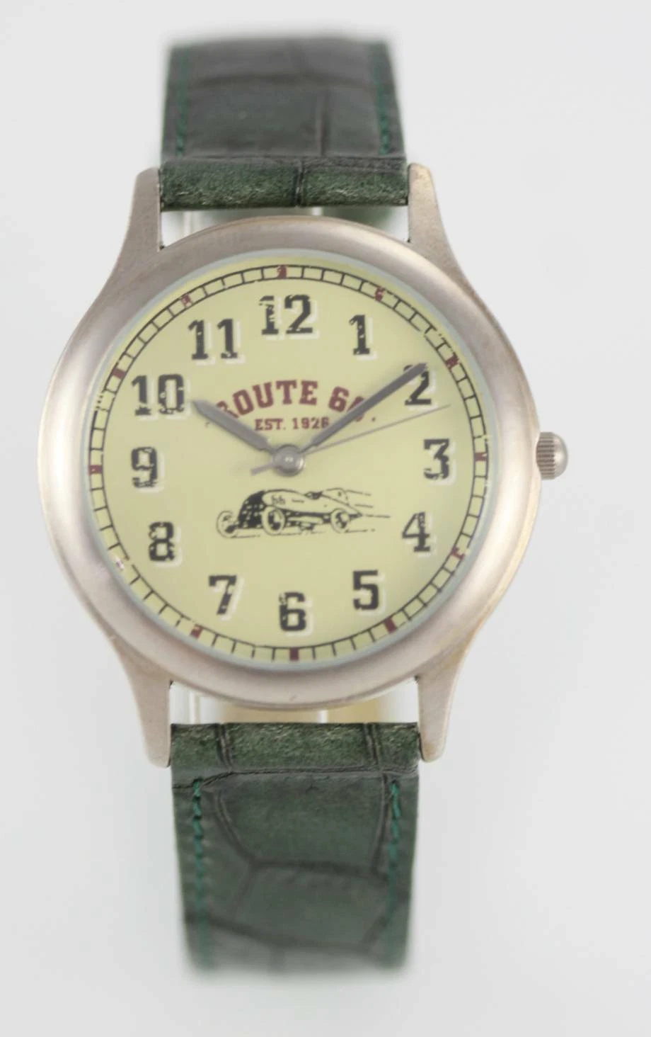 Route 66 Beige Mens Stainless Silver Green Leather Water Resistant Quartz Watch