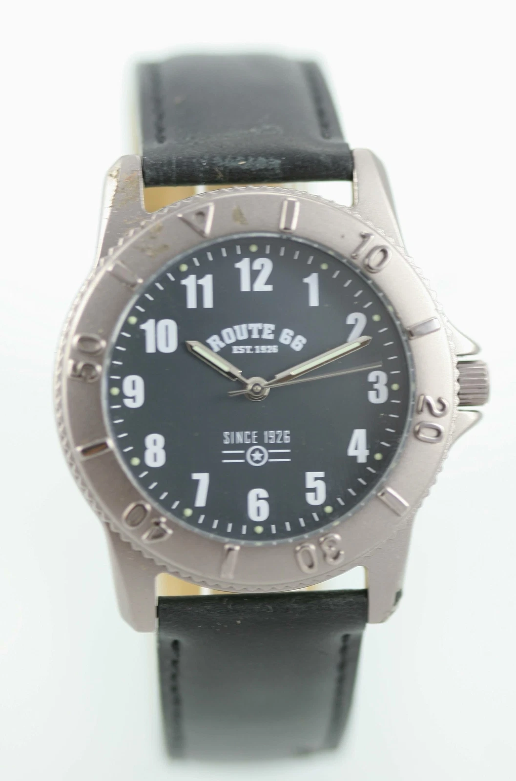 Route 66 Men Watch Gray Stainless Silver Leather Black Water Res 30m Batt Quartz