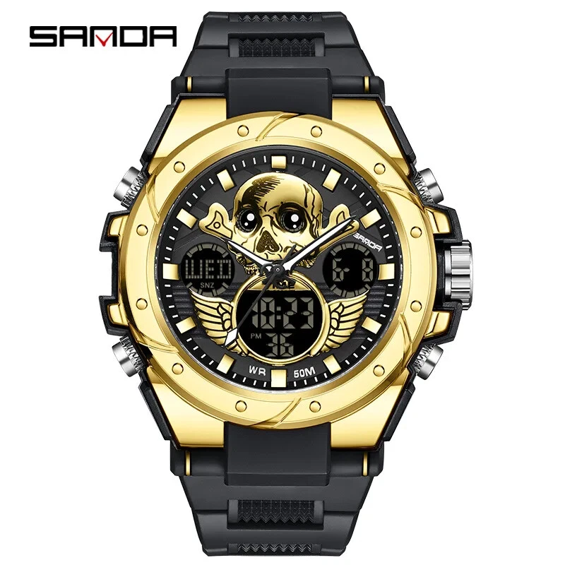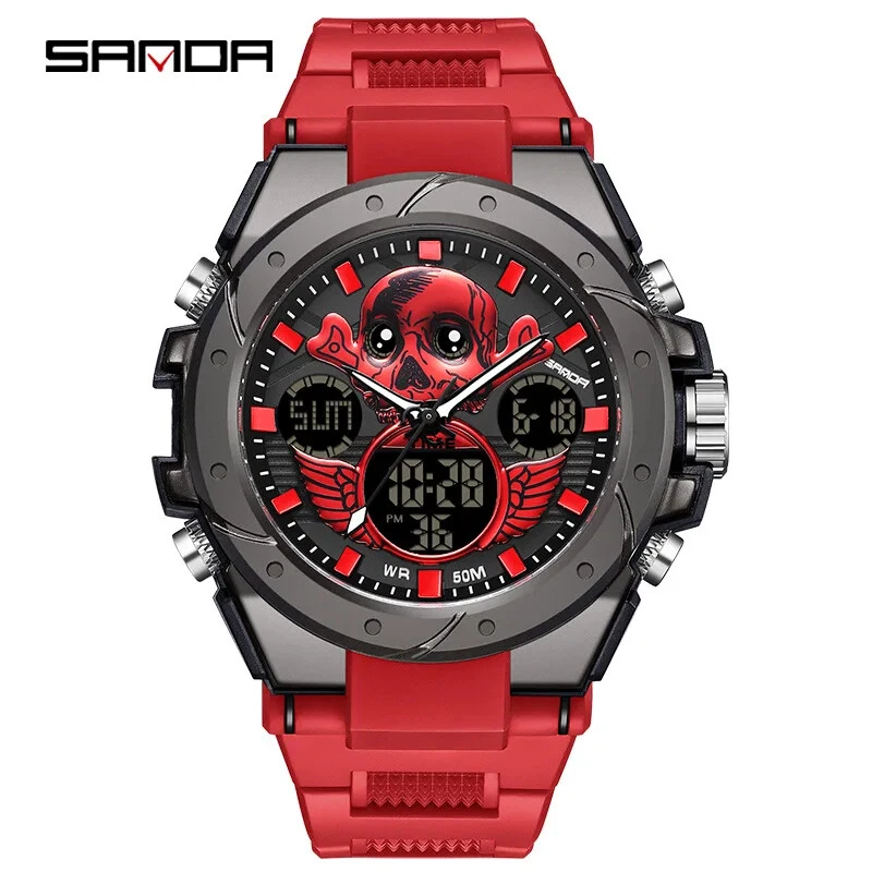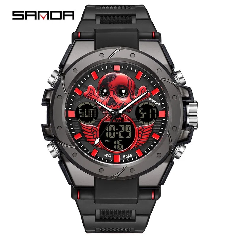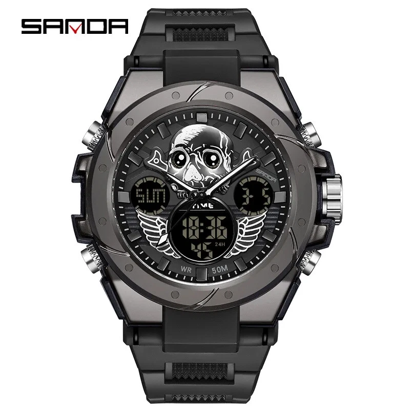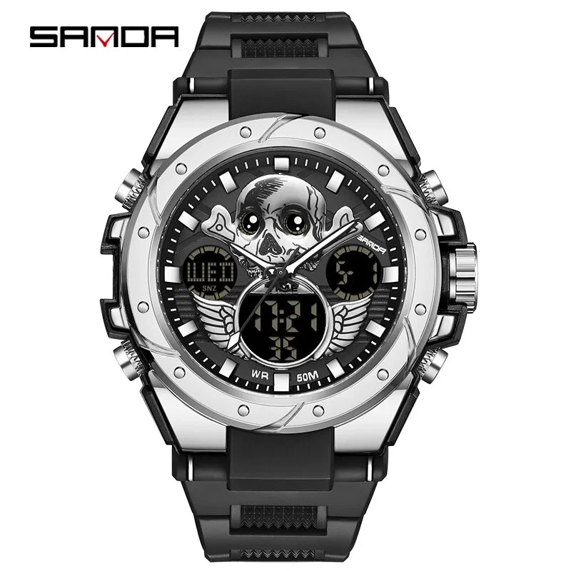 SANDA Sport 6087 Watch Men Military Army Top Brand Skull Wristwatch Dual Display