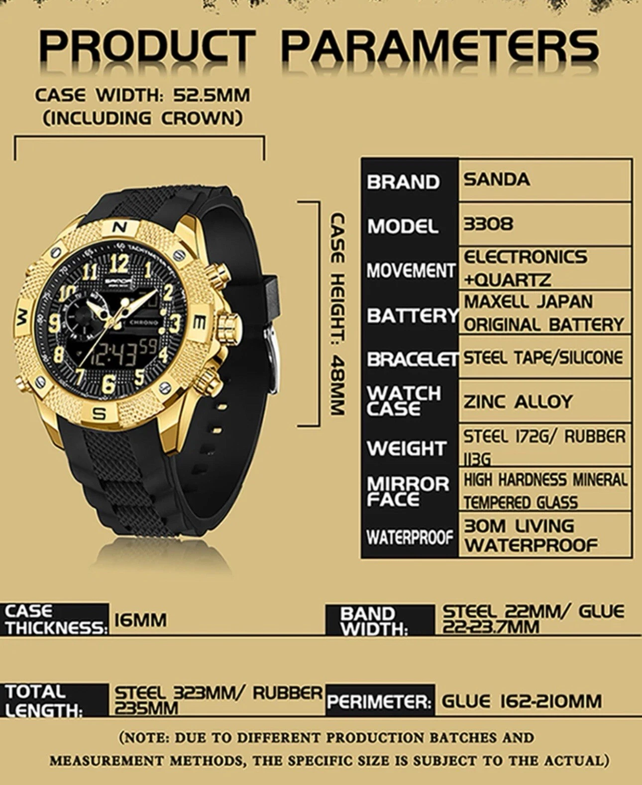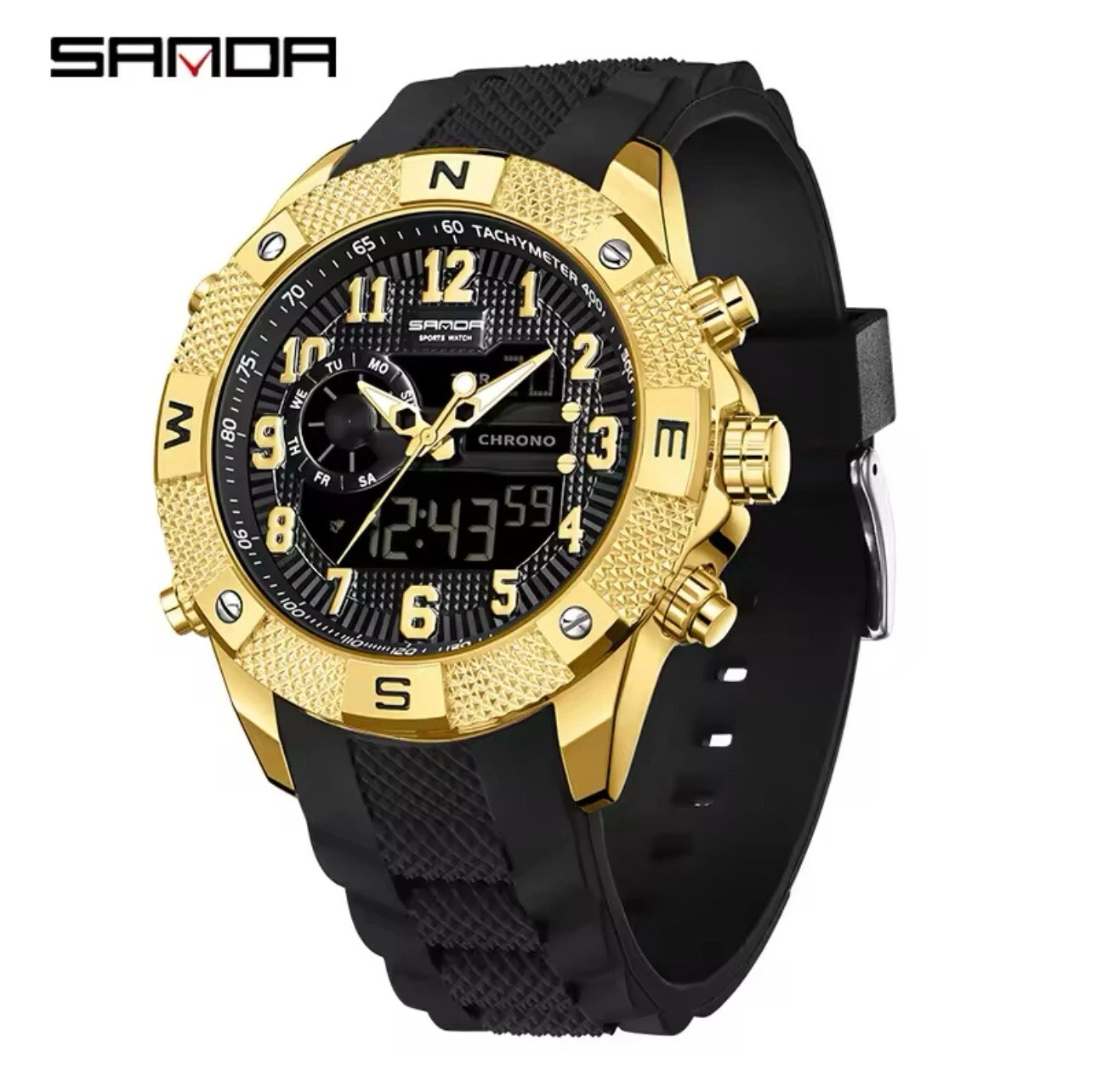 SANDA Golden Top Men Watch LED Digital Stainless Steel Military Sport Waterproof