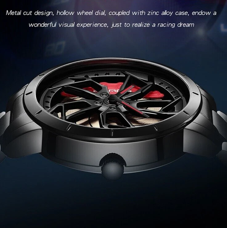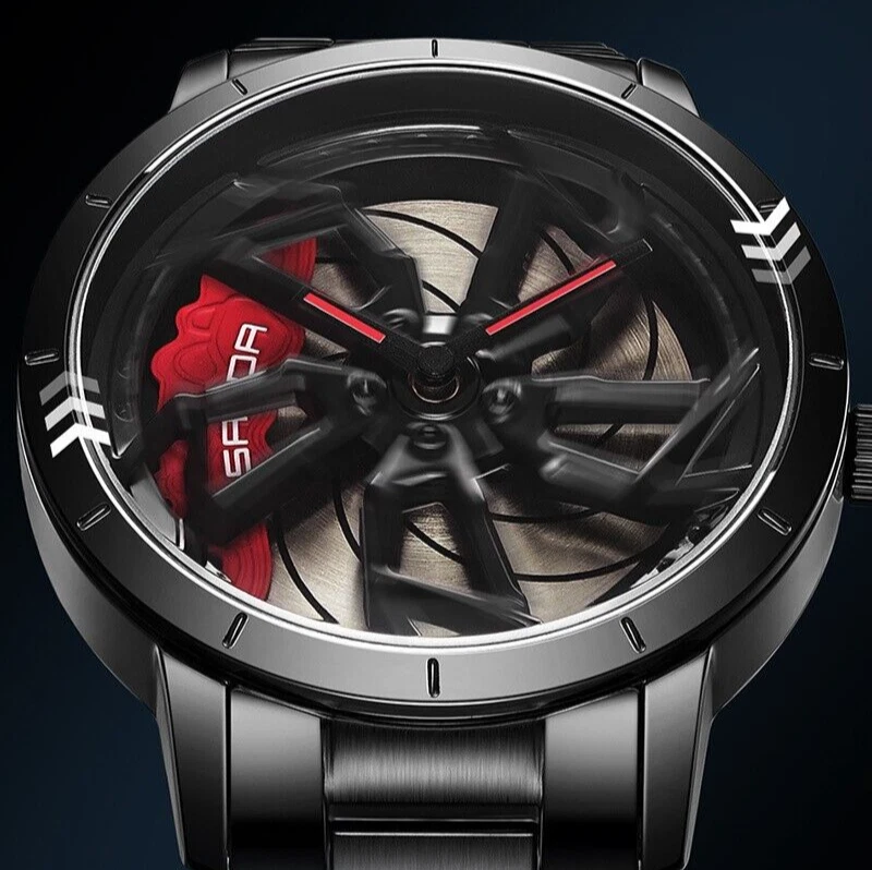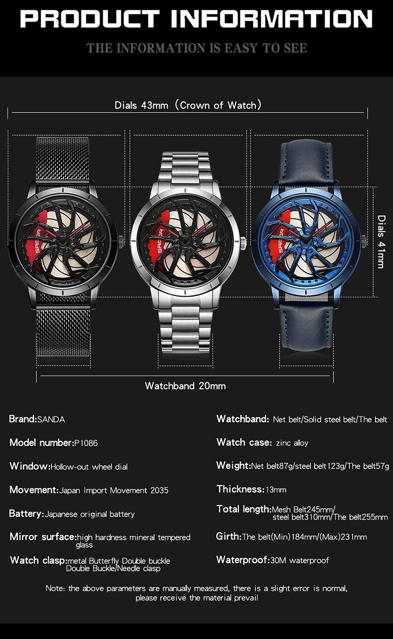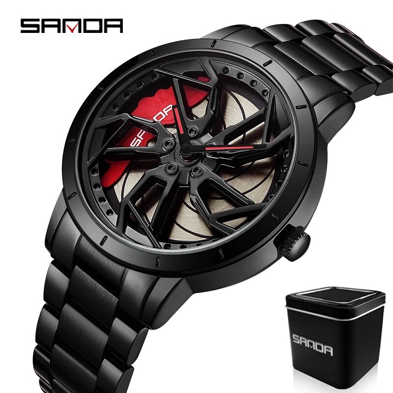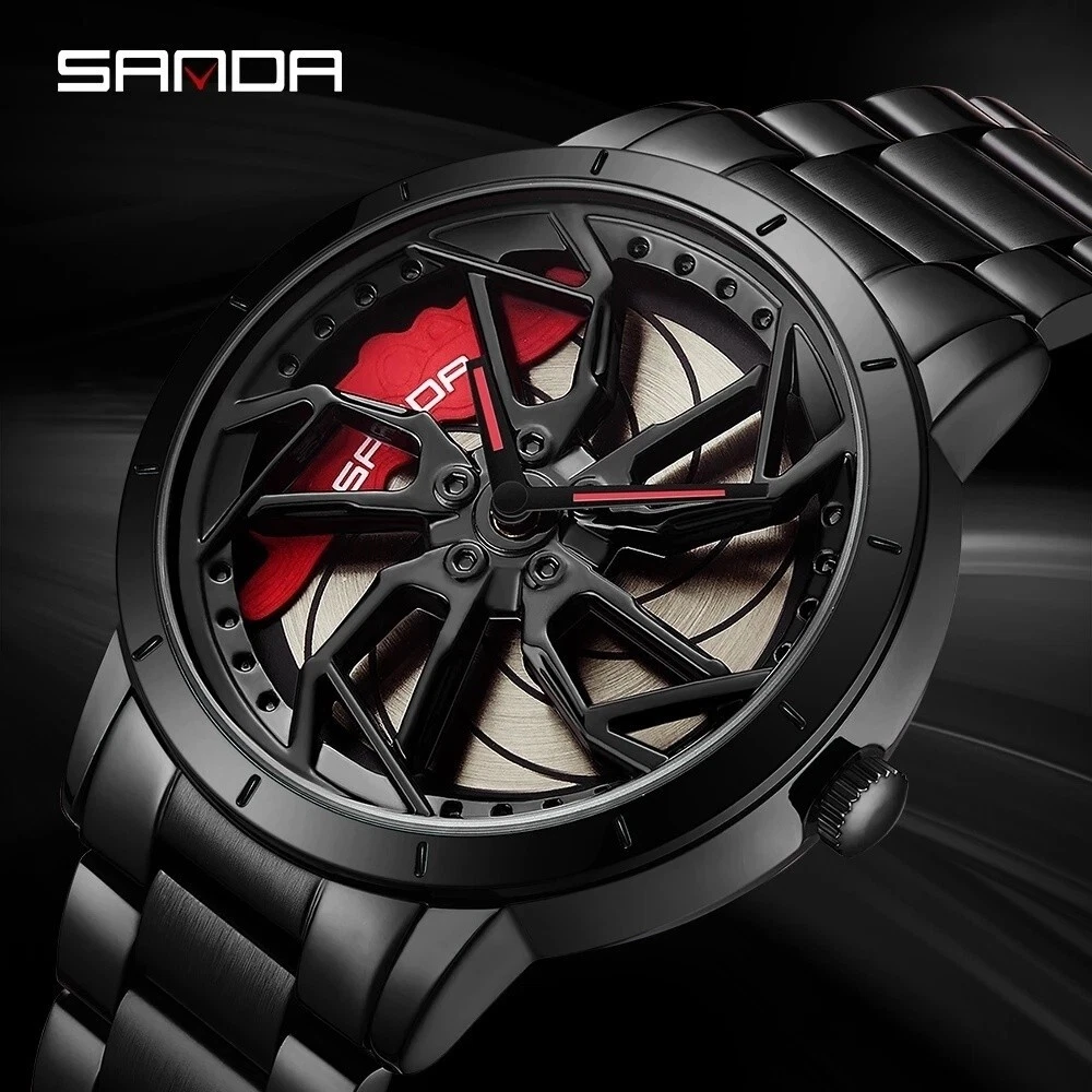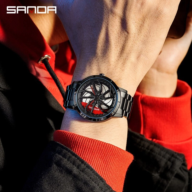 SANDA Car Rim Wheel Rotating Dial Mens Quartz Stainless Wateproof Luminous Watch