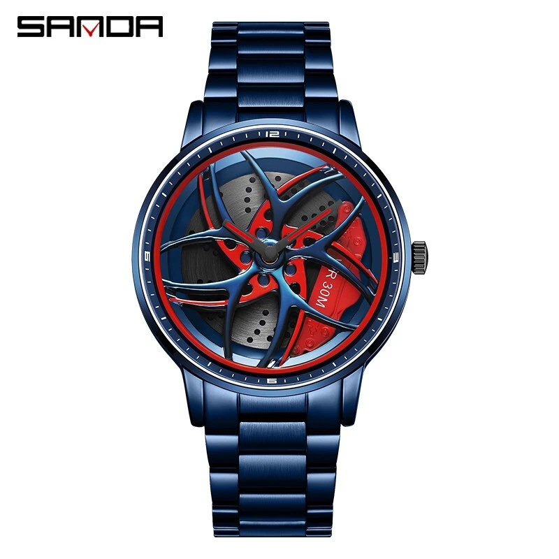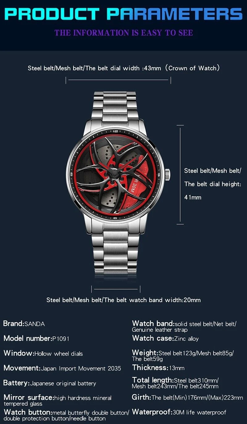 SANDA Rotating Dial Car Rim Wheel Quartz Mens Stainless Wateproof Luminous Watch