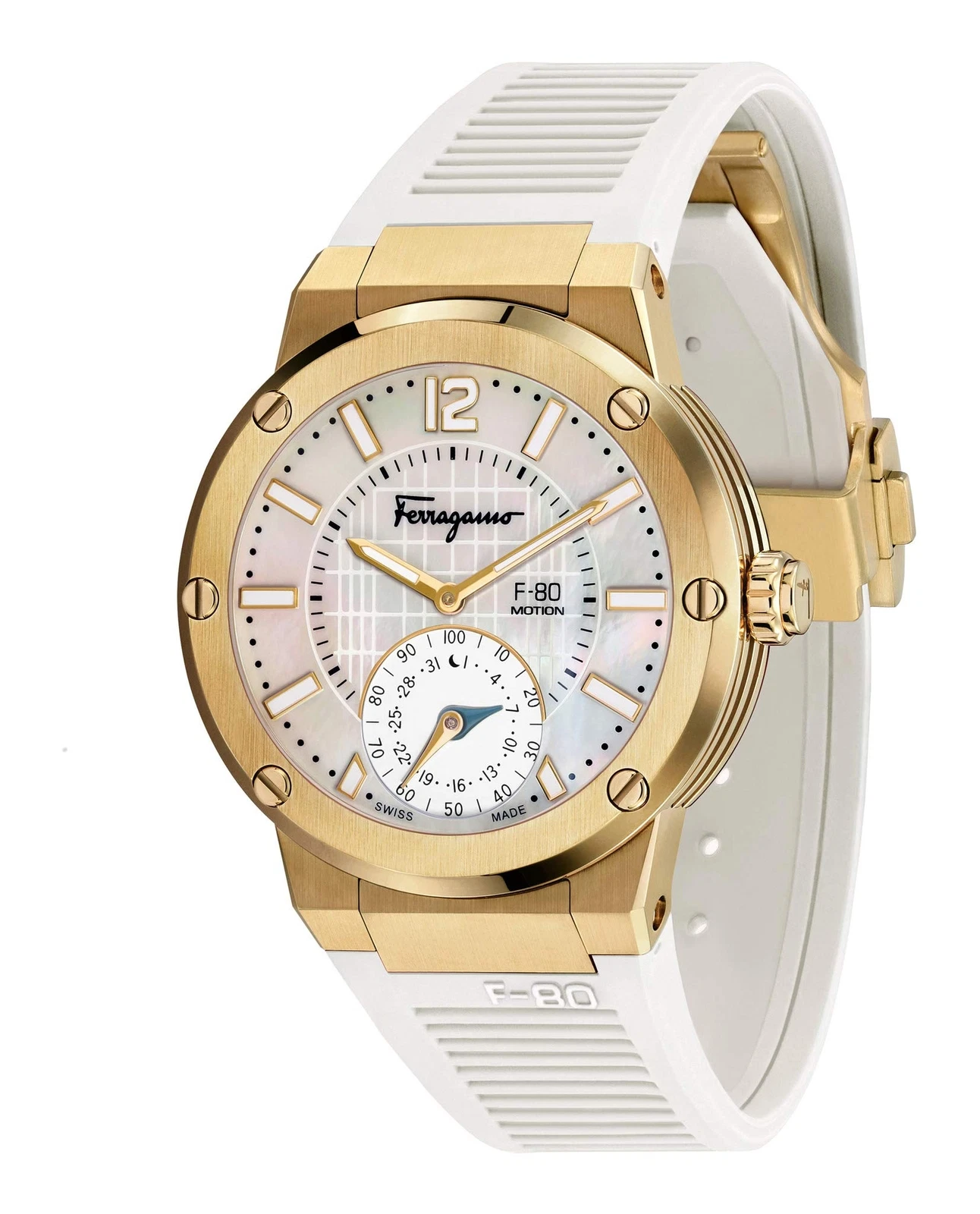 Salvatore Ferragamo SFAZ00218 F-80 Motion gold white mop Rubber Unisex Watch NEW