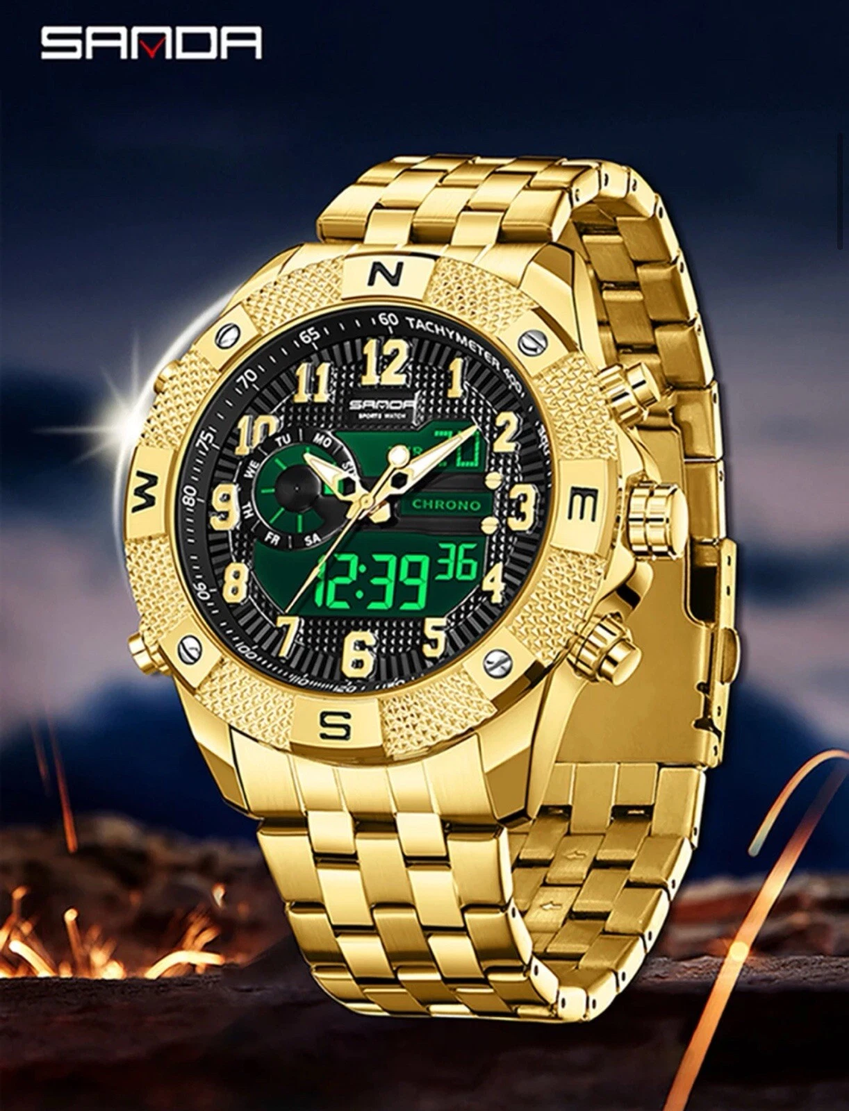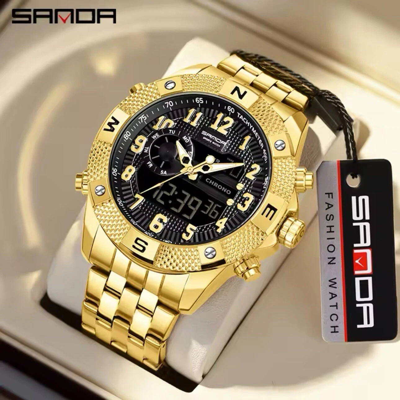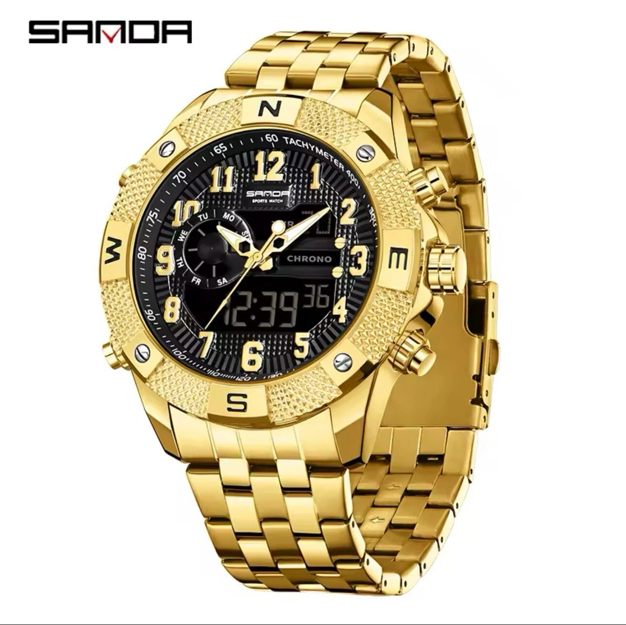SANDA Golden Top Men Watch LED Digital Stainless Steel Military Sport Waterproof