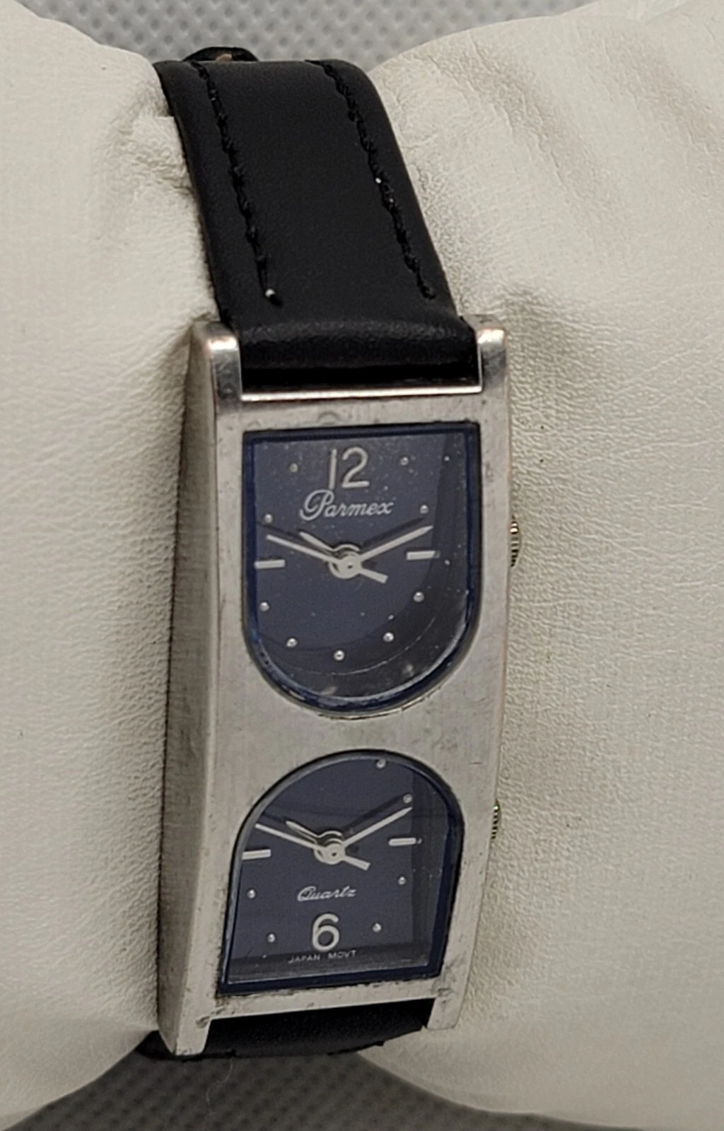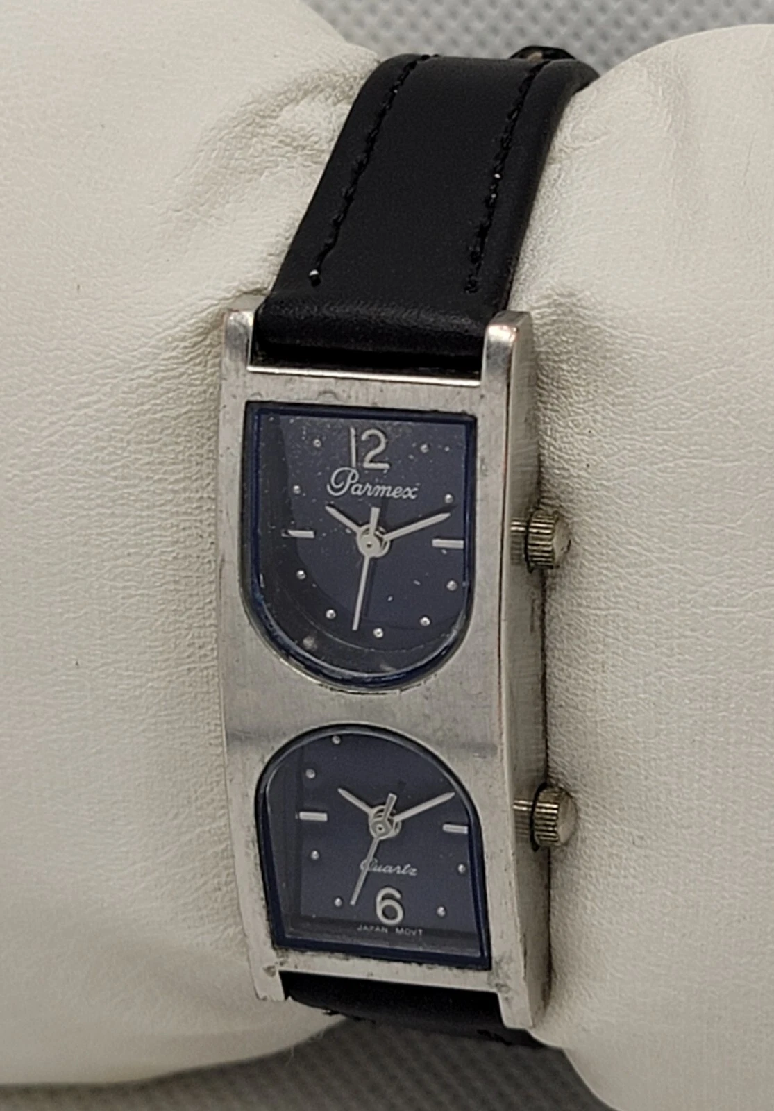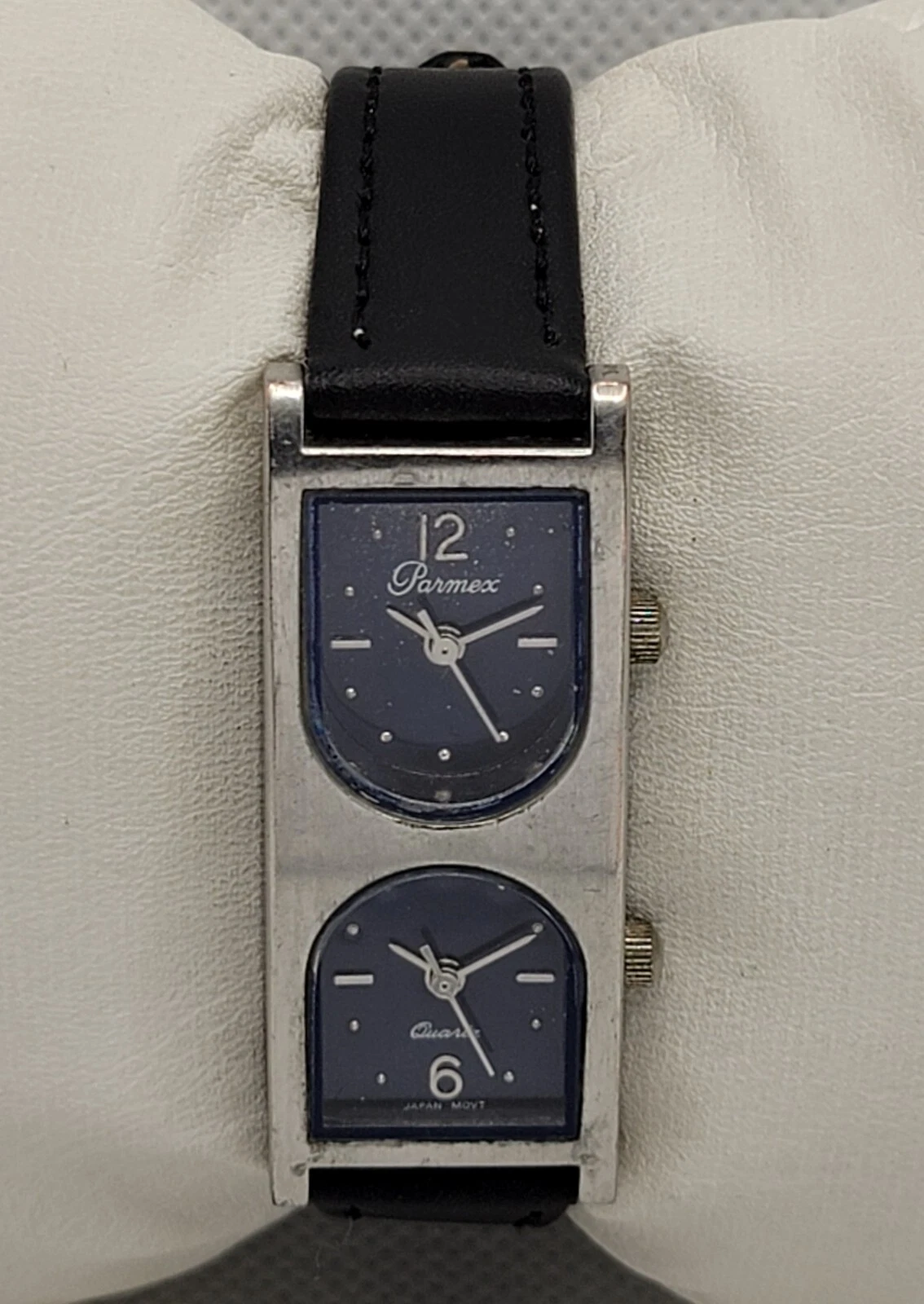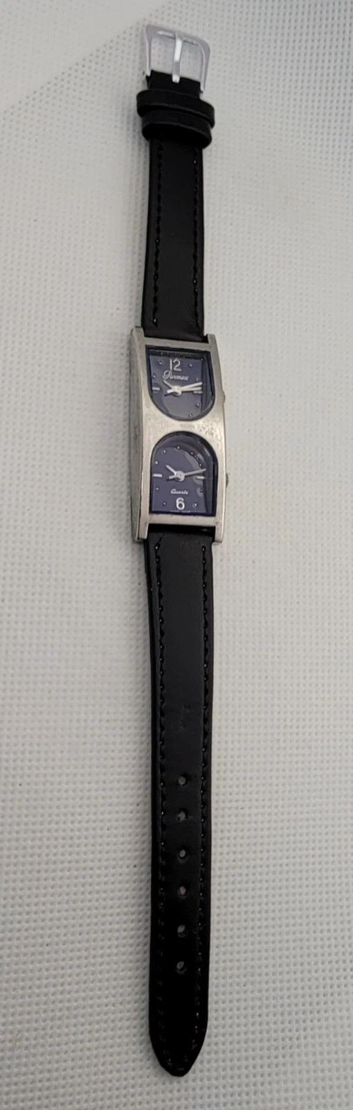 Ladies Pramex Rectangle Silver Tone Blue Dial Black Leather Band Dual Watch J9