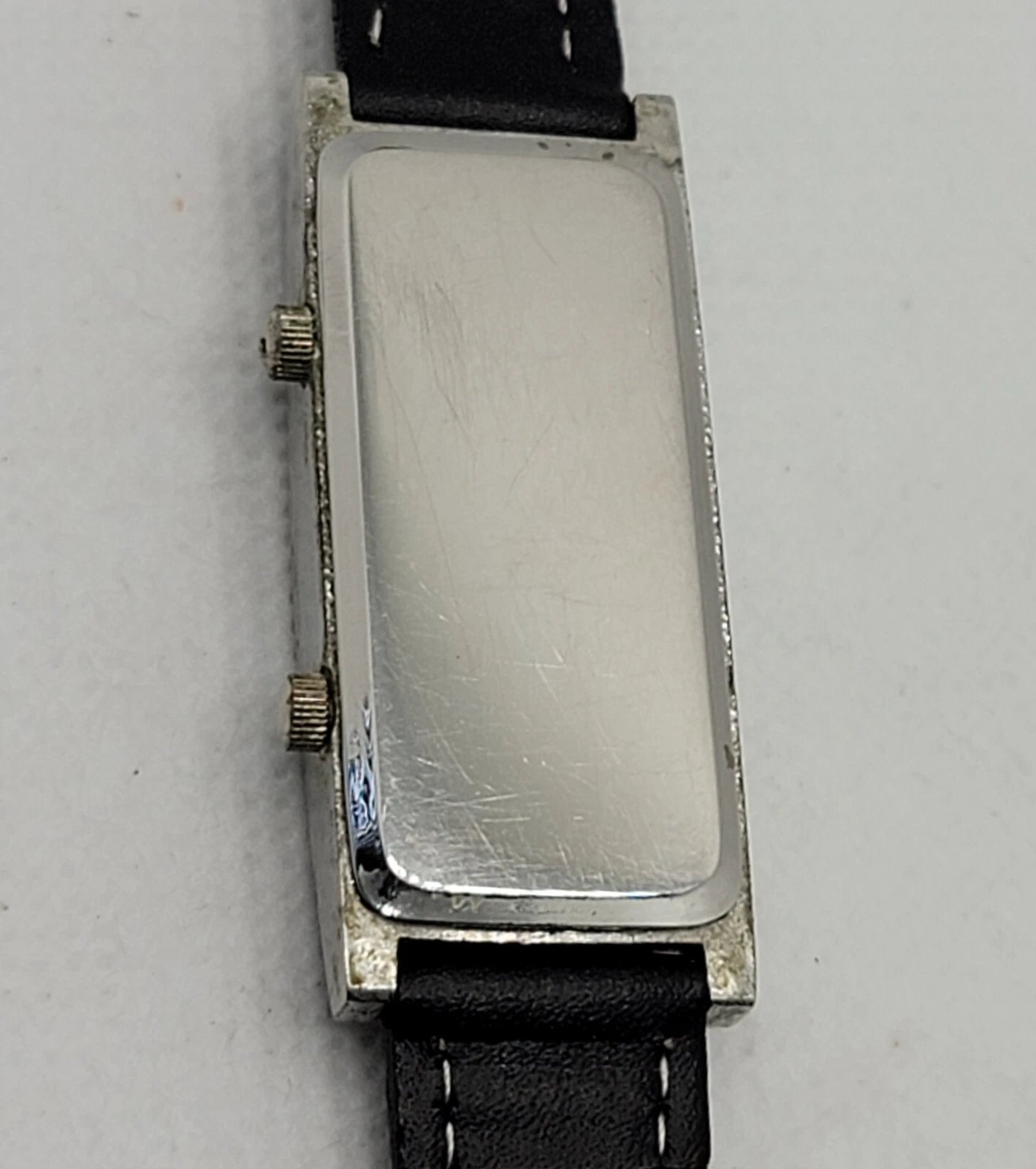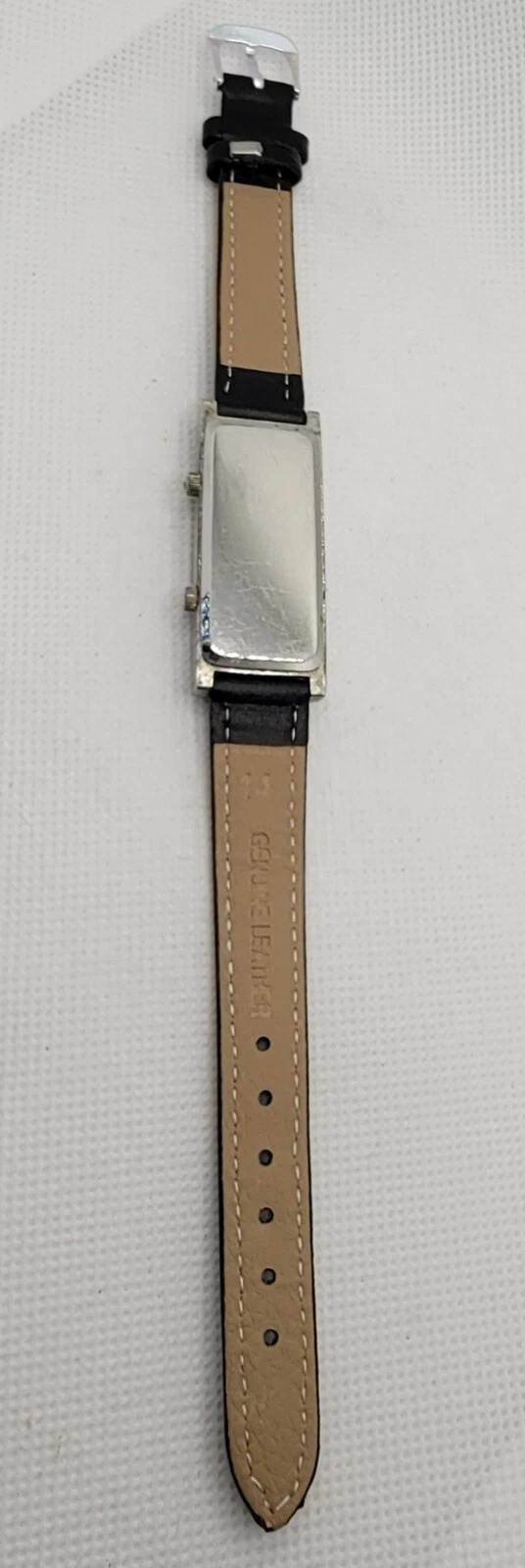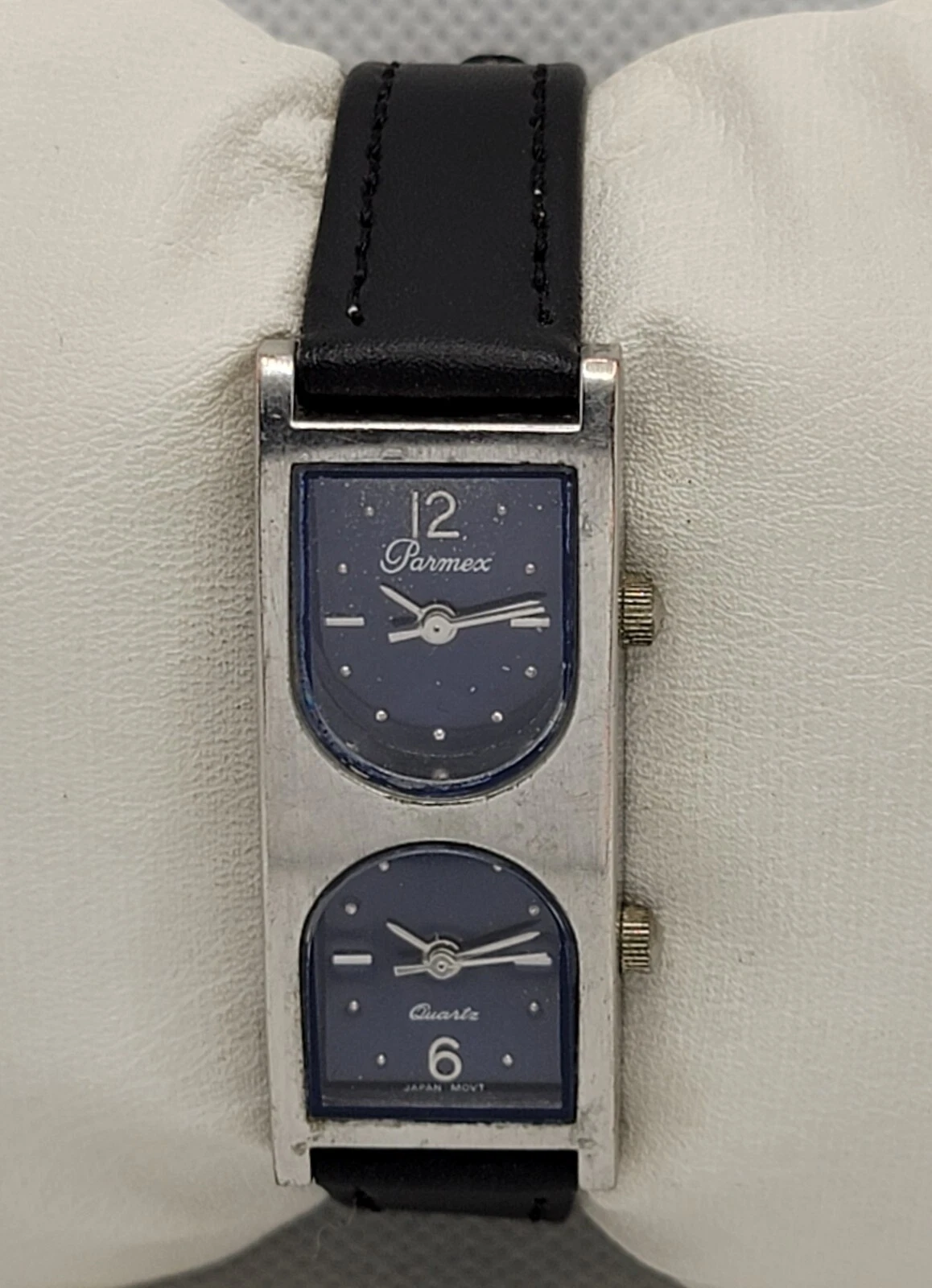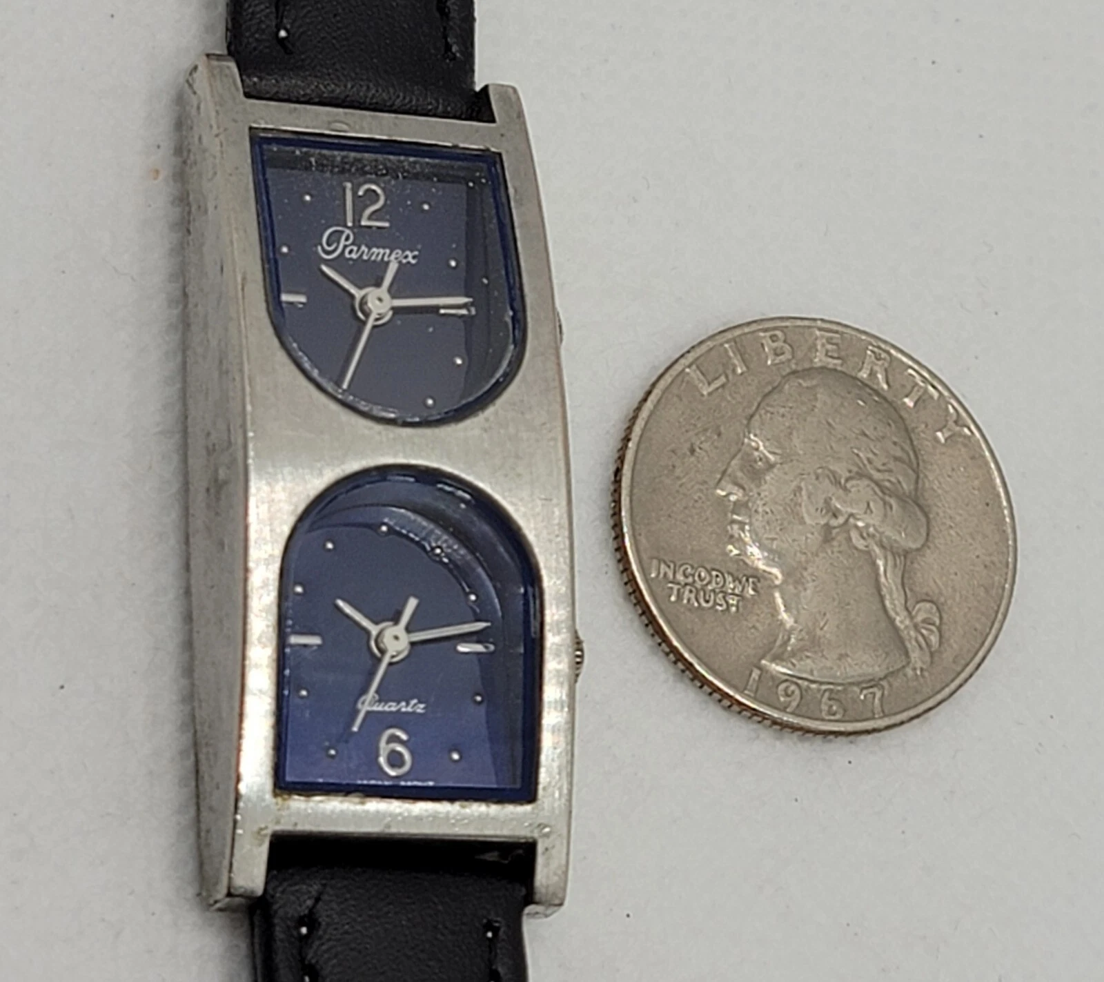 Ladies Pramex Rectangle Silver Tone Blue Dial Black Leather Band Dual Watch J9