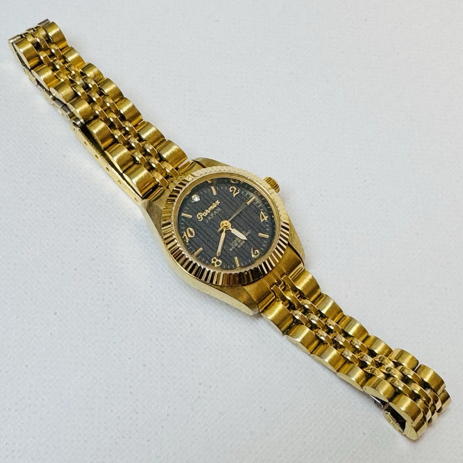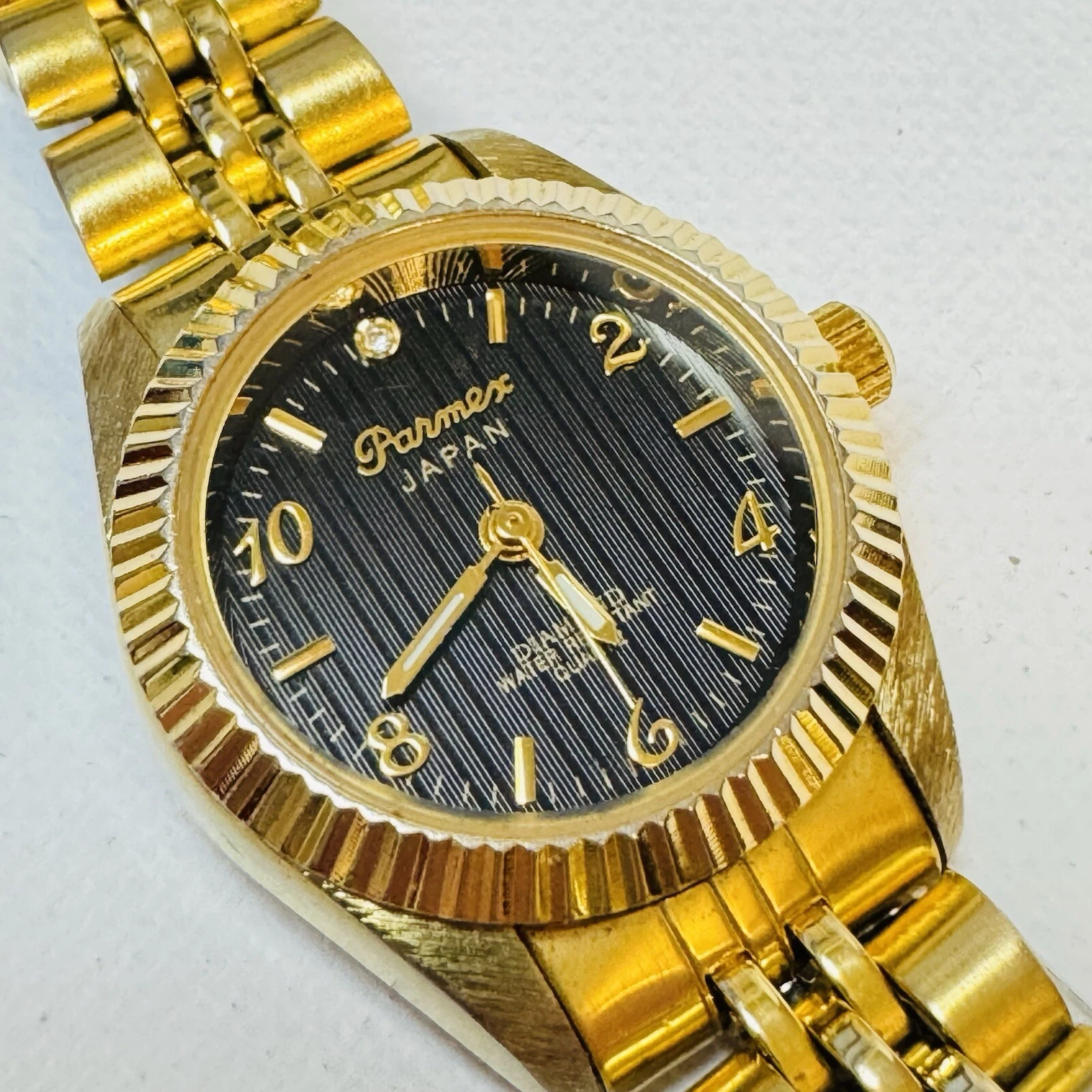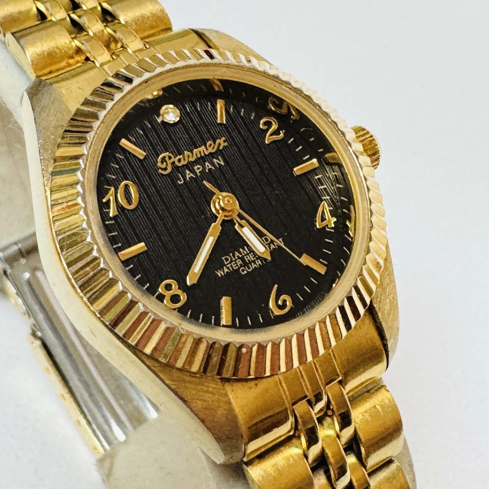 Vintage Parmex Diamond Women's Black Dial Fluted Bezel Gold Tone Dress Watch 2