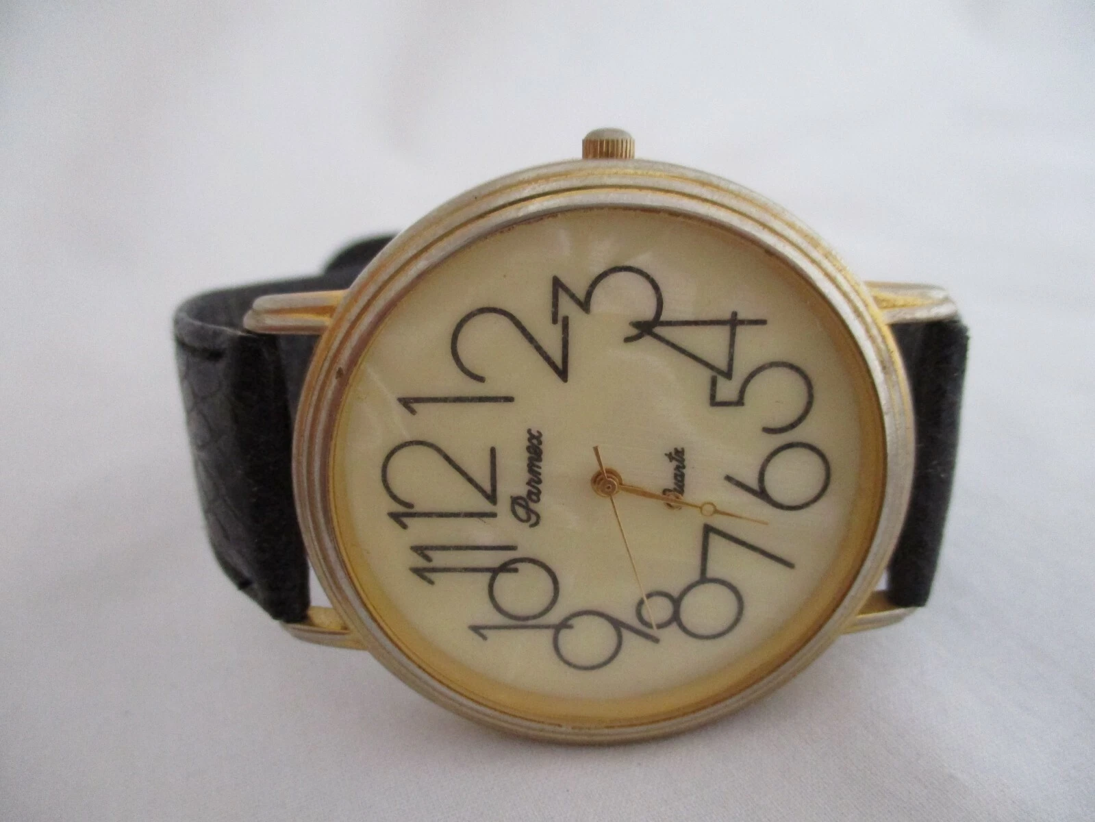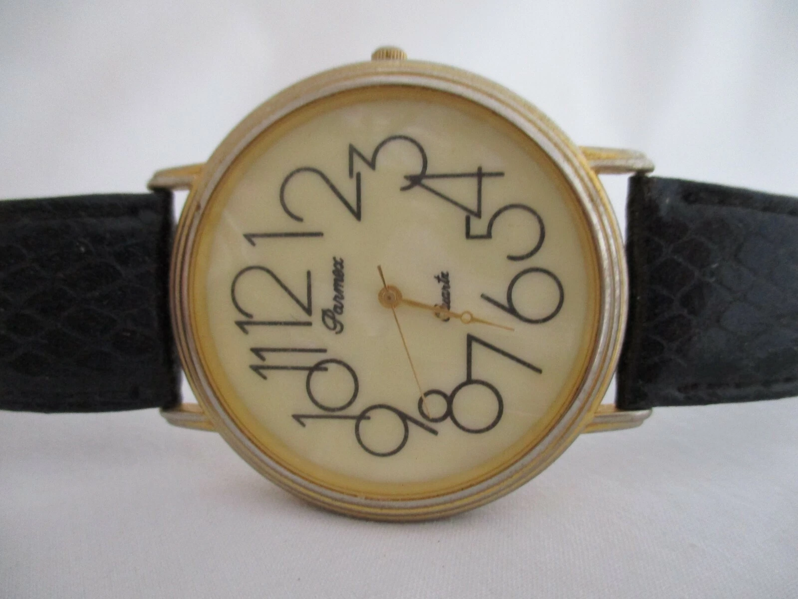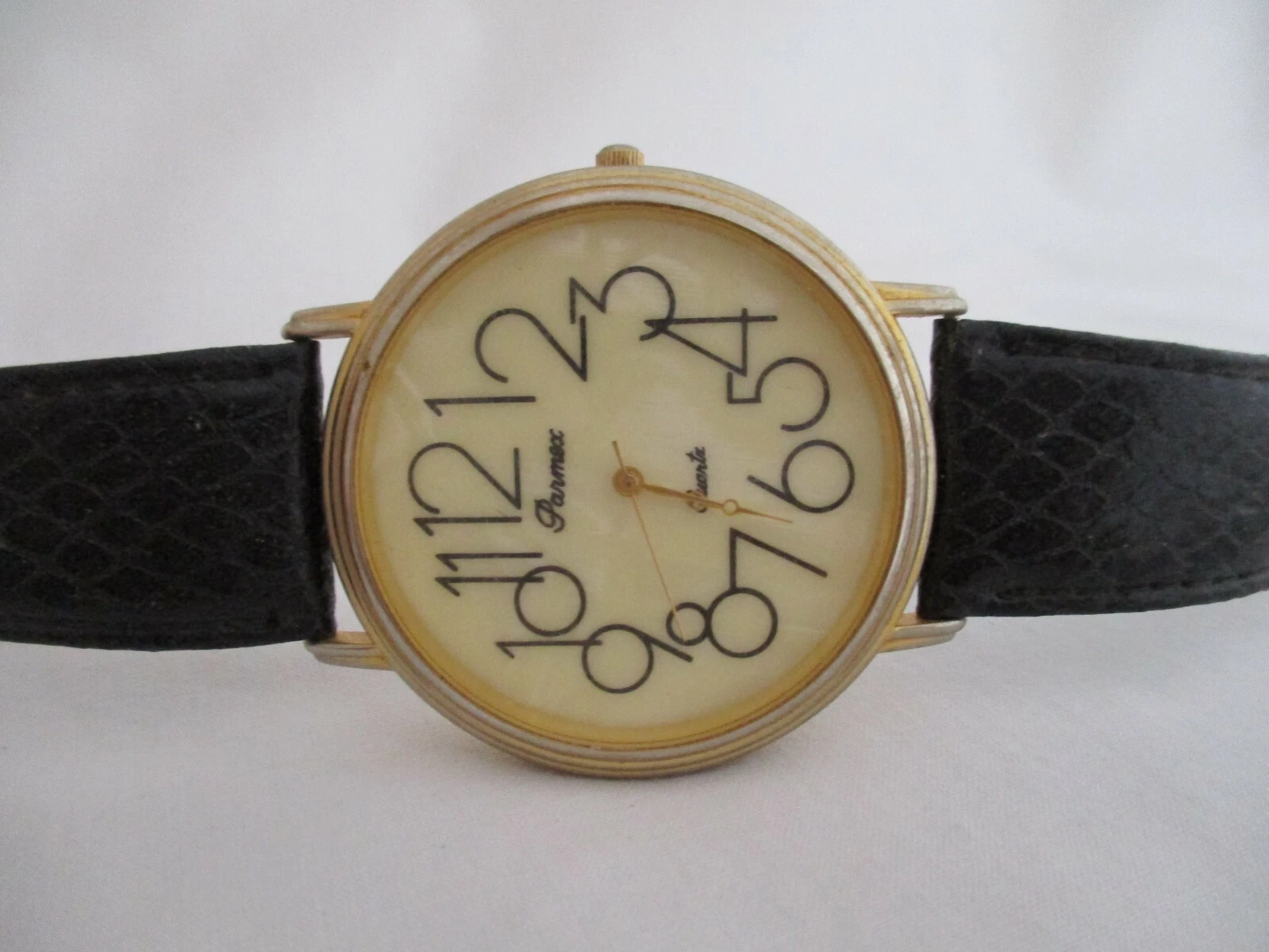 Parmex Analog Wristwatch Black Genuine Leather Buckle Band Round Face Gold Tone