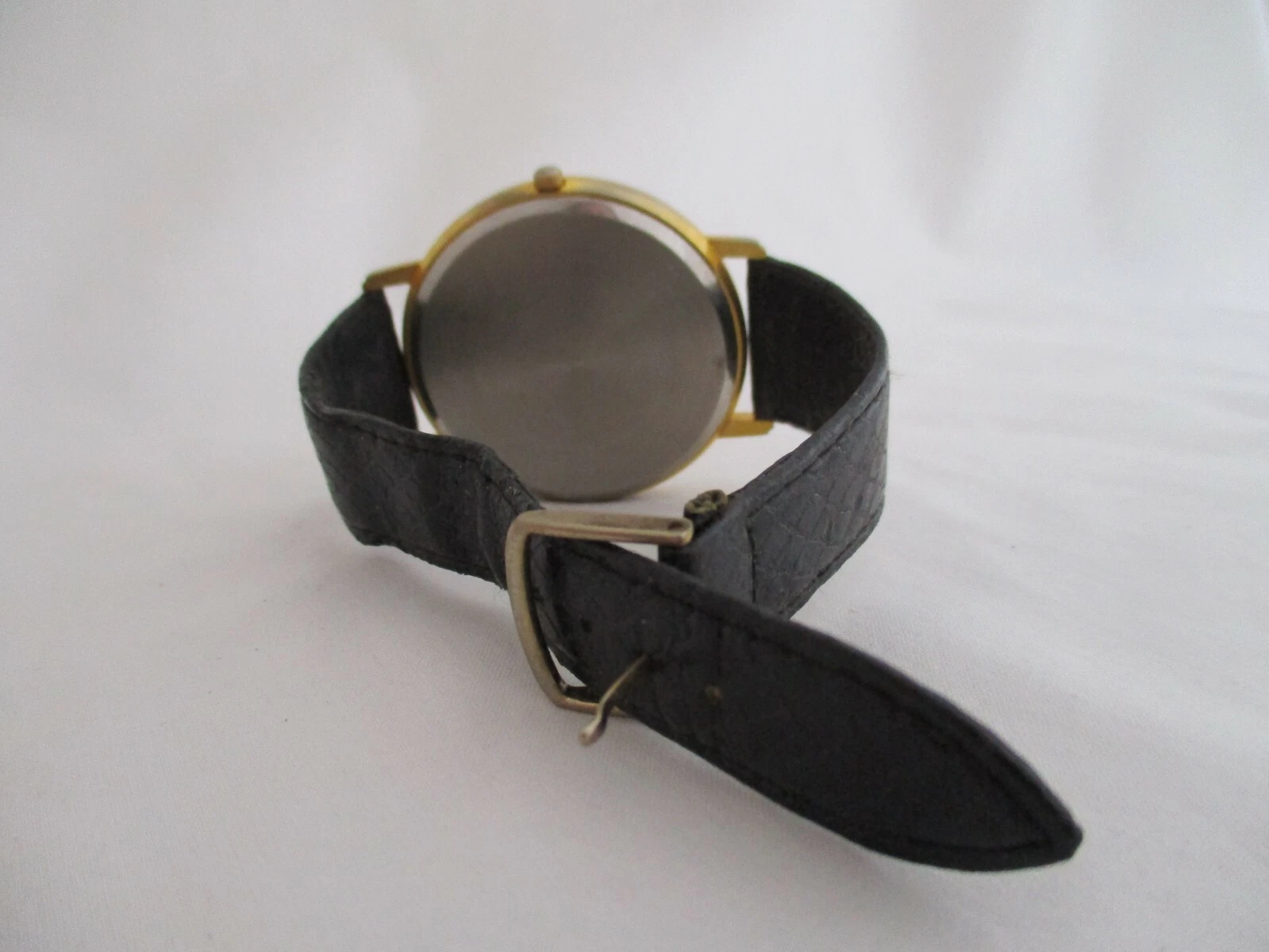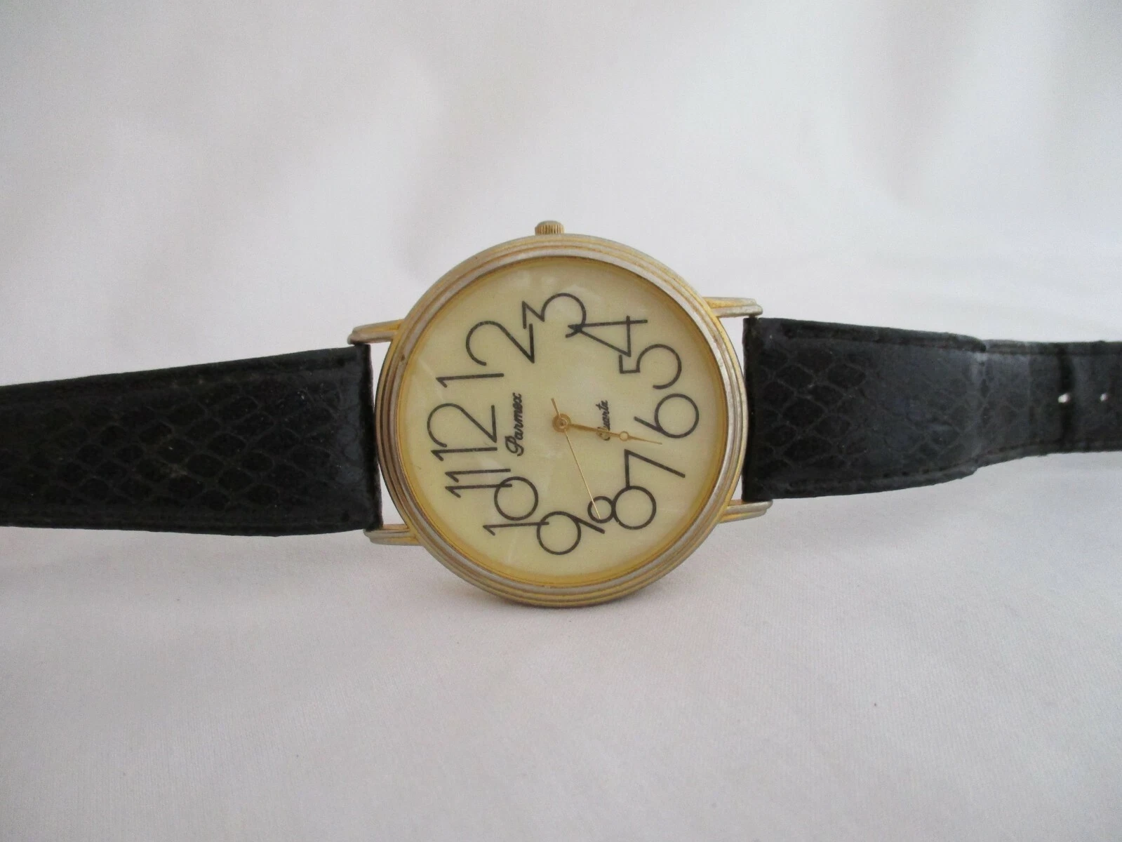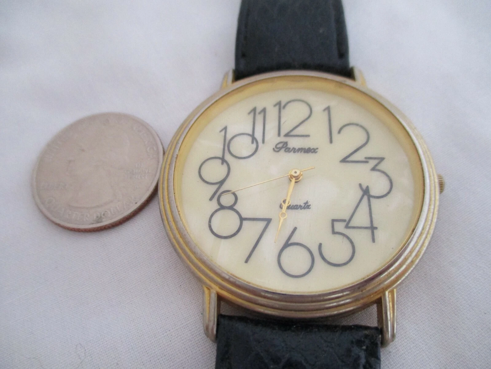 Parmex Analog Wristwatch Black Genuine Leather Buckle Band Round Face Gold Tone