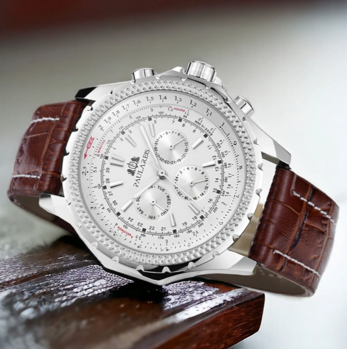 PAULAREIS Automatic Chronograph Watch Men's Leather Waterproof Luminous Diver