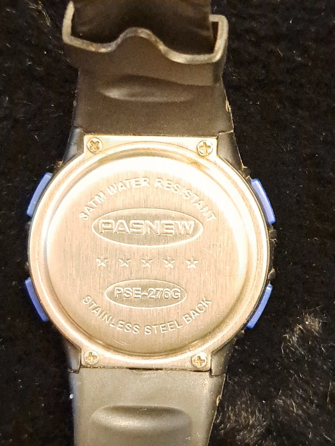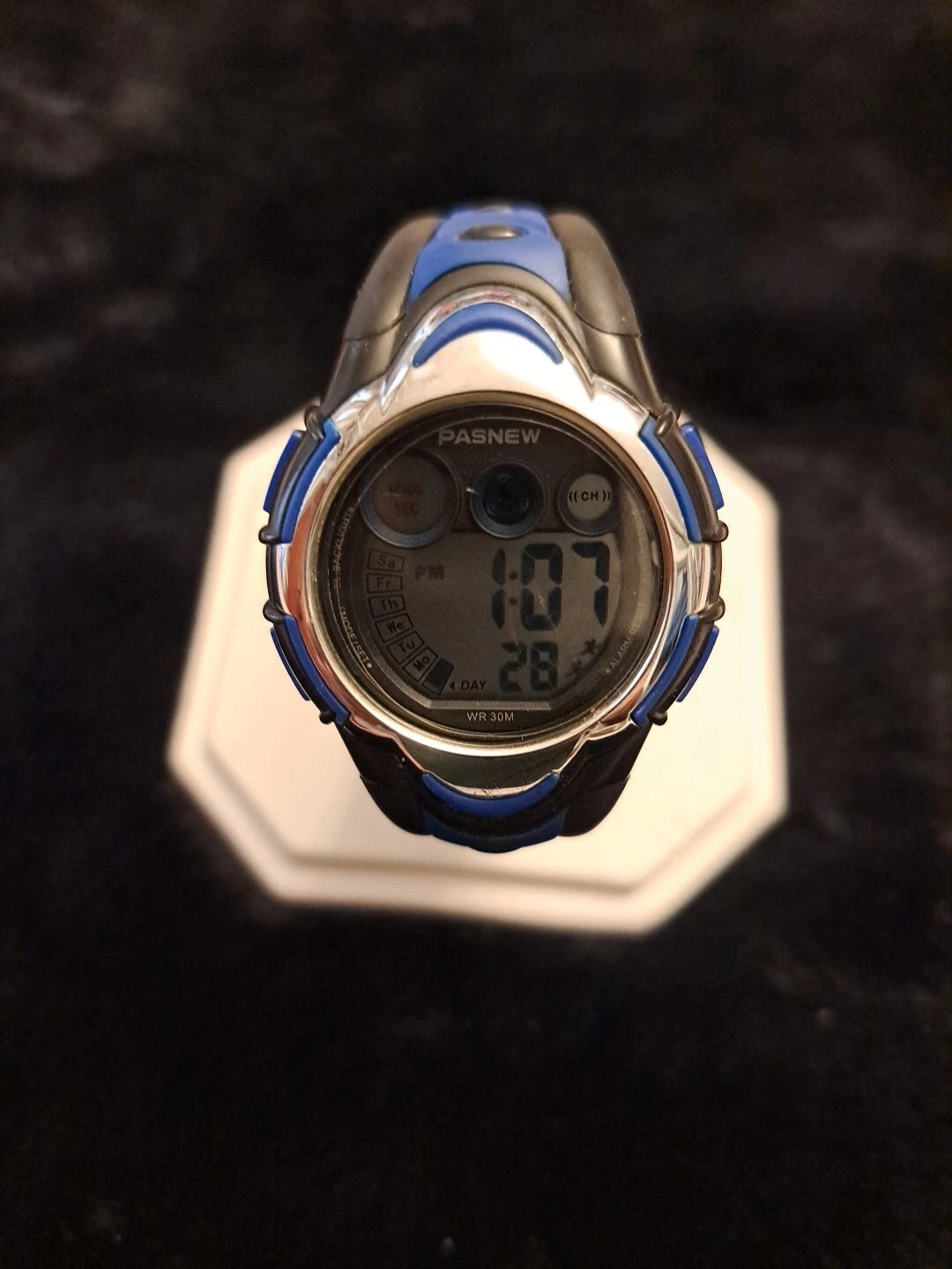 Pasnew Mens Digital Watch Black Blue Multi-function New Battery WORKS EUC