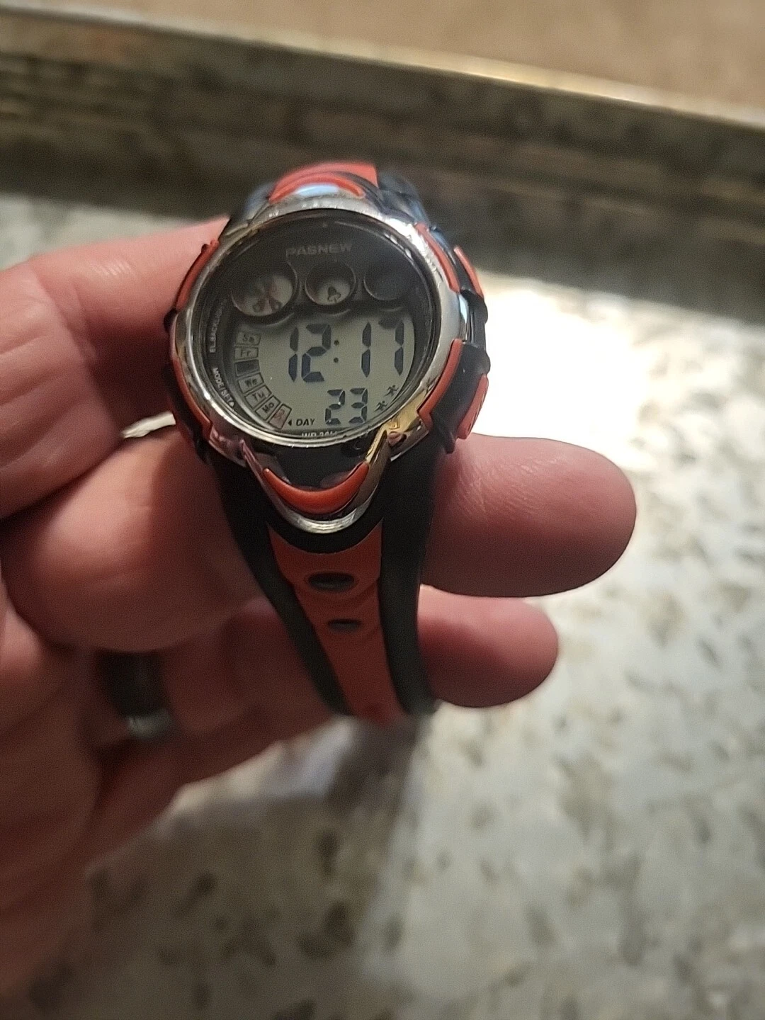 Pasnew Digital Day Date Timer Light Up Red Black Silicone Band Watch WR 3 ATM