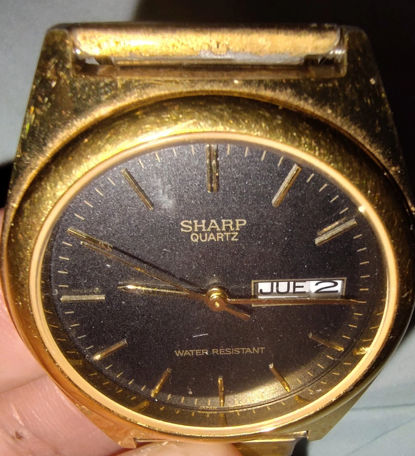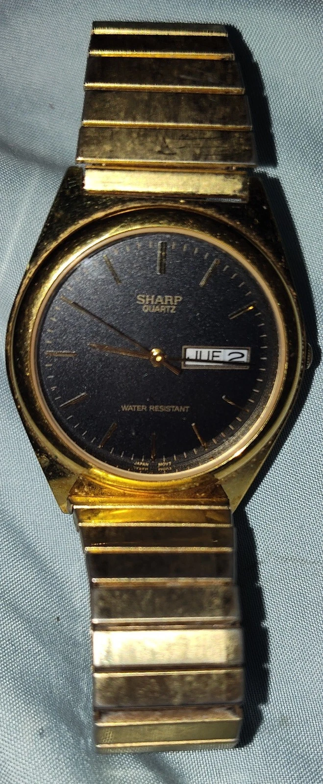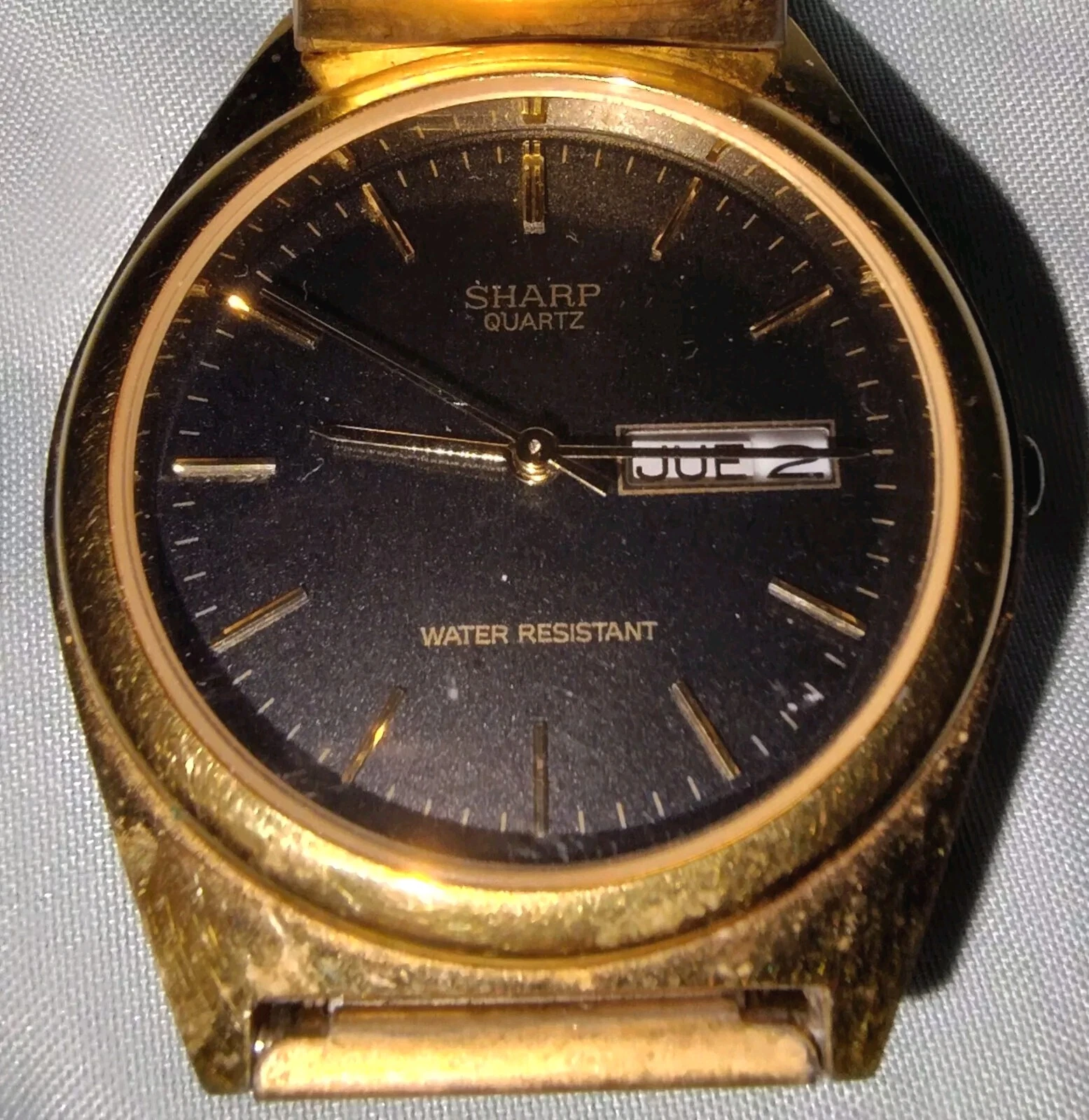 Sharp Men Watch Gold Stainless Steel Stretch WR Day Date Battery Black Quartz