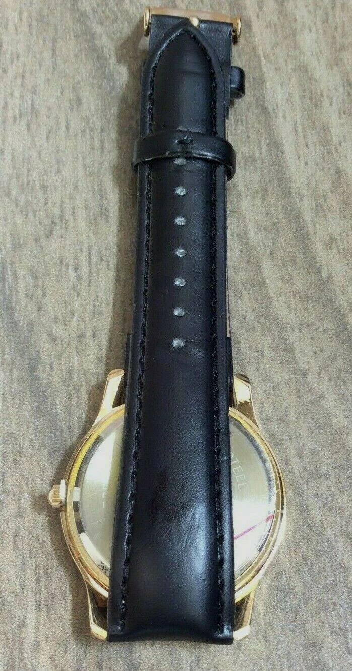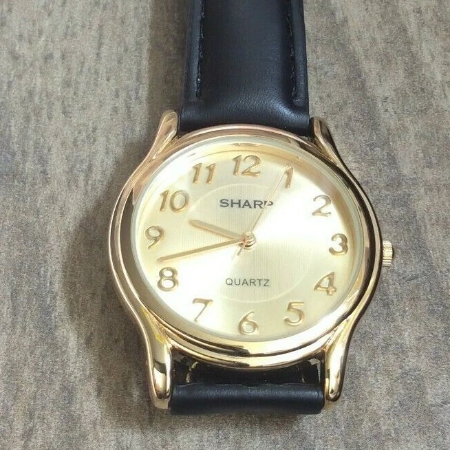 SHARP Watch Men's Round Gold Dial Arabic Hours on Black leather Band New Nice!