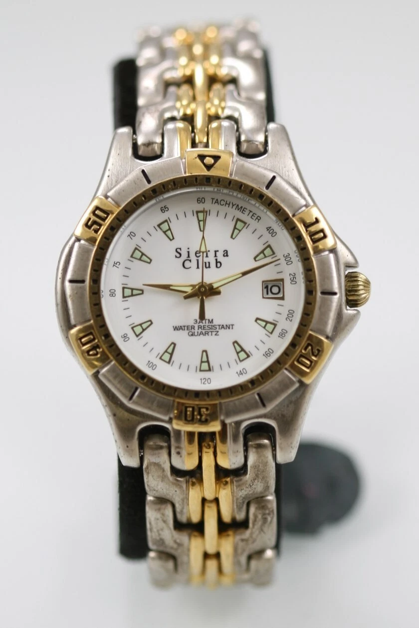 Sierra Club Men Watch Stainless Steel Silver Gold 30m Battery White Date Quartz
