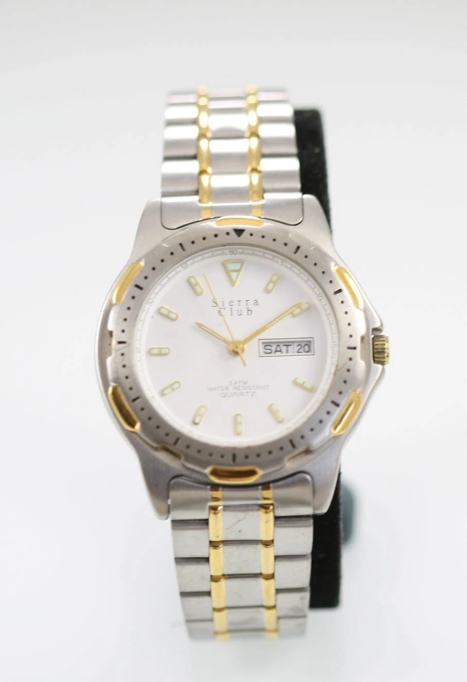 Sierra Club Men Watch Silver Gold Stainless Water Res Batt Day Date White Quartz