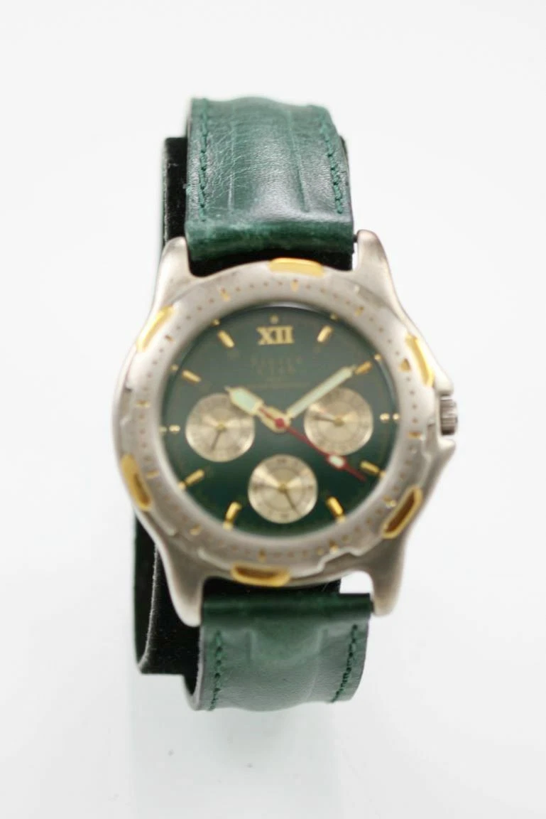 Sierra Club Men Watch Stainless Silver Gold Leather Green Day Date 24hr Quartz