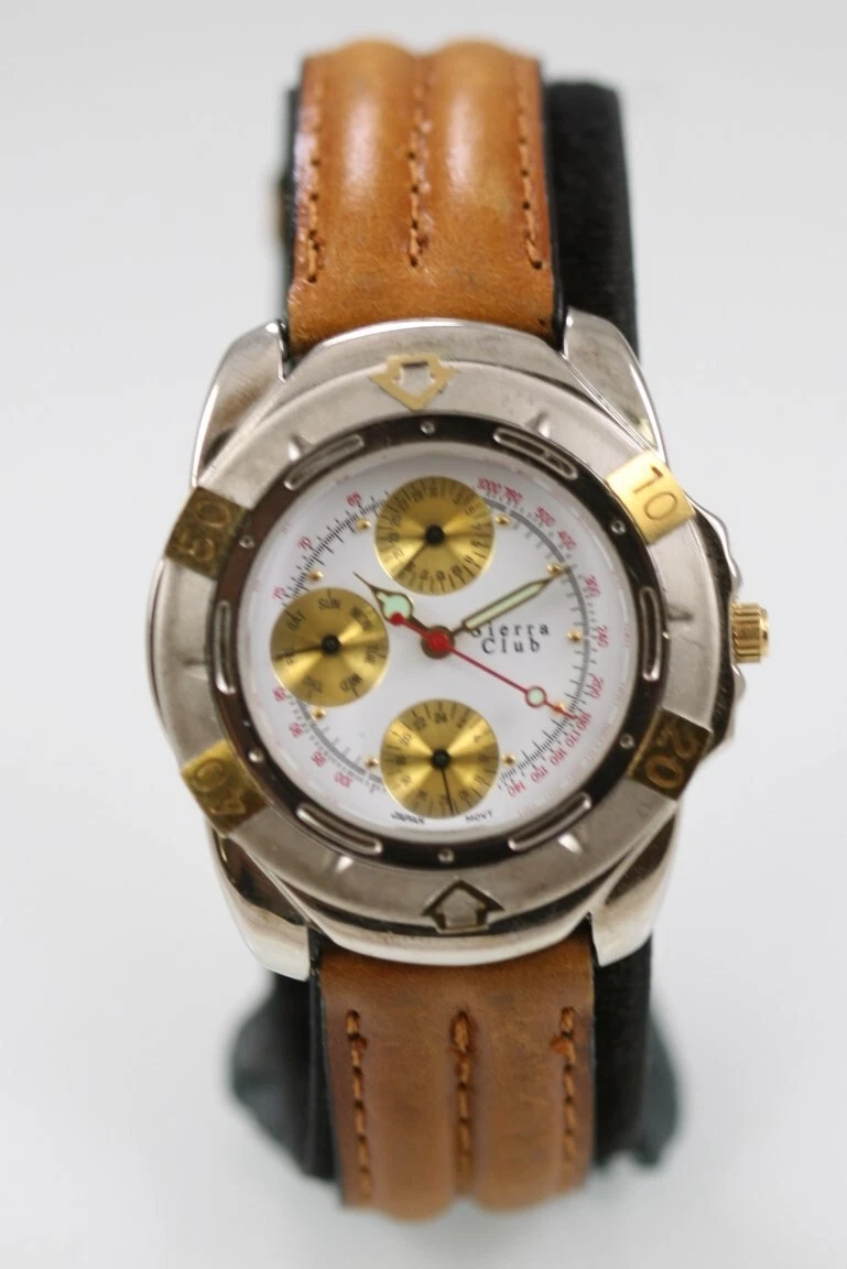 Sierra Club Watch Men Silver Gold Stainless Steel WR Brown Leather White Quartz
