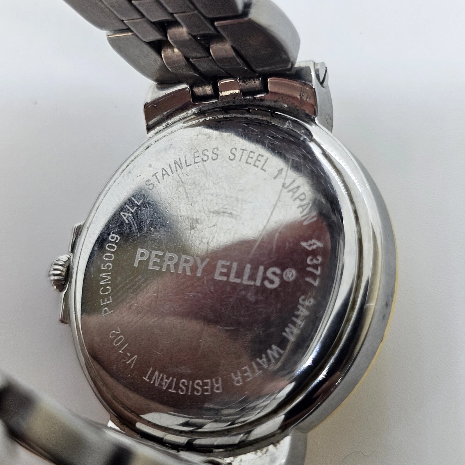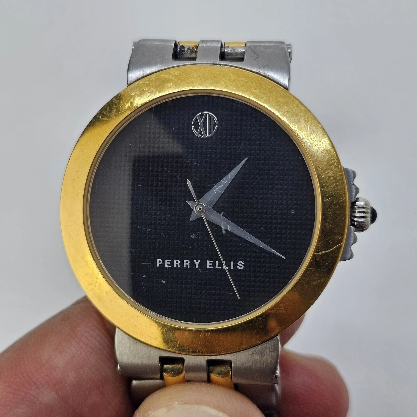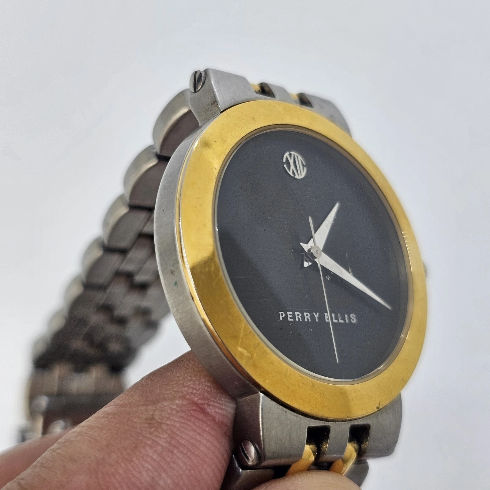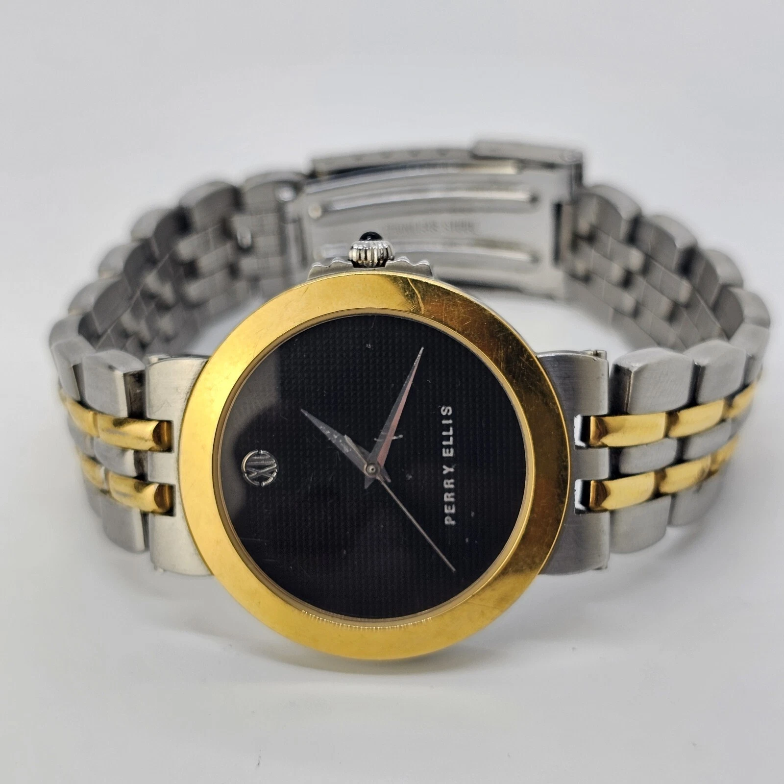 Perry Ellis Men’s Watch 36MM Black Dial Two Tone Bracelet 8" Wrist New Battery
