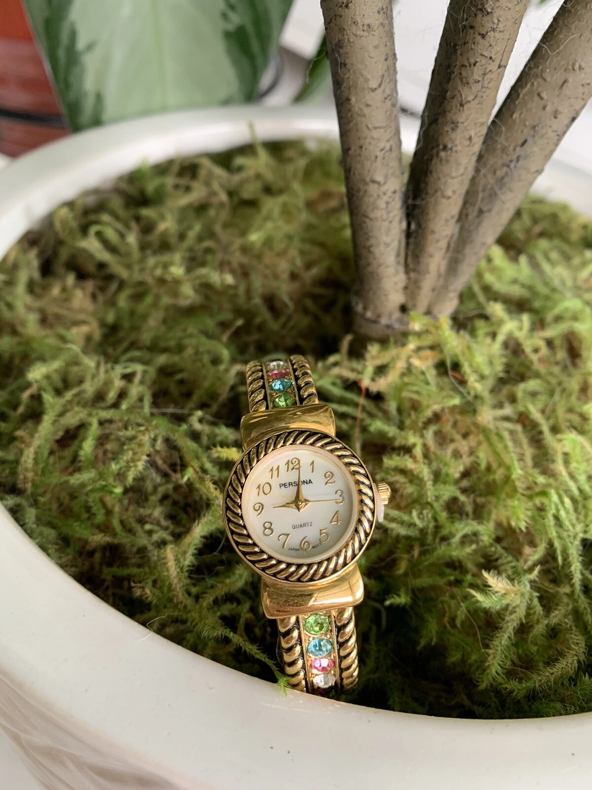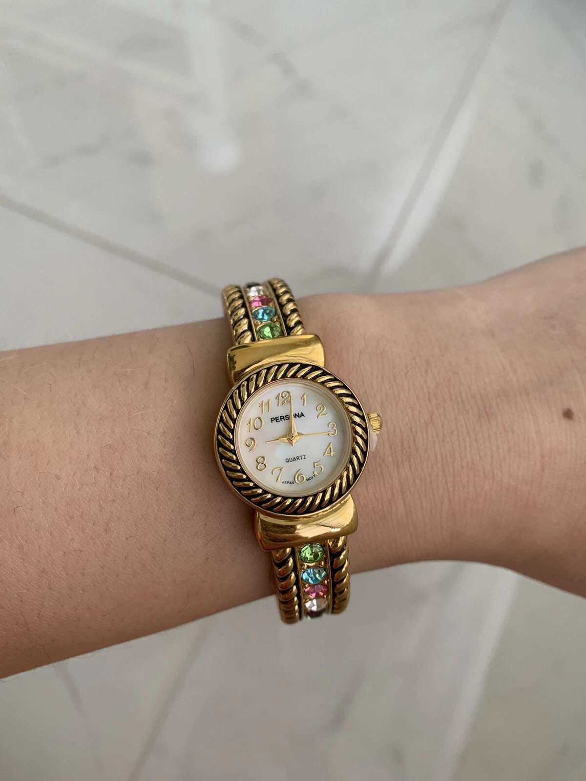 NEW Ladies Persona Gold Multicolor Stones Mother Of Pearl Dial Cuff Watch