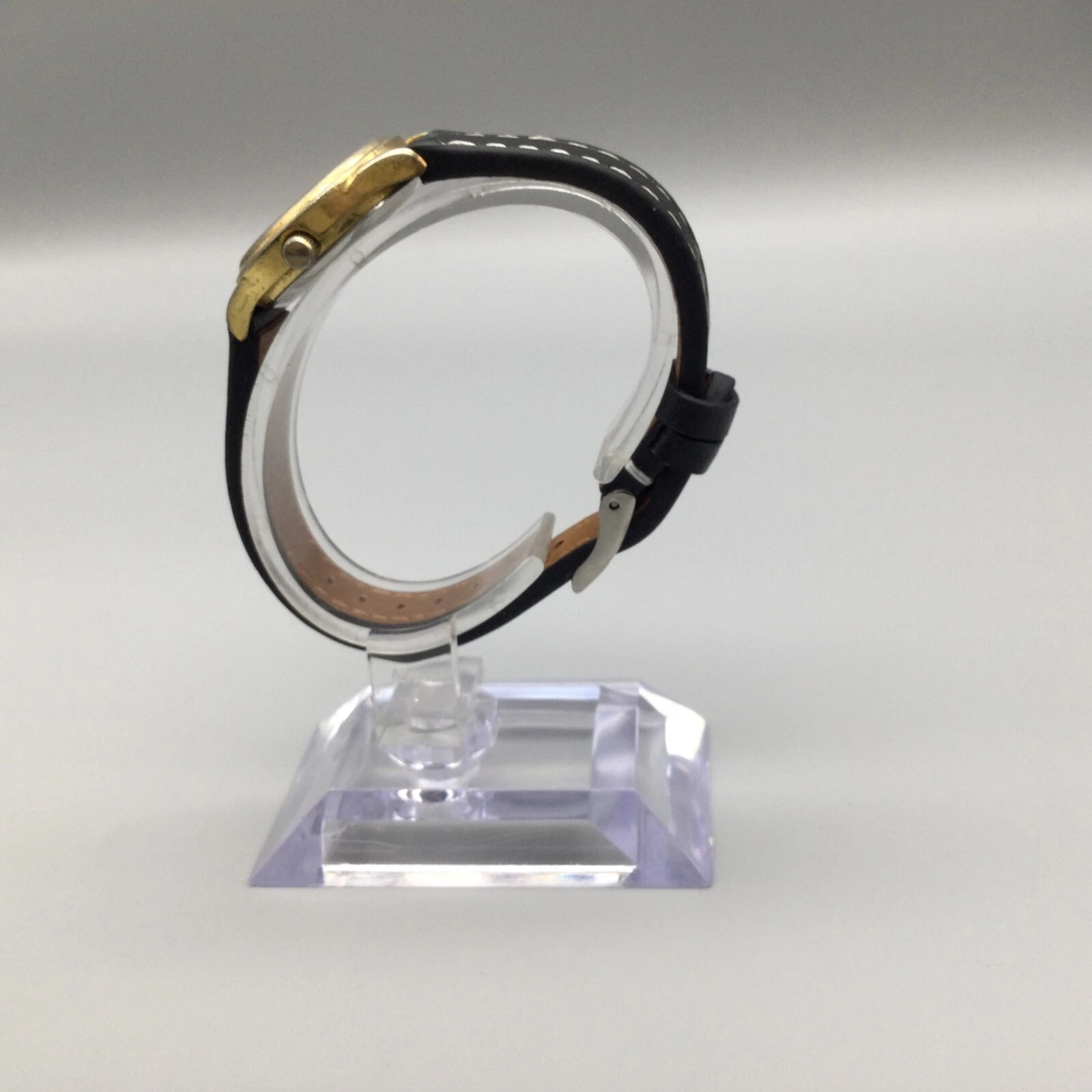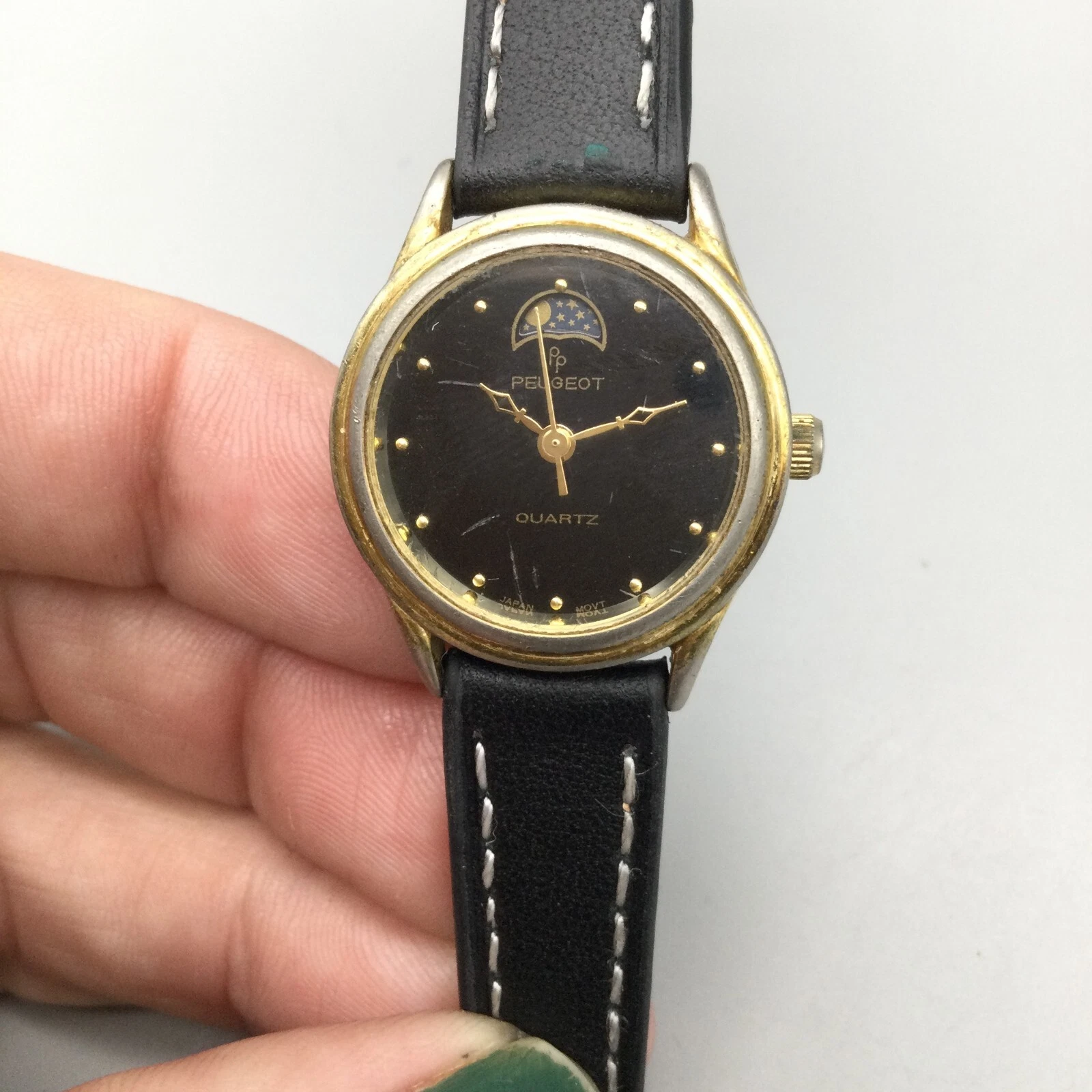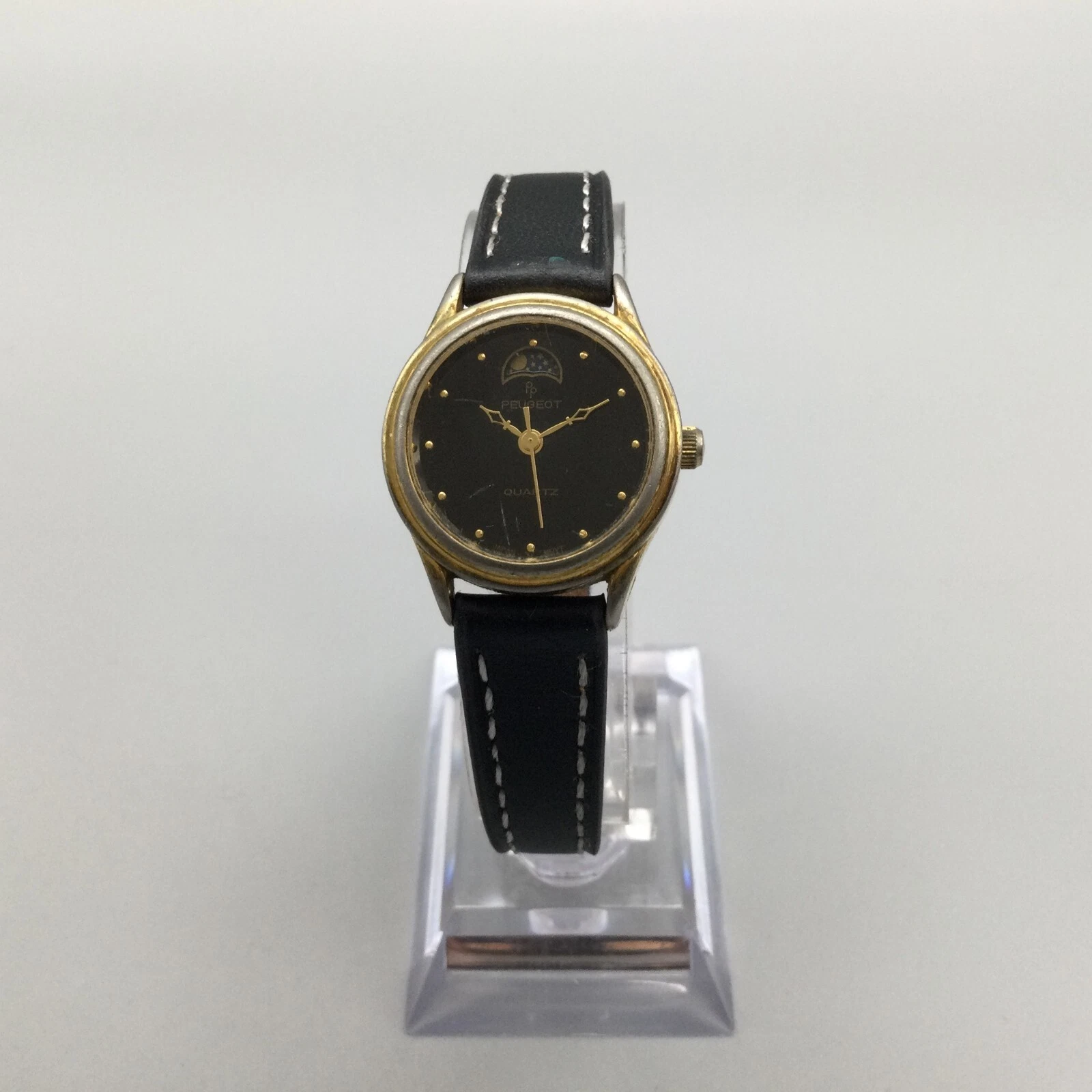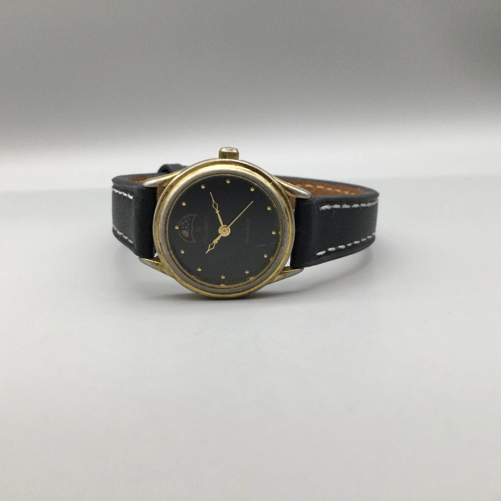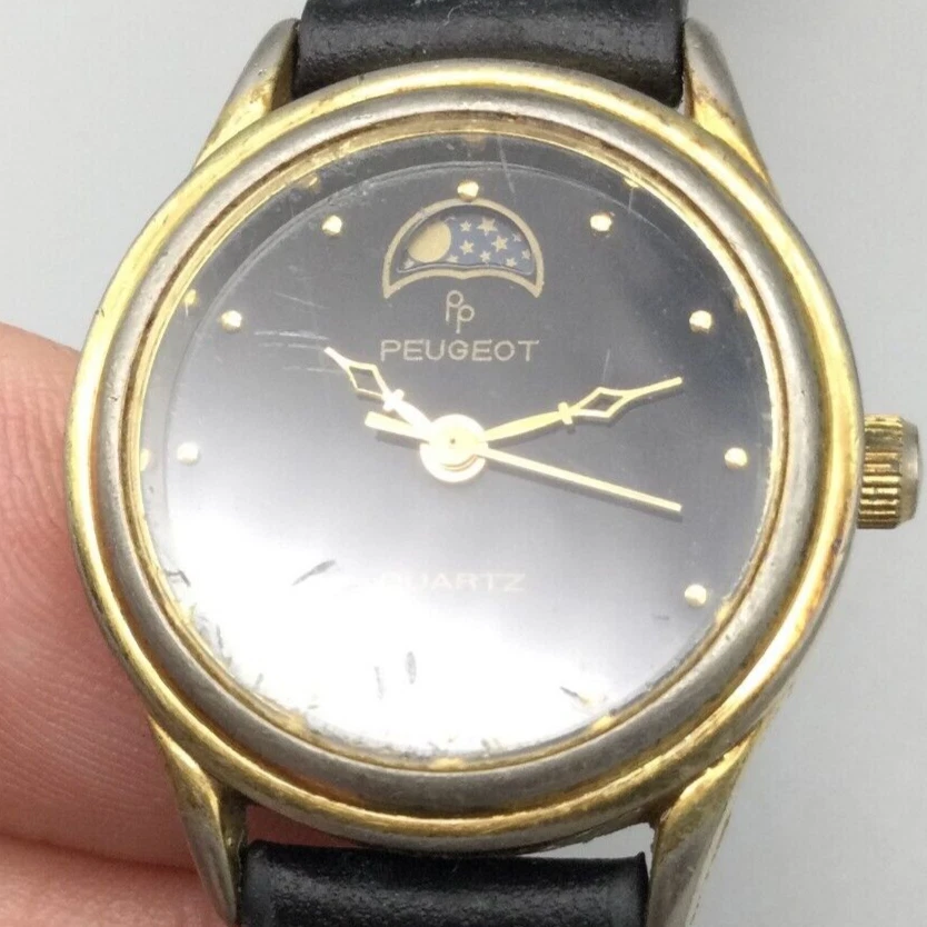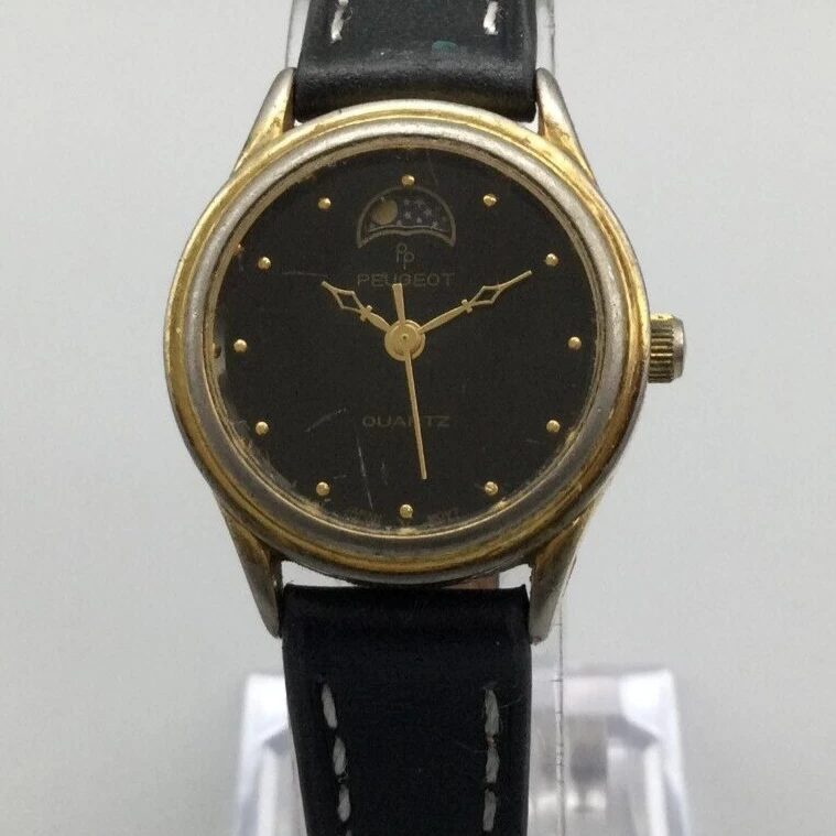 Vtg Peugeot Moon Phase Watch Women 24mm Gold Tone Black Dial Leather New Battery