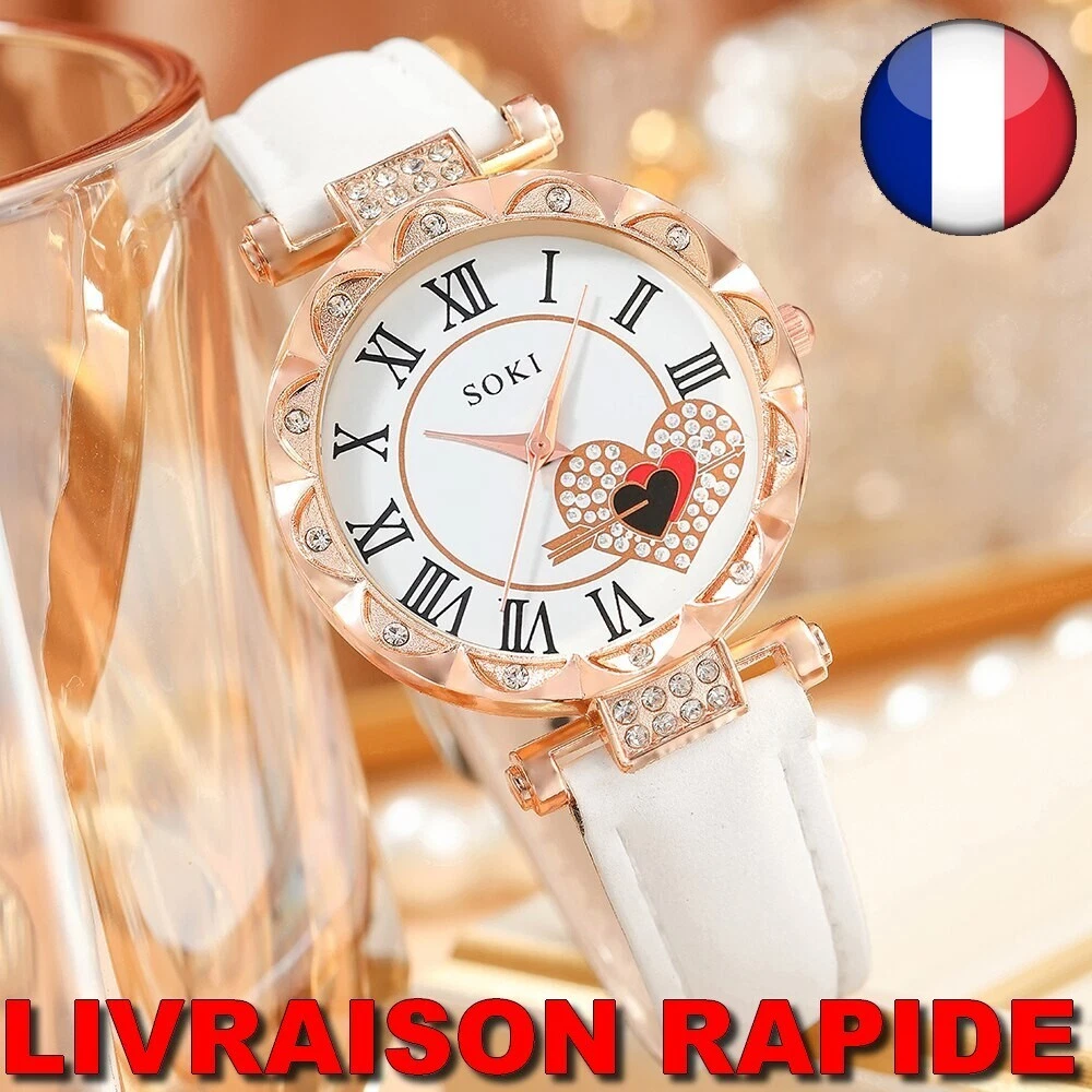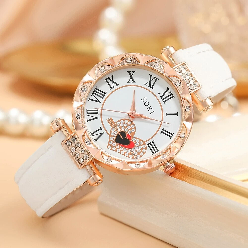 SOKI Quartz Heart Rhinestone Round White Leather Women's Watch Fashion Jewelr...