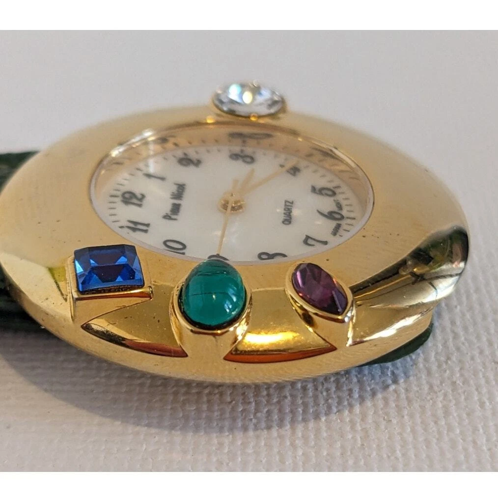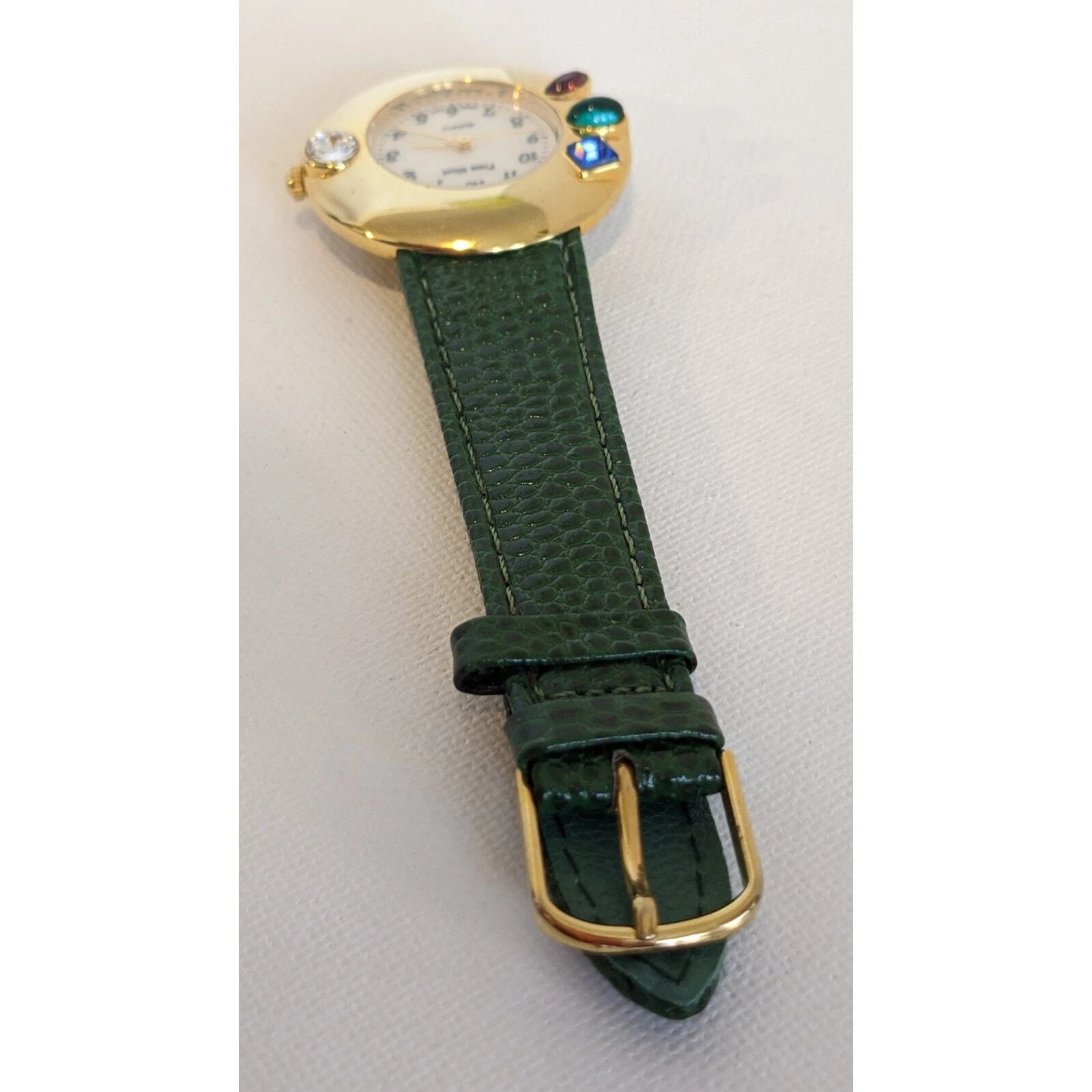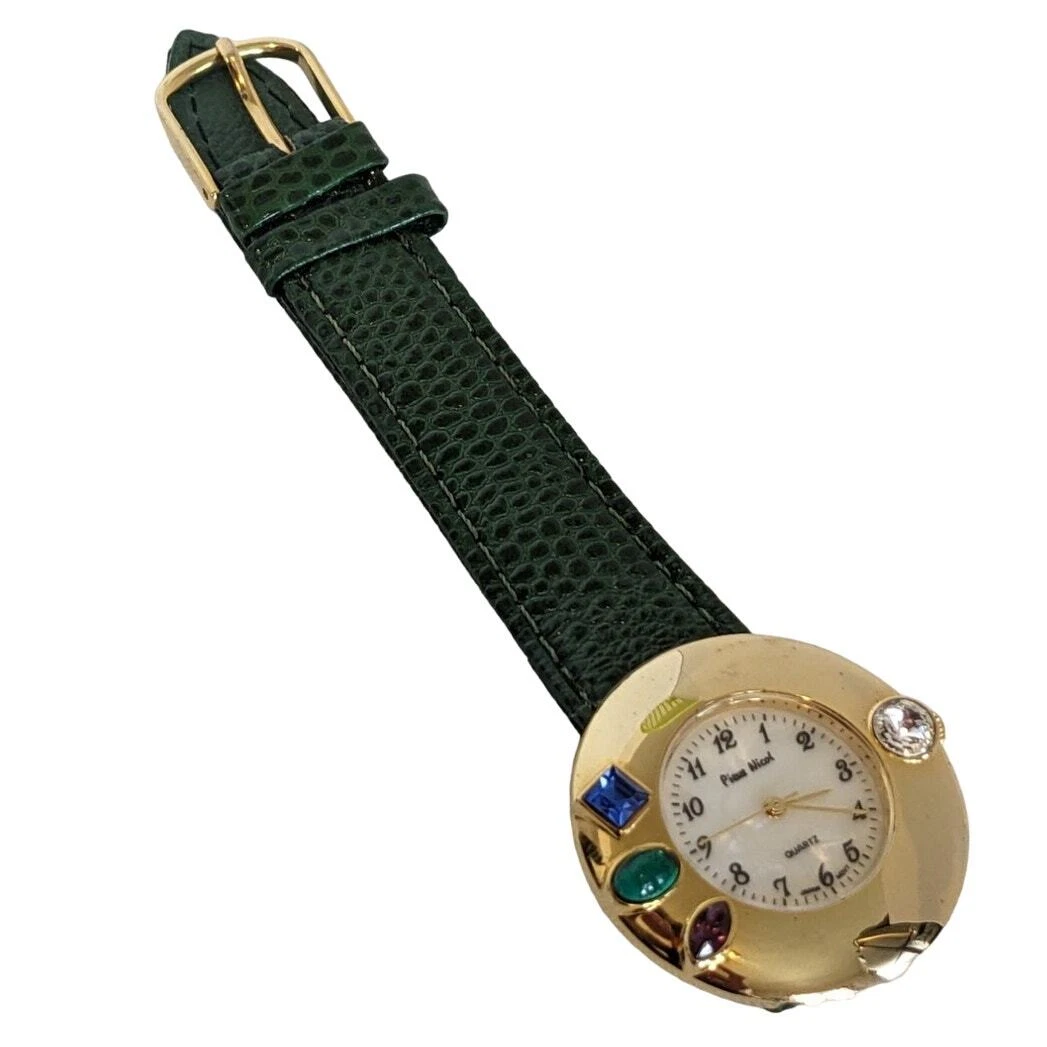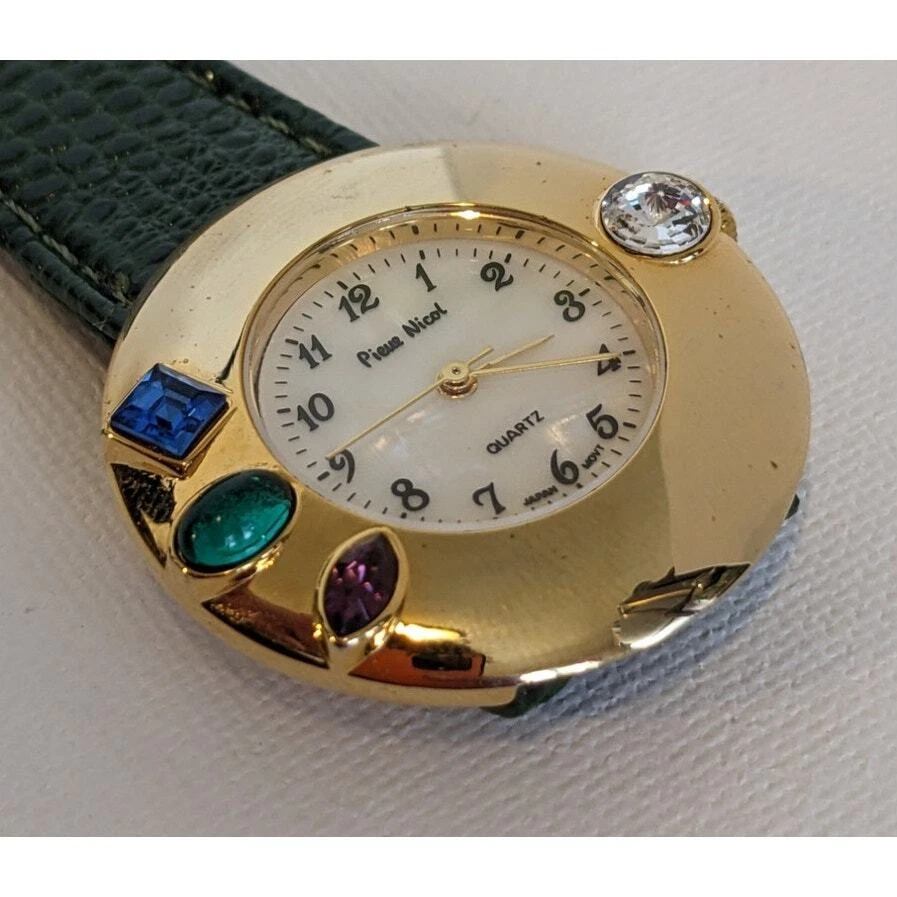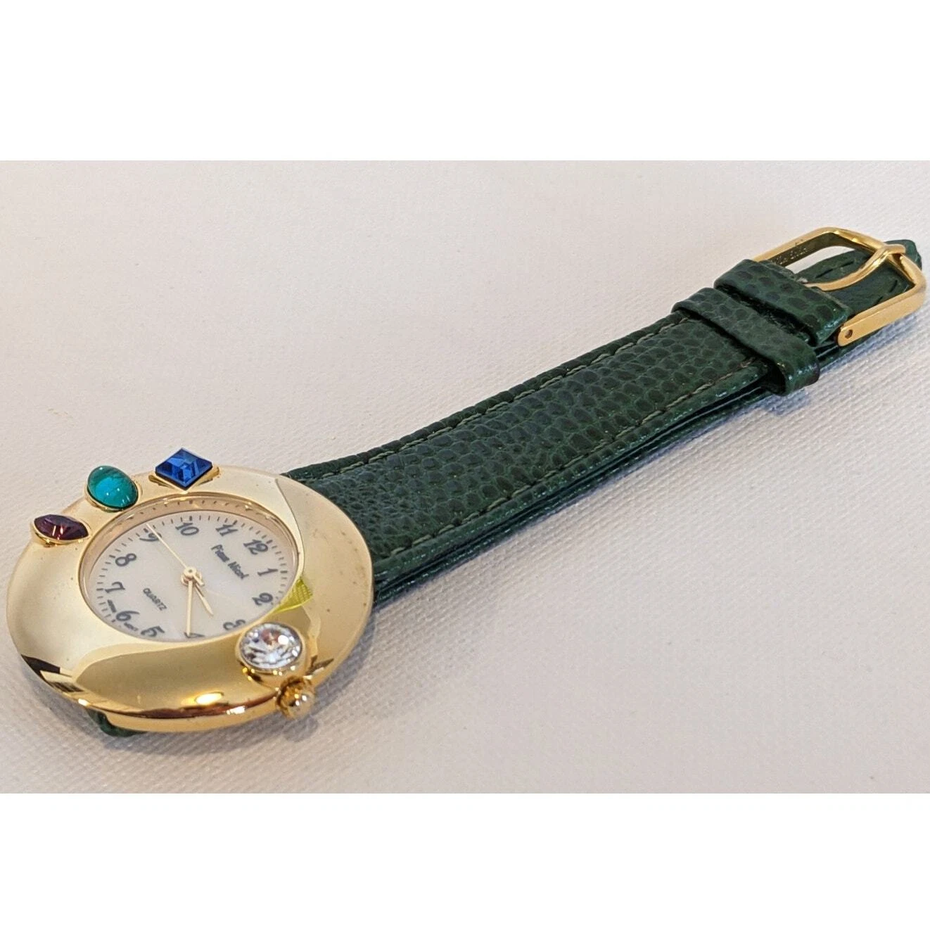Vintage Pierre Nicol Gem Inlaid Gold Tone Ladies Watch w/ Forest Green Band