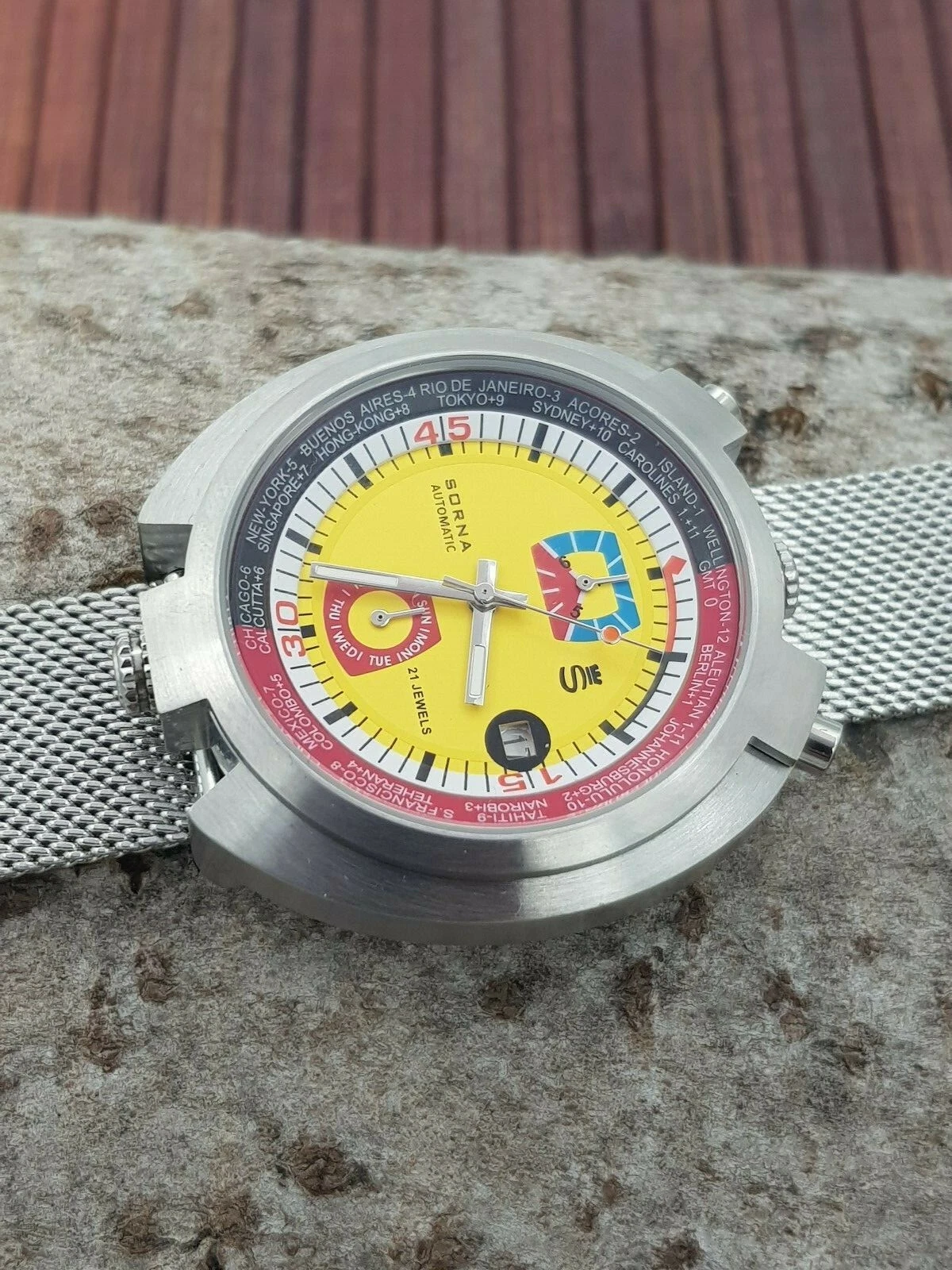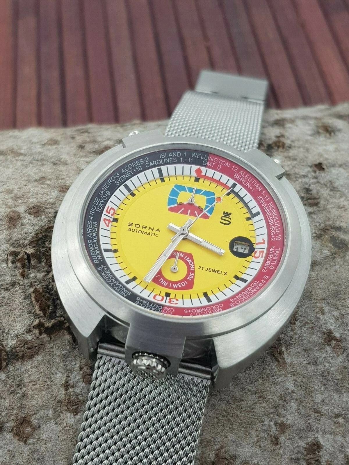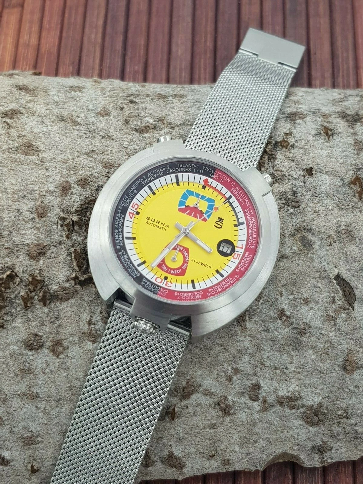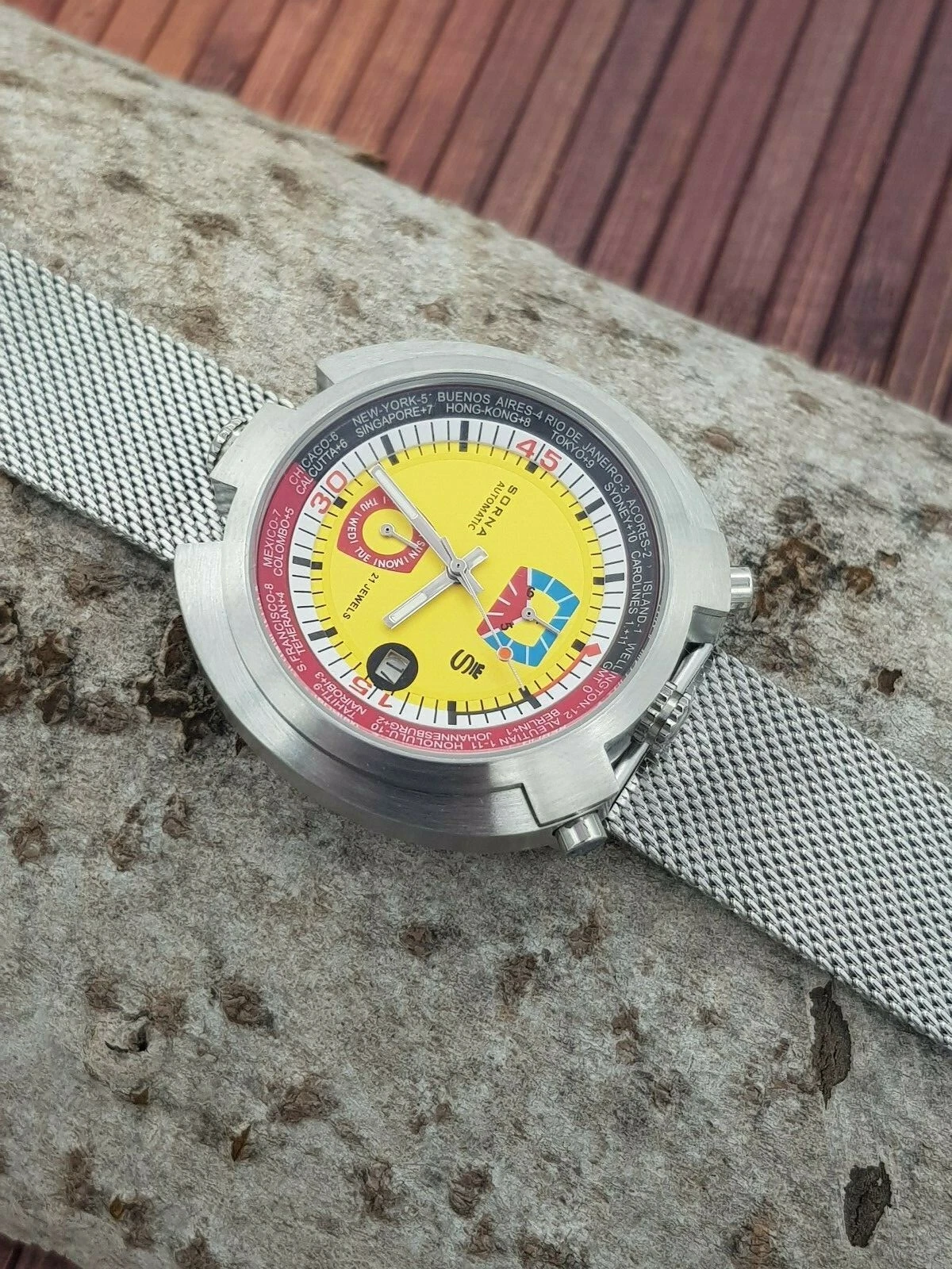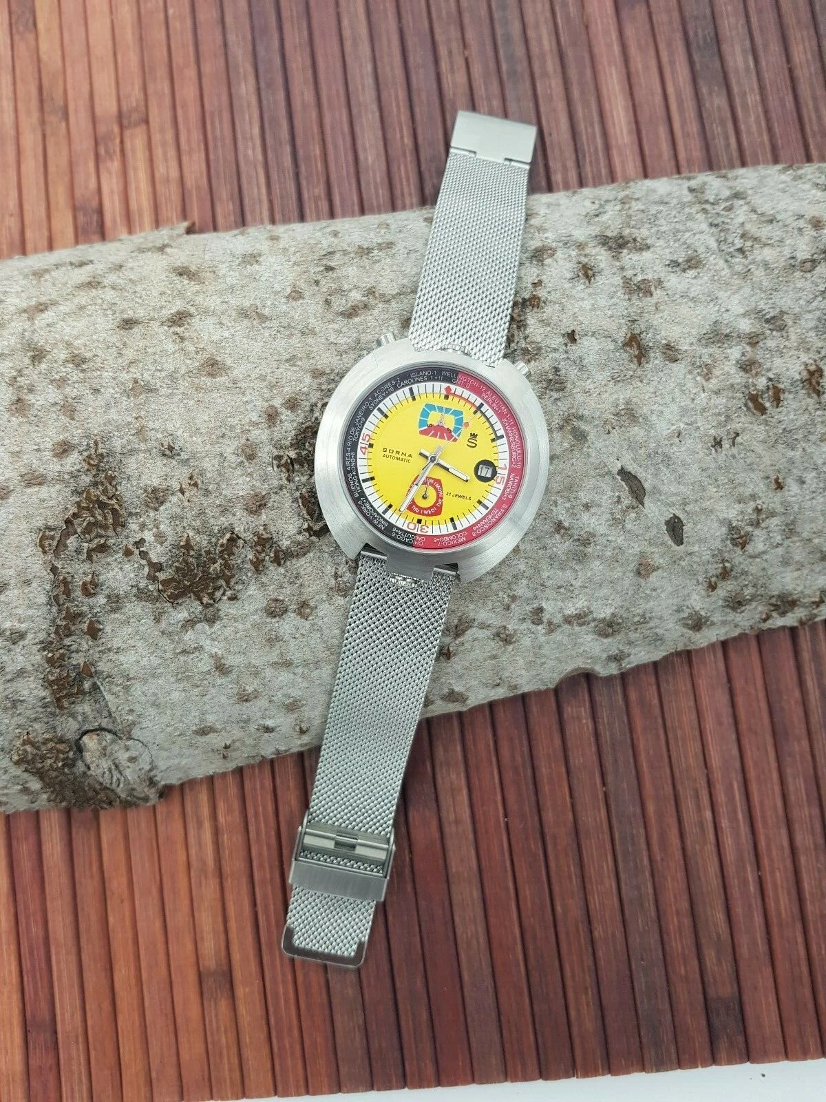 Sorna Bullhead NOS-Style automatic watch yellow version new unworn mesh band