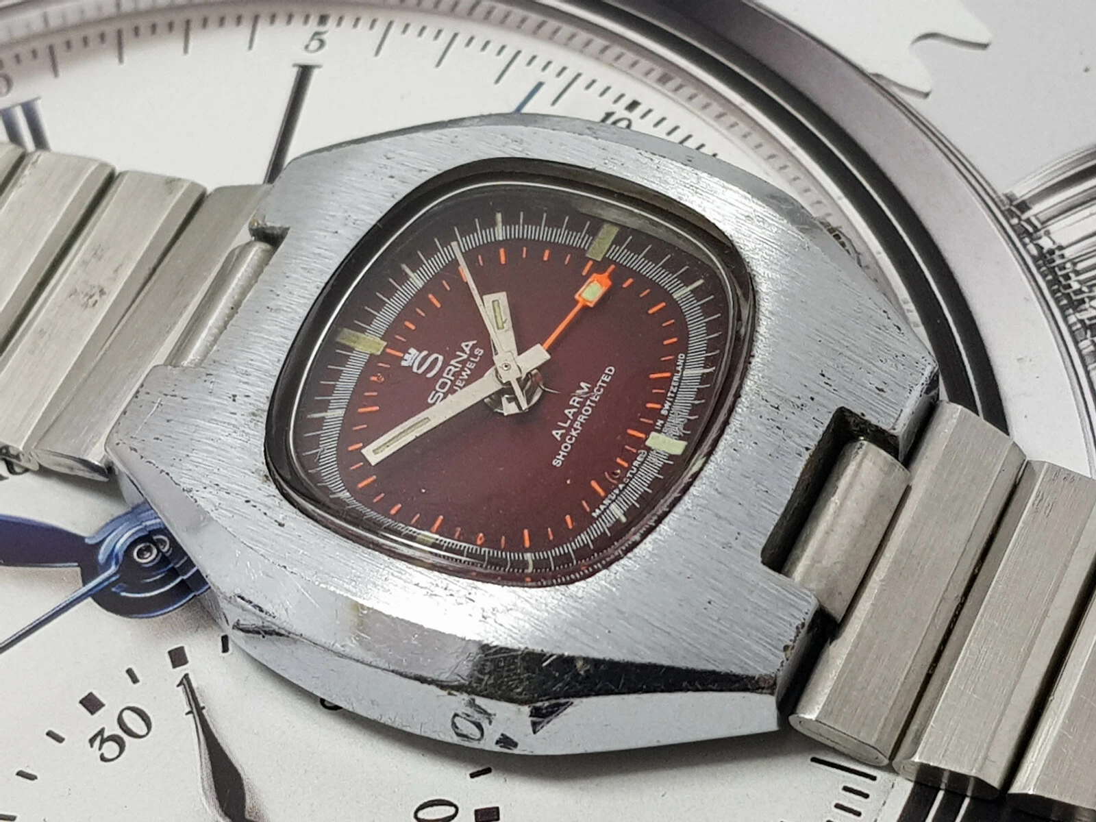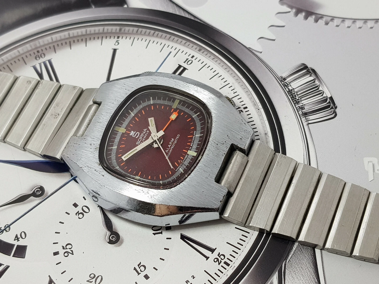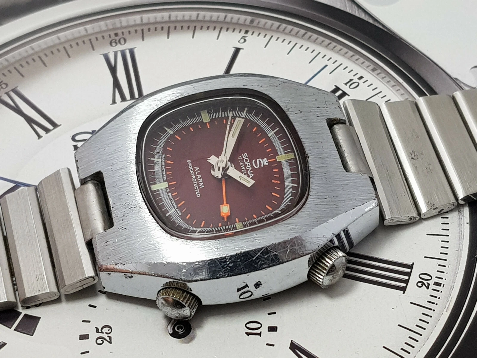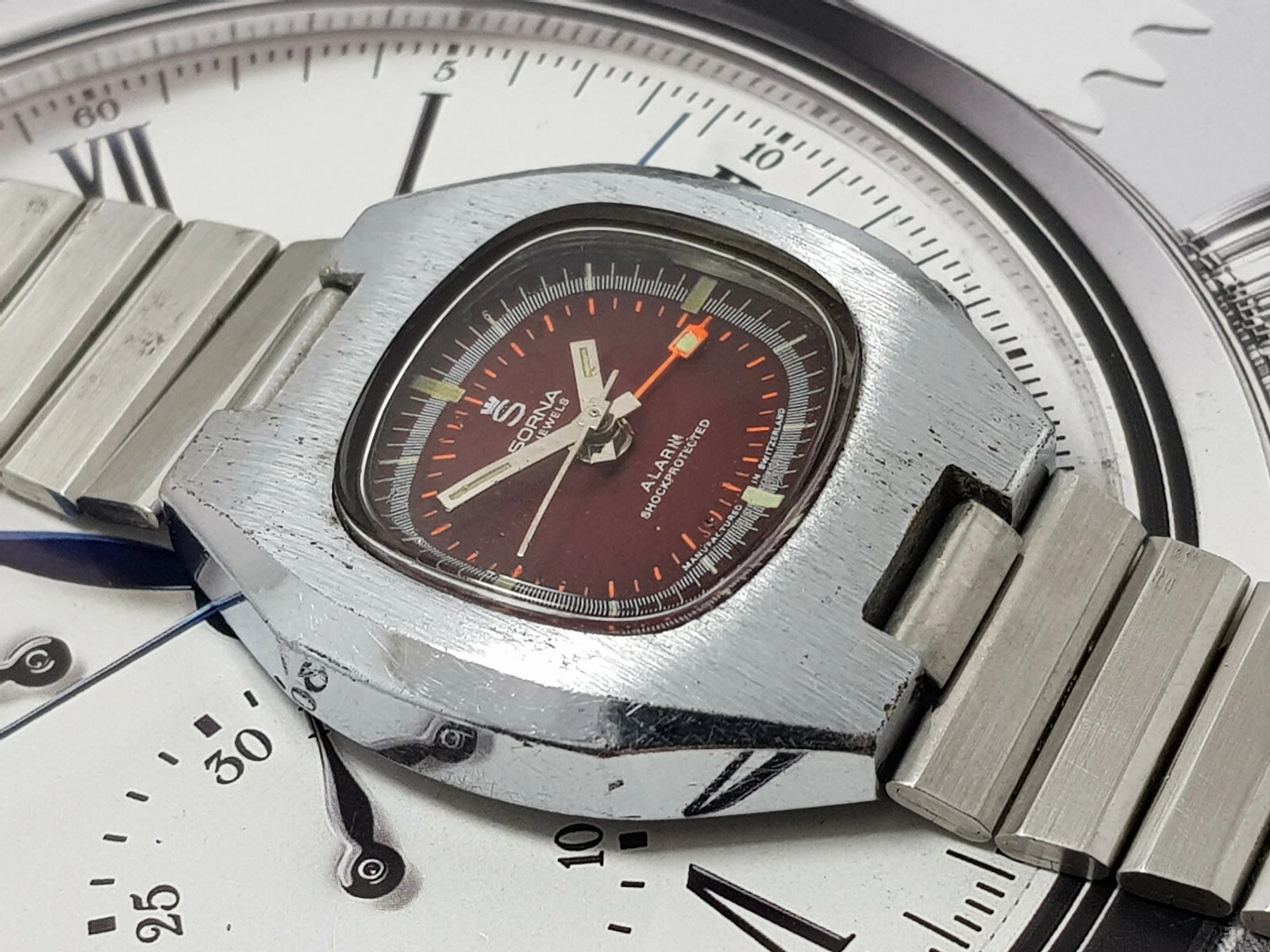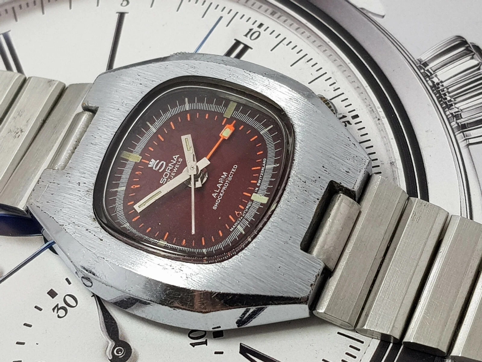 NICE & RARE VINTAGE SORNA ALARM WIND UP GENTS RED DIAL 3.