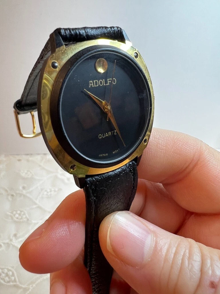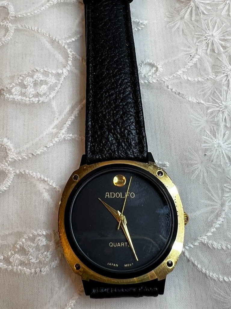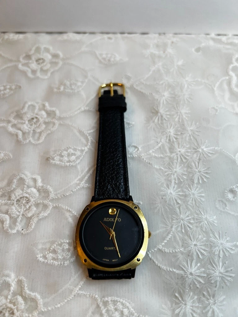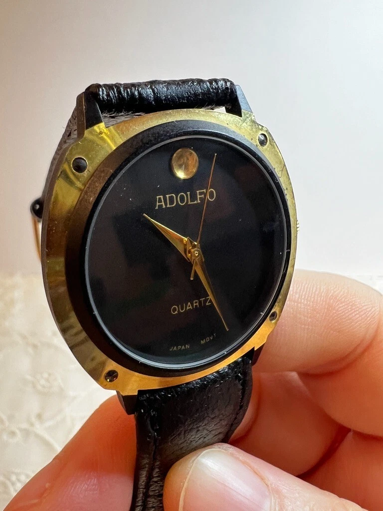 Vintage Adolfo Quartz Watch Mens Gold Case Black Dial and Leather Band U
