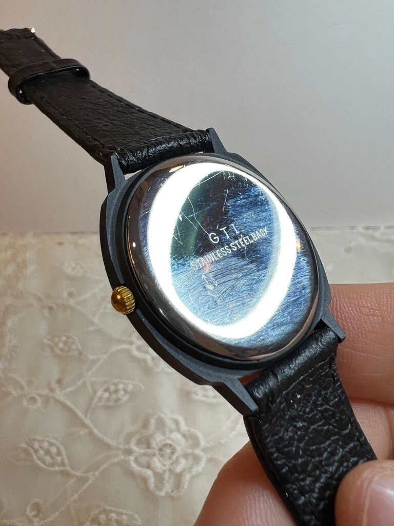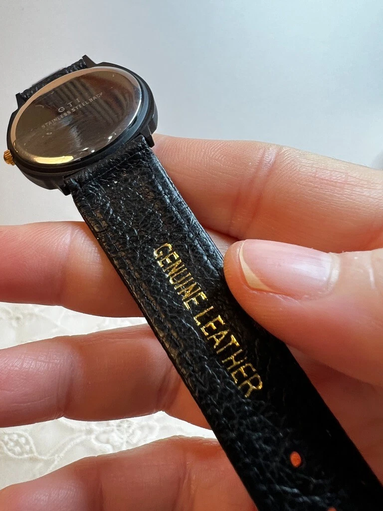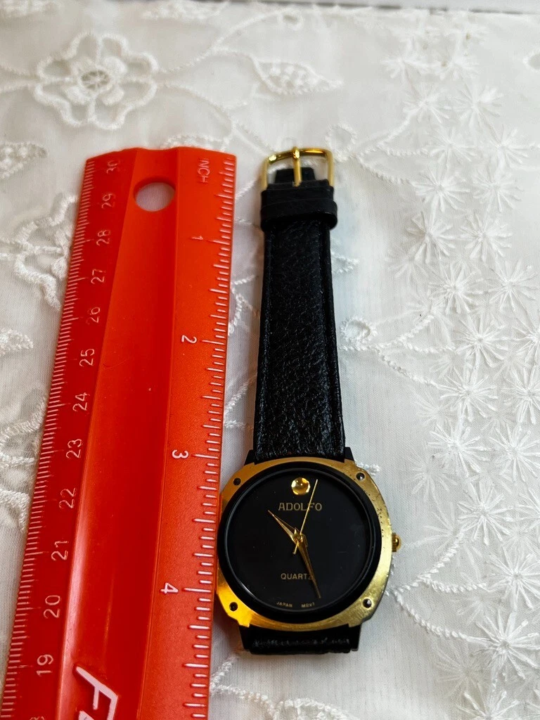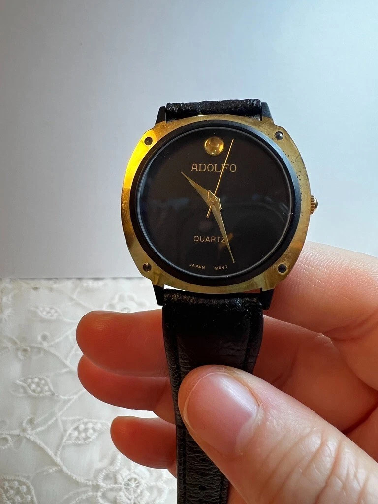 Vintage Adolfo Quartz Watch Mens Gold Case Black Dial and Leather Band U
