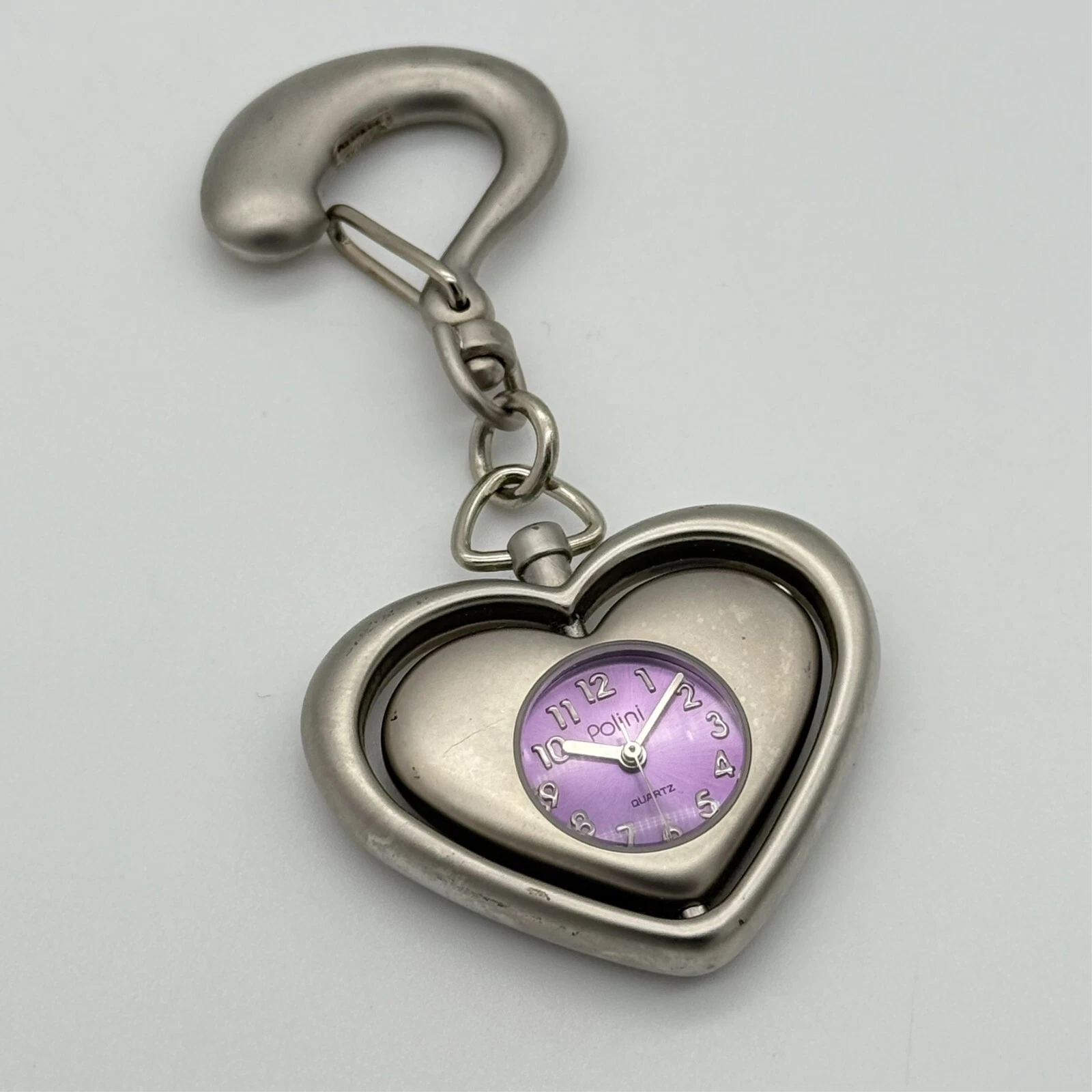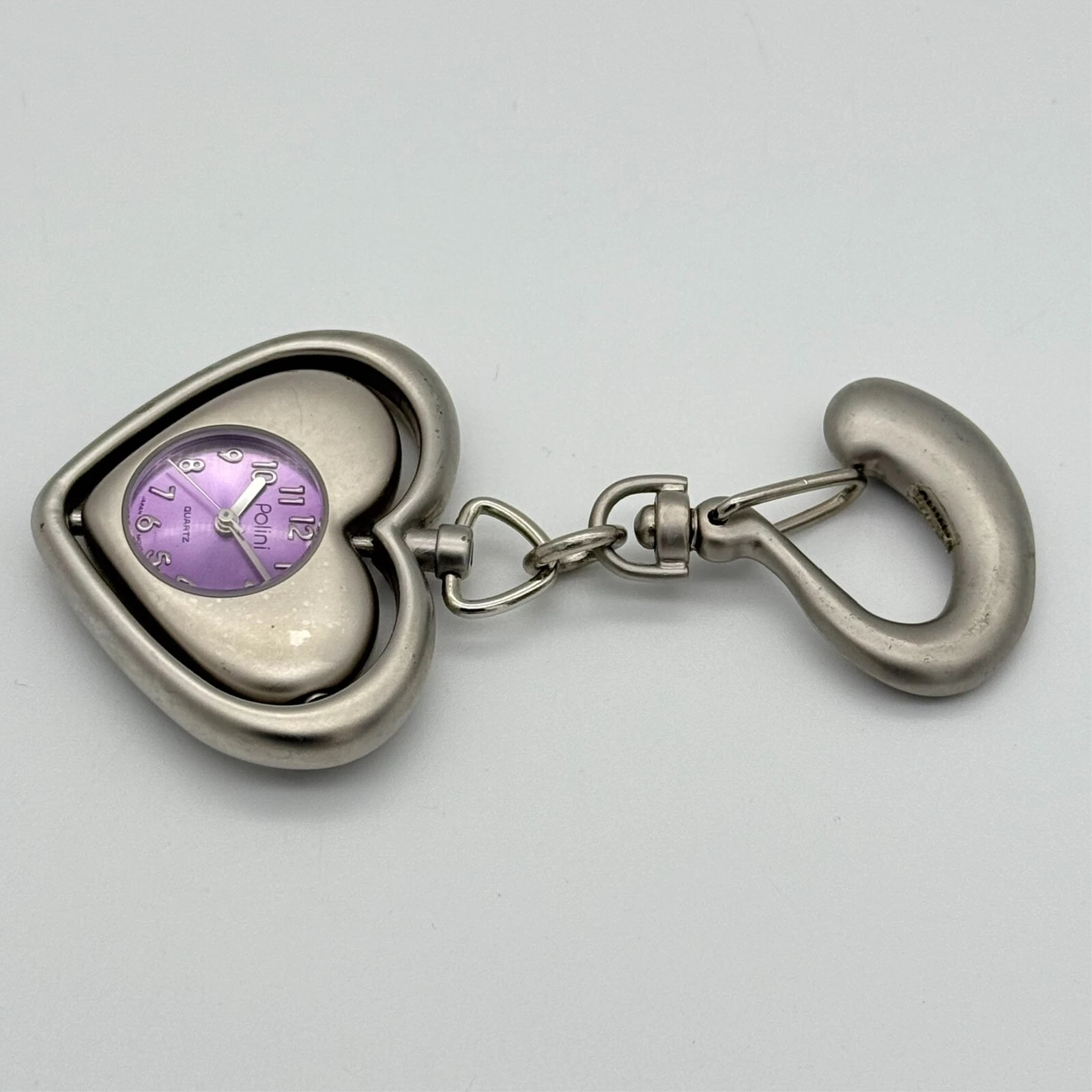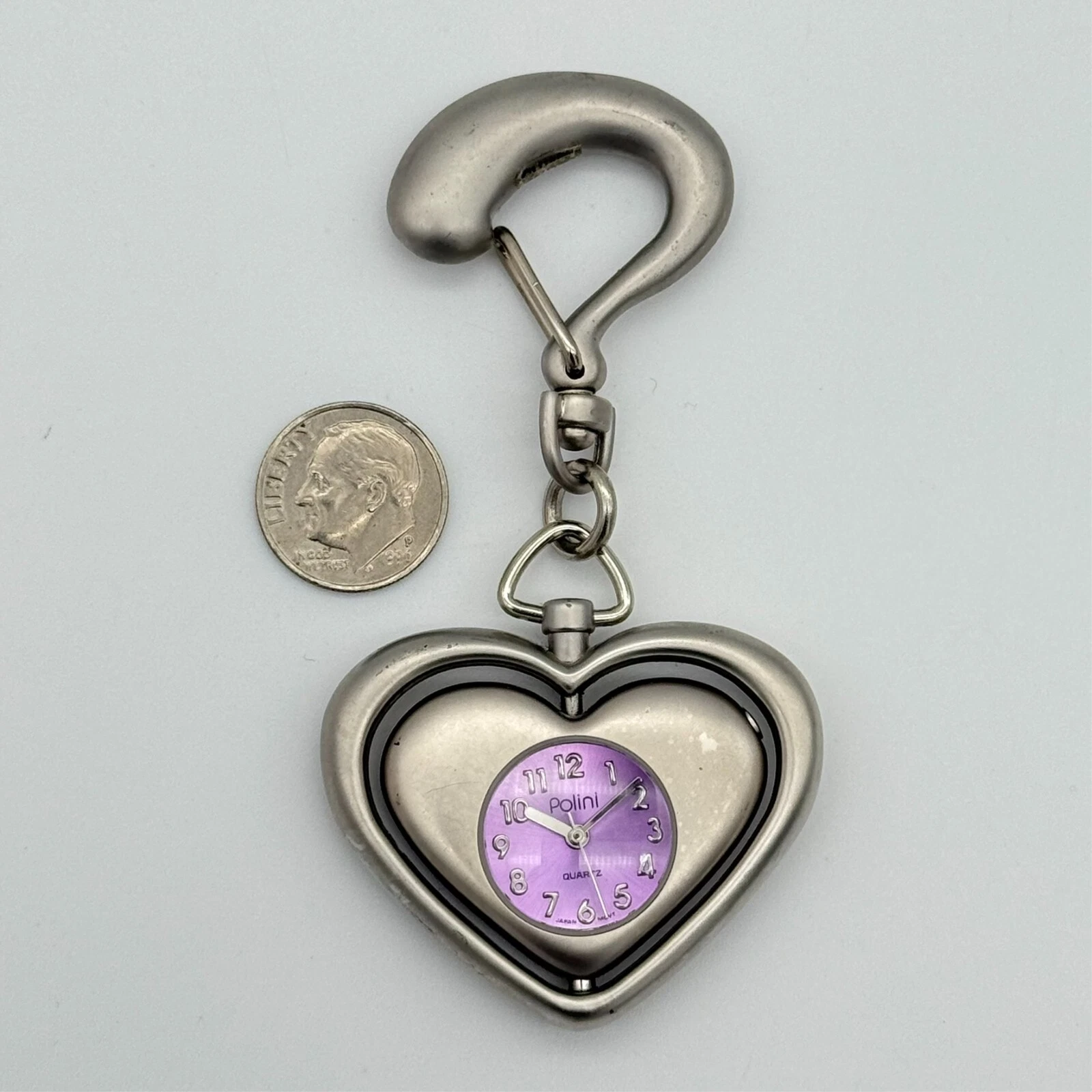 Women's POLINI Matte Silver Tone Heart Shaped Keychain Watch, Purple Dial, Runs