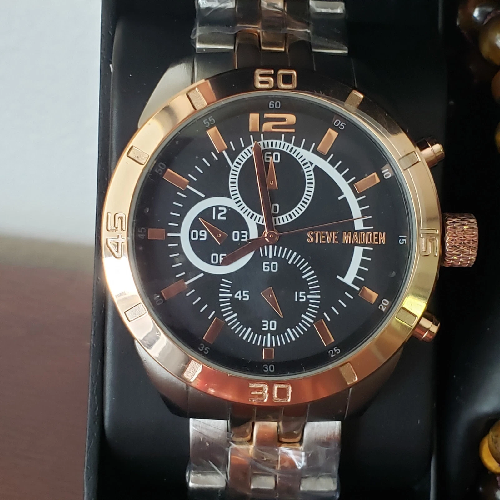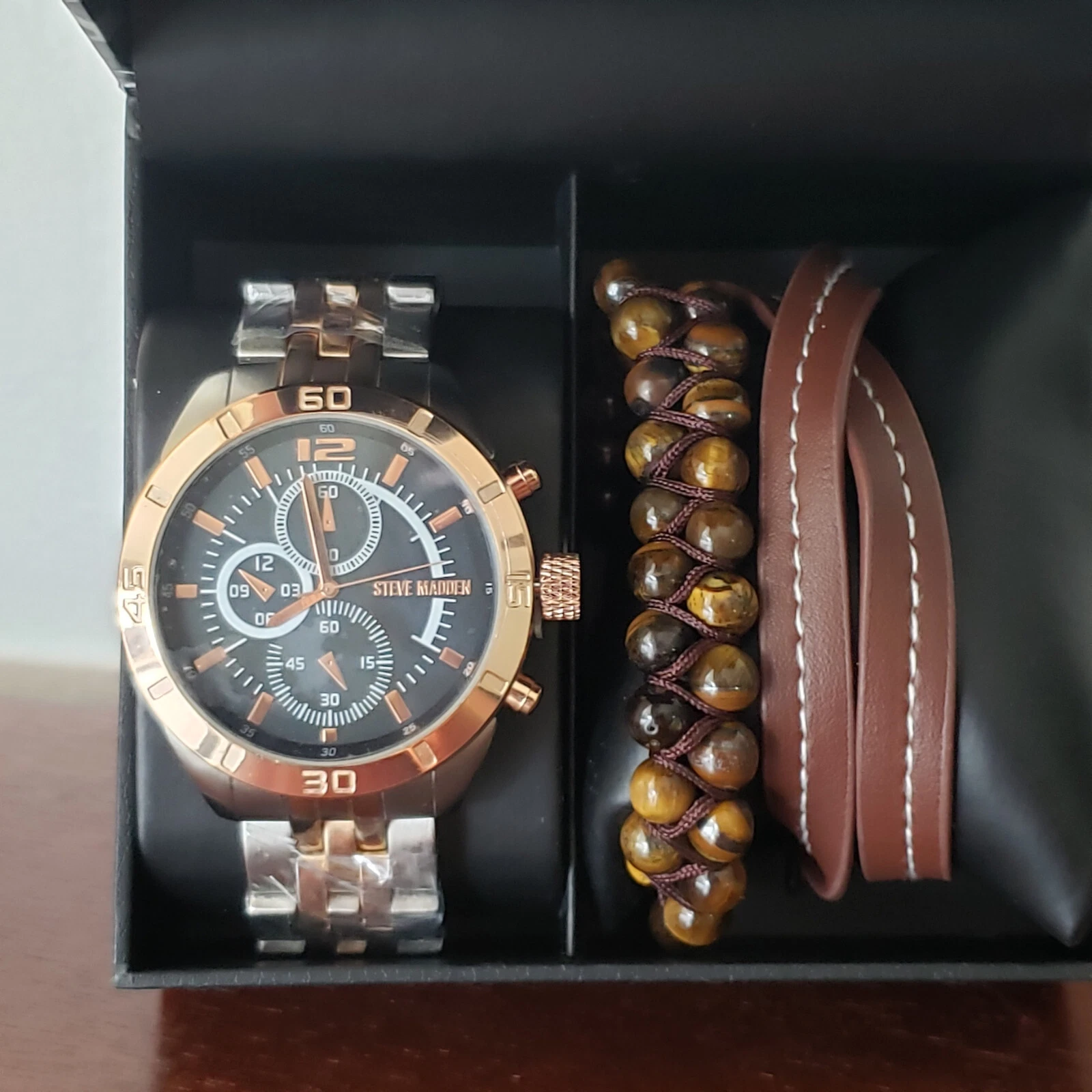 Steve Madden Men's Two Tone Watch &Beaded/Wrap Bracelet Gift Set NIB